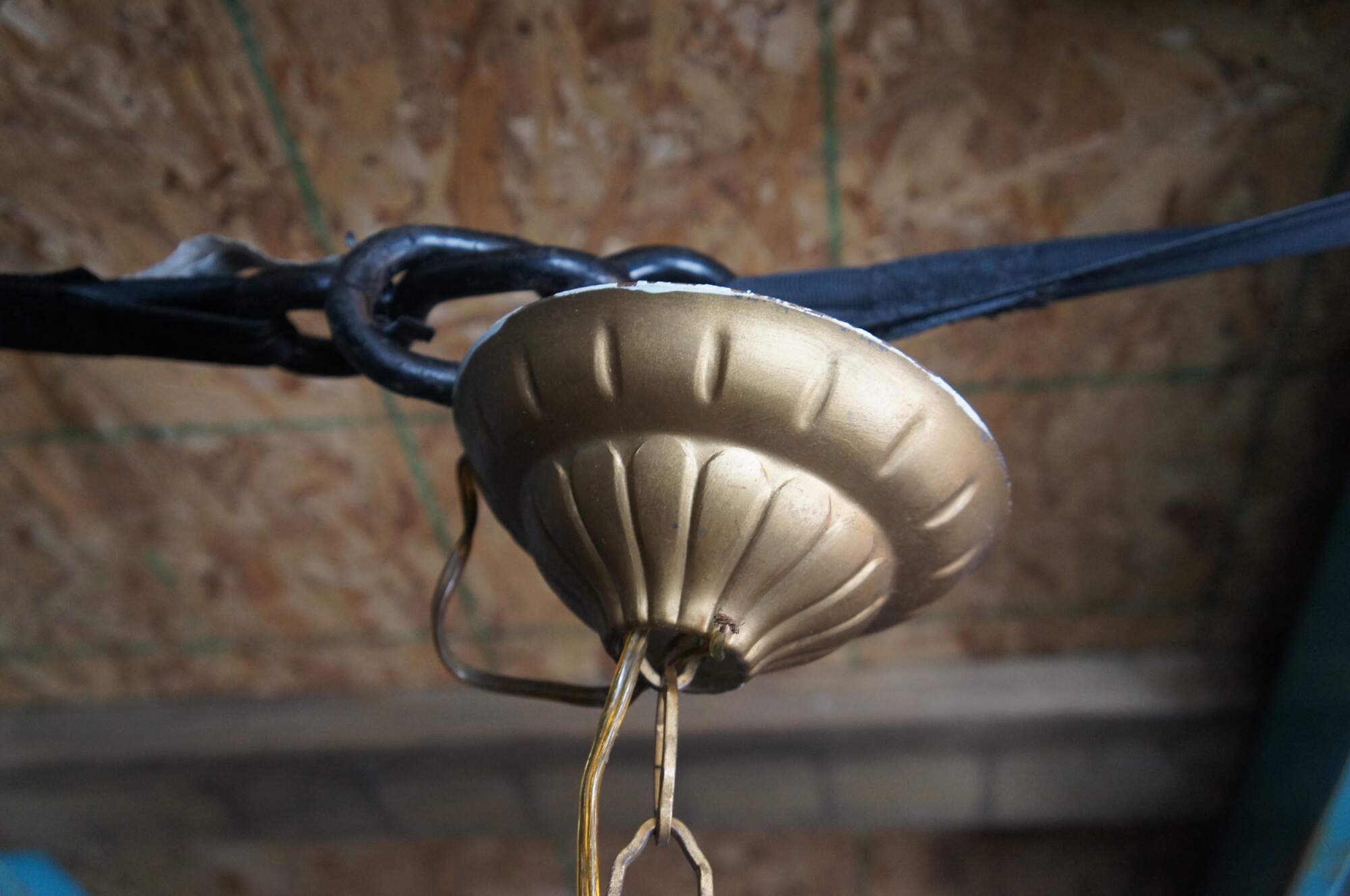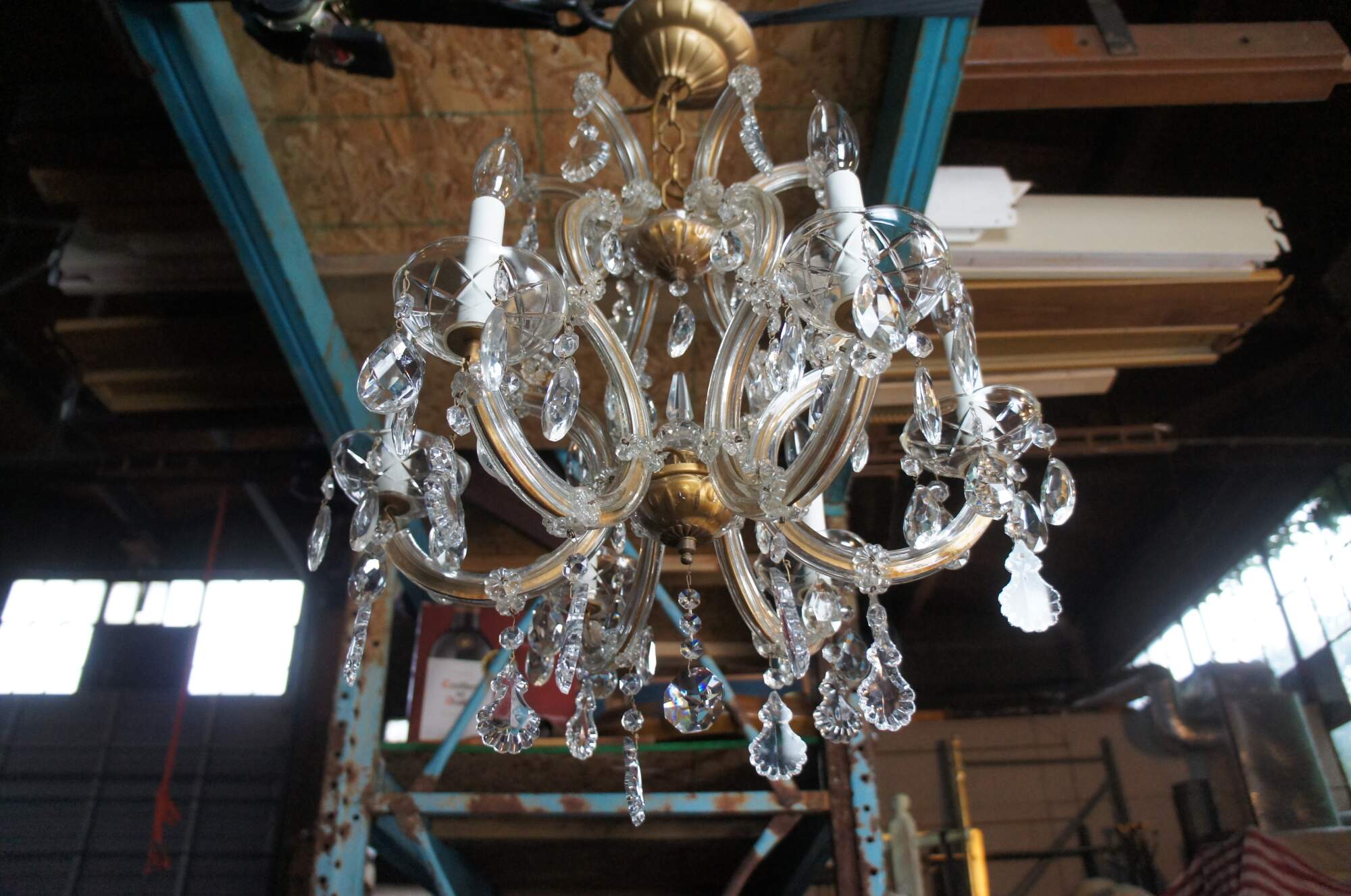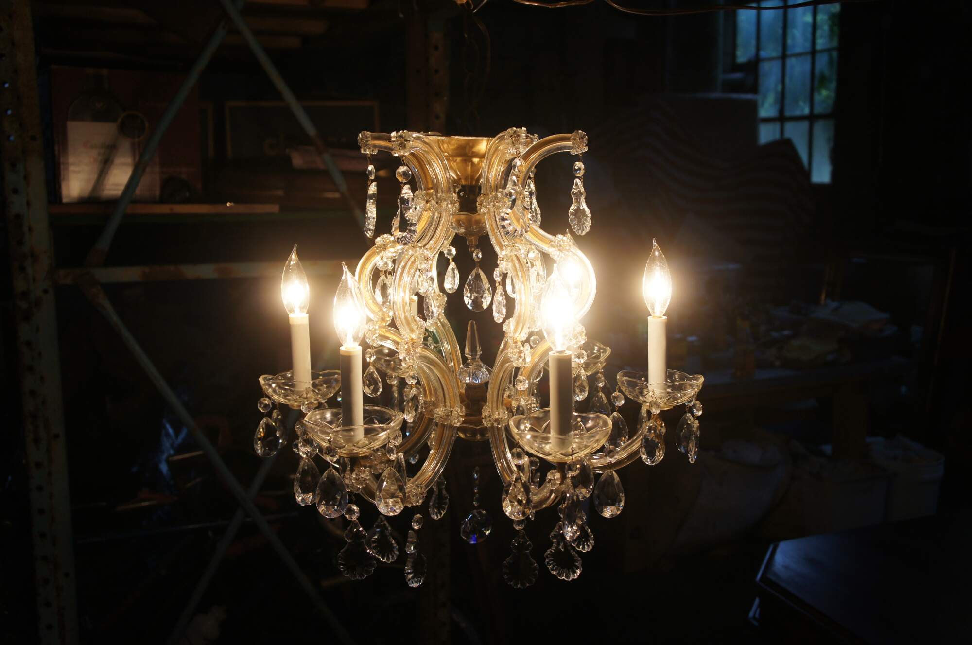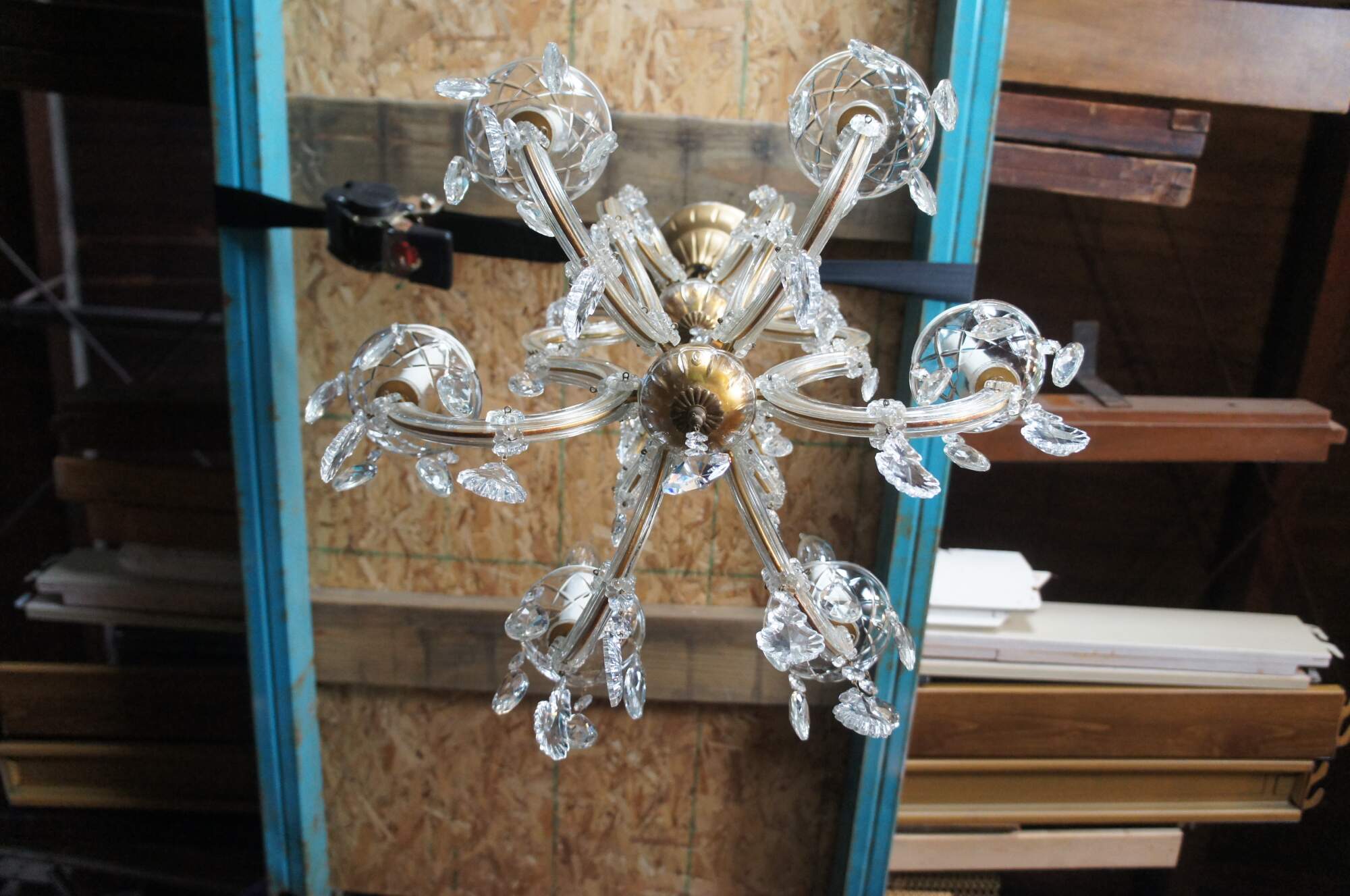 Vintage French Marie Therese glass clad brass drop crystal six arm chandelier featuring serpentine form with candlestick lights.