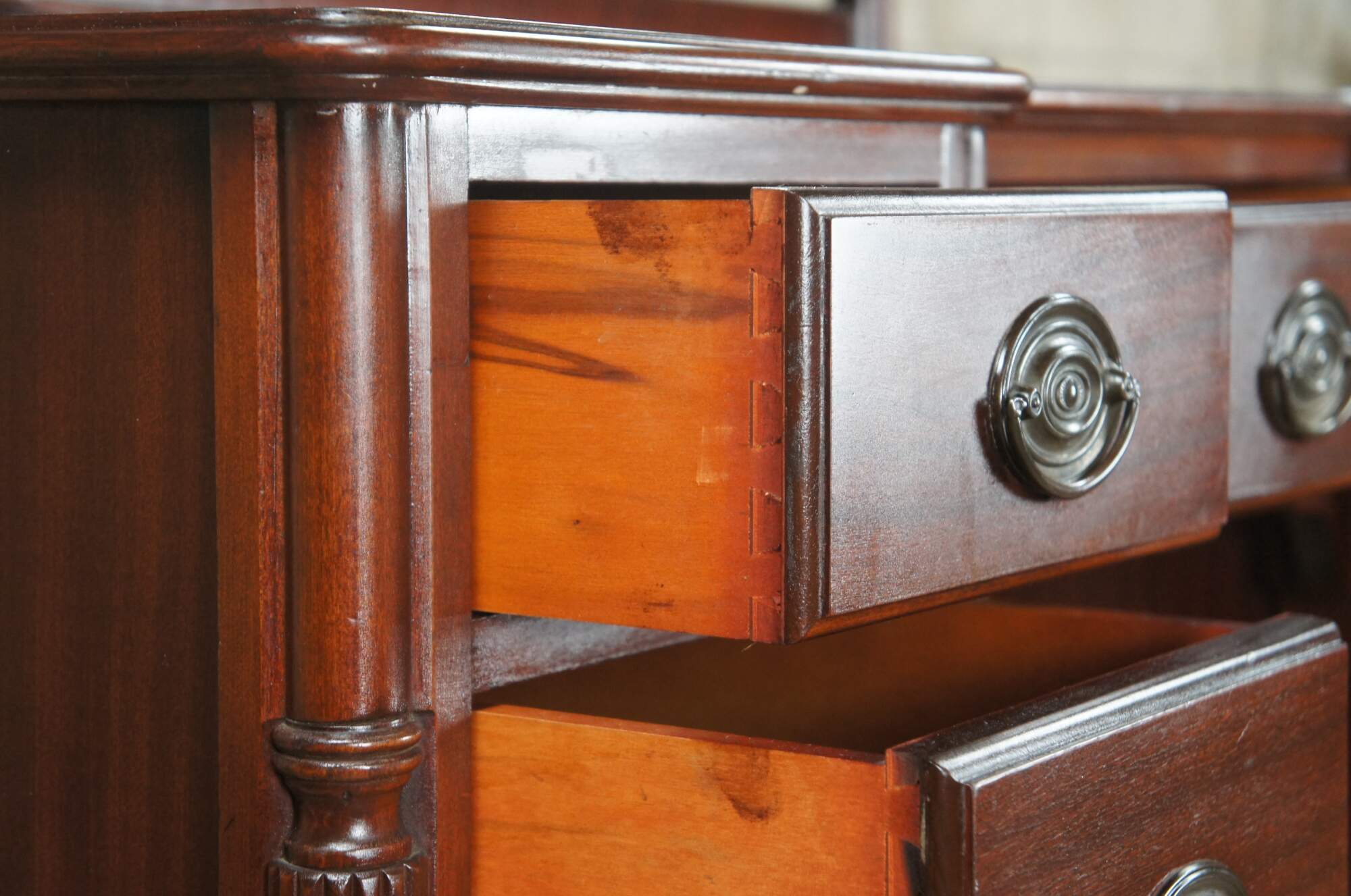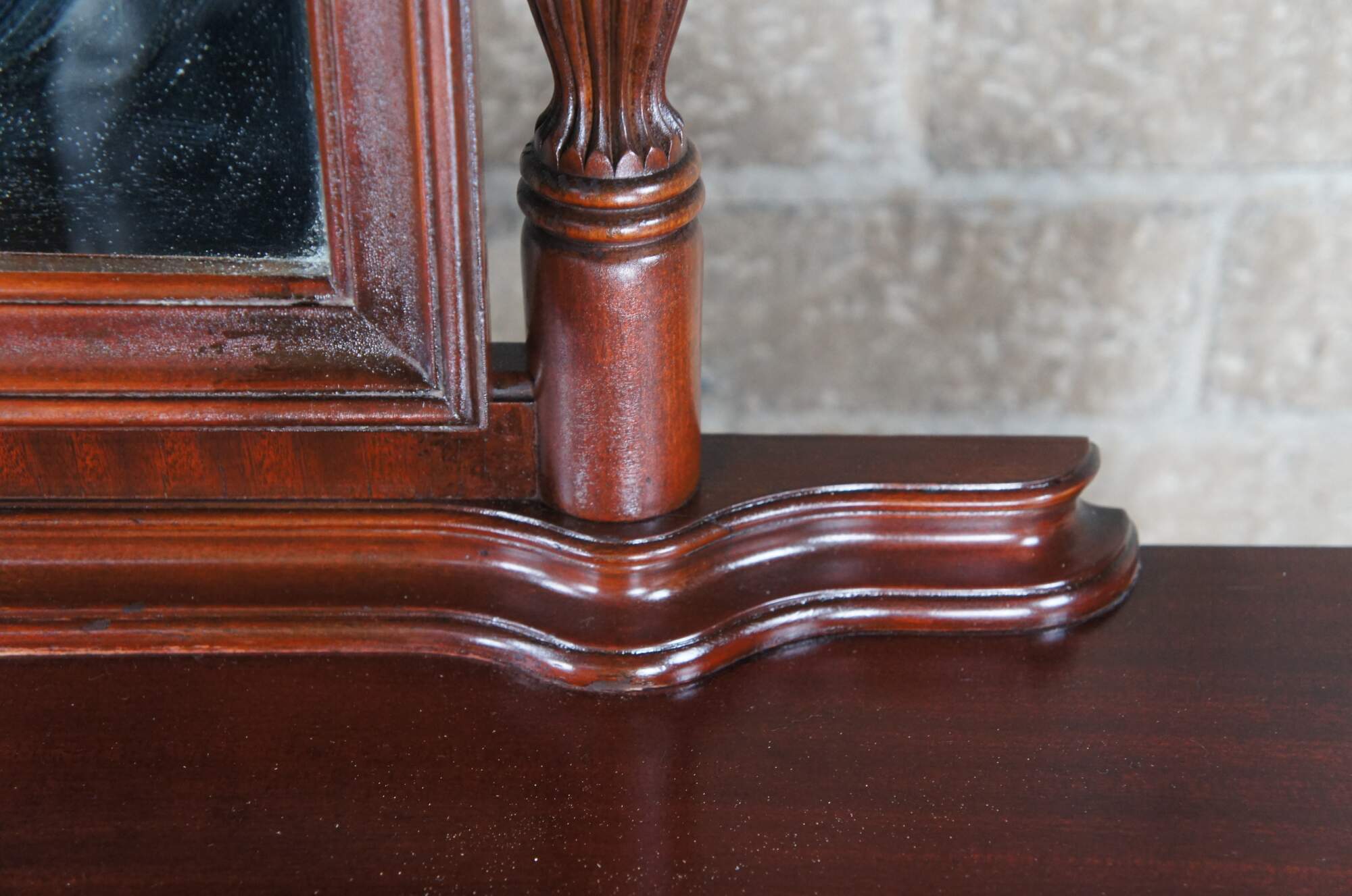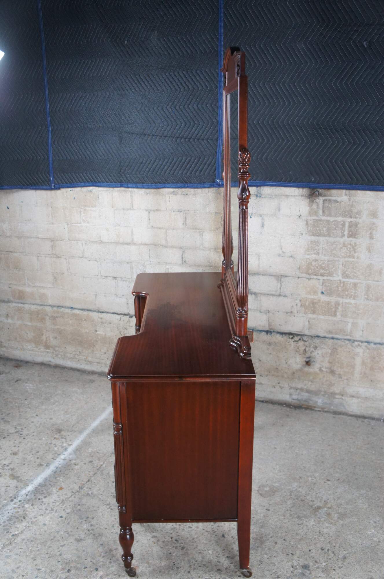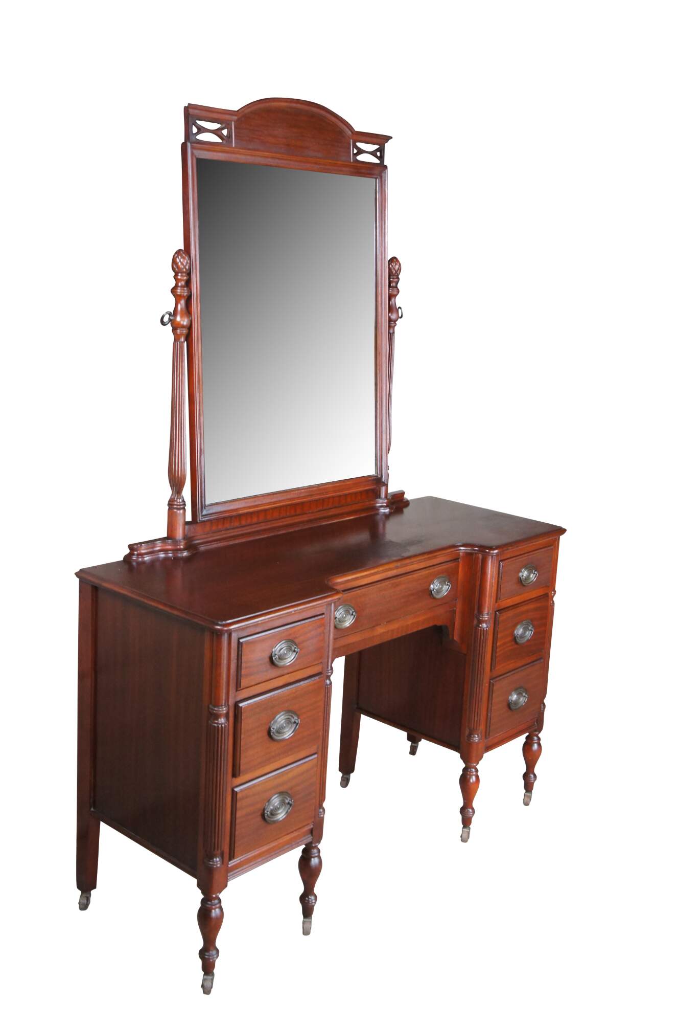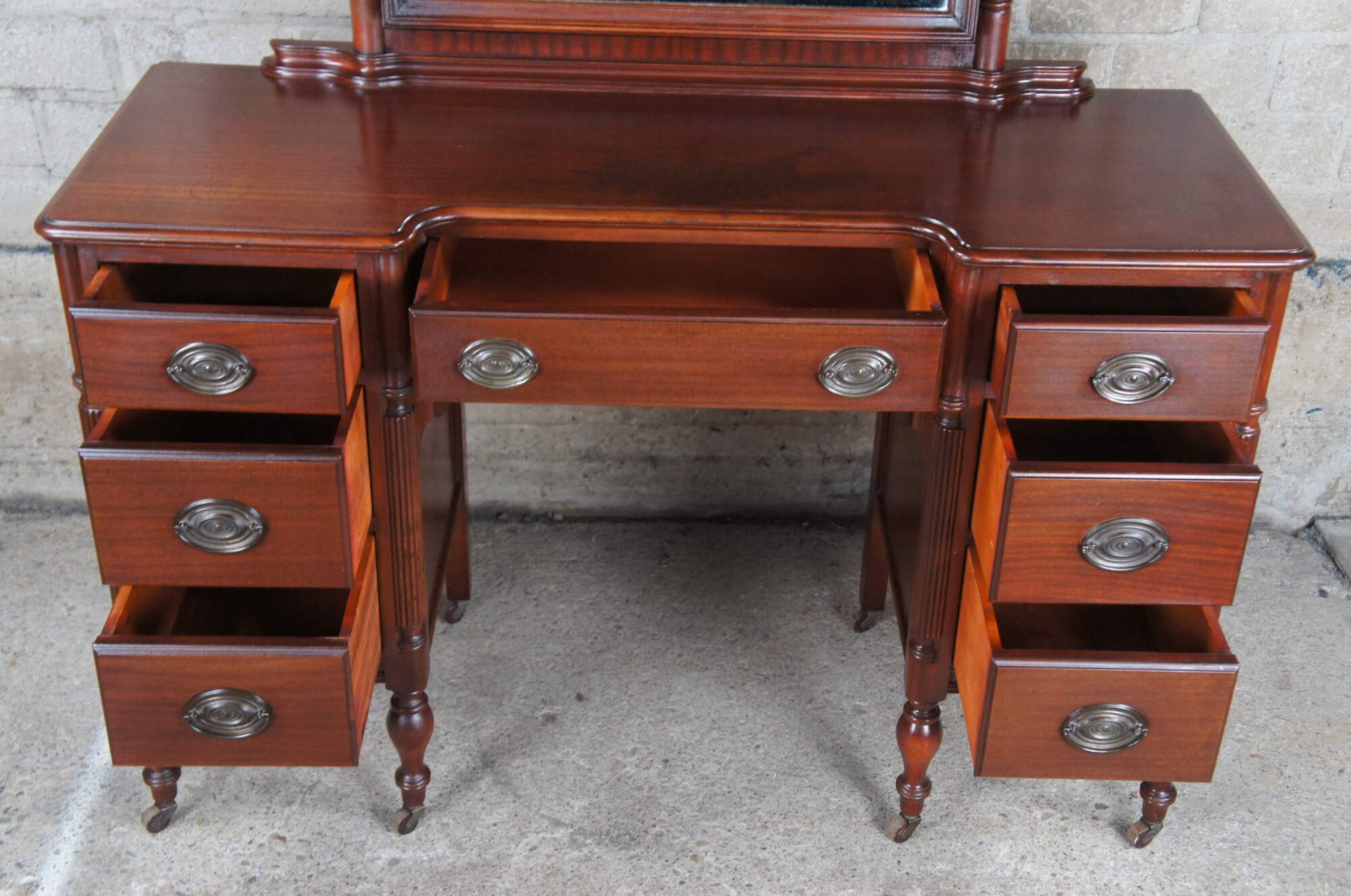 Antique vanity desk or dressing table. Made of mahogany featuring rectangular form with seven drawers over eight turned legs with swivel castors, and upper mirror with reticulated crown flanked by fluted pineapple posts.