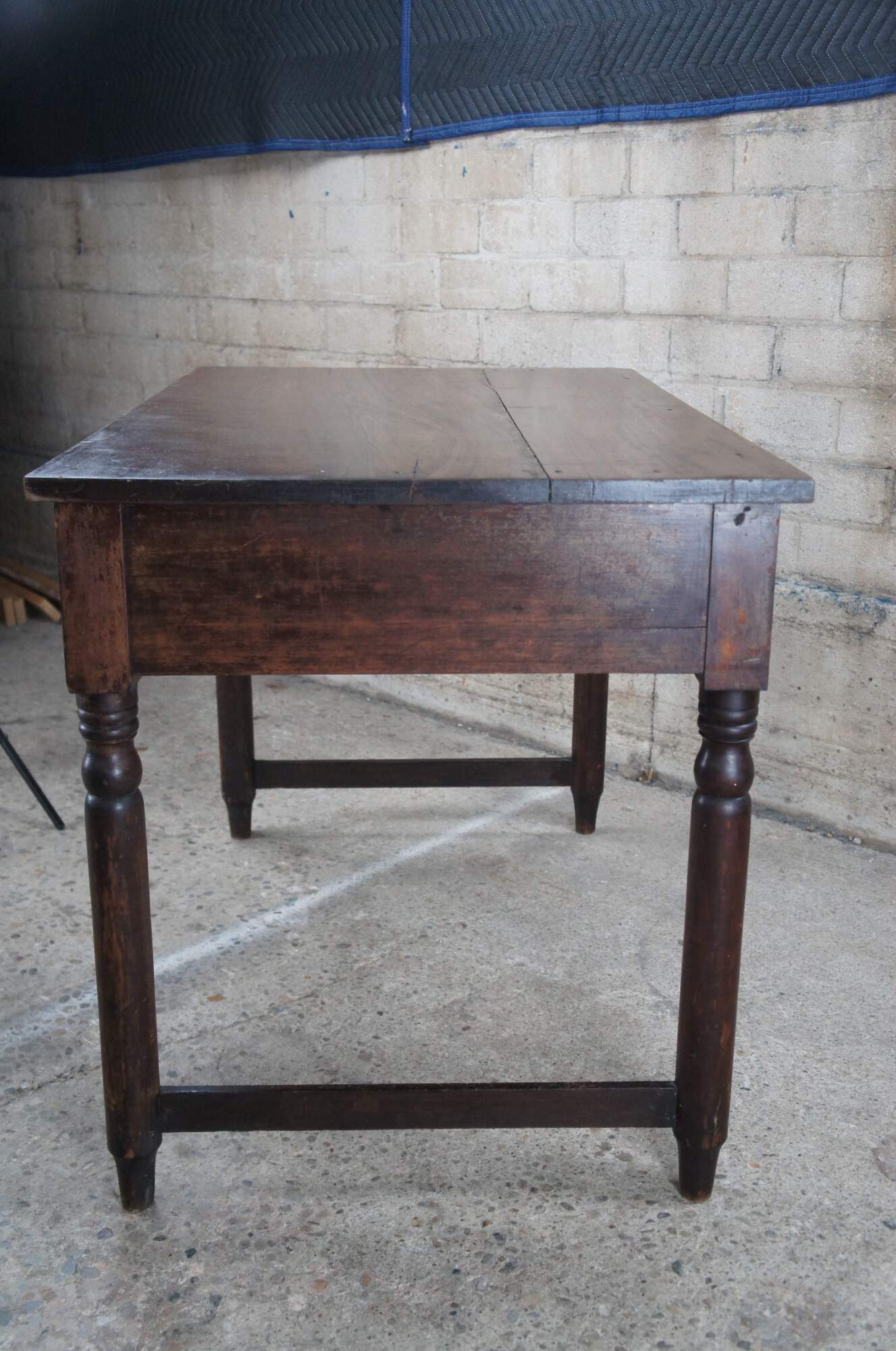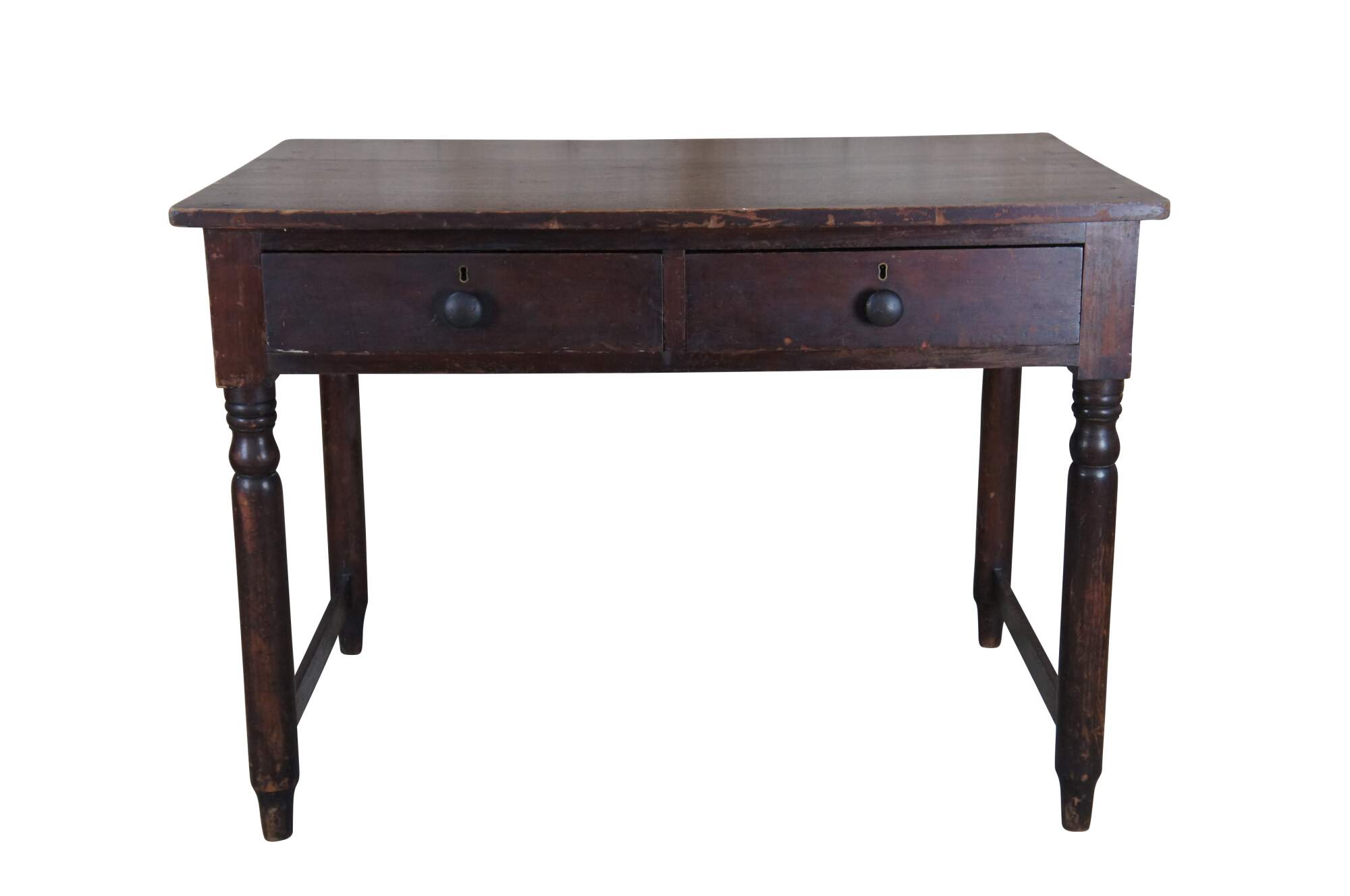 Antique primitive 19th century early American library writing desk. Made of pine featuring rectangular form with two drawers featuring hand dovetailing, hand cut nails, and turned posts connected by stretcher.