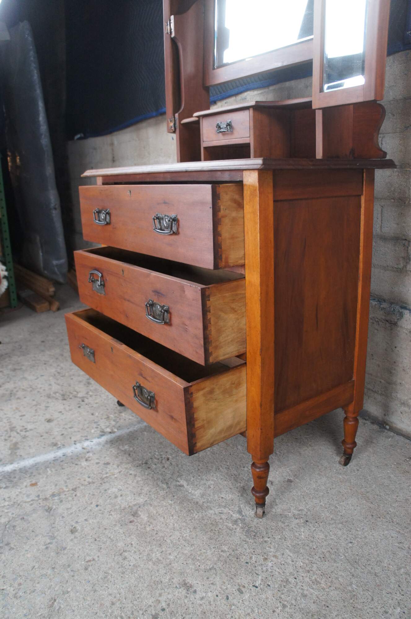 Antique Victorian vanity dresser or shaving stand. Made of walnut and poplar featuring Eastlake styling with three beveled folding mirrors and four drawers.