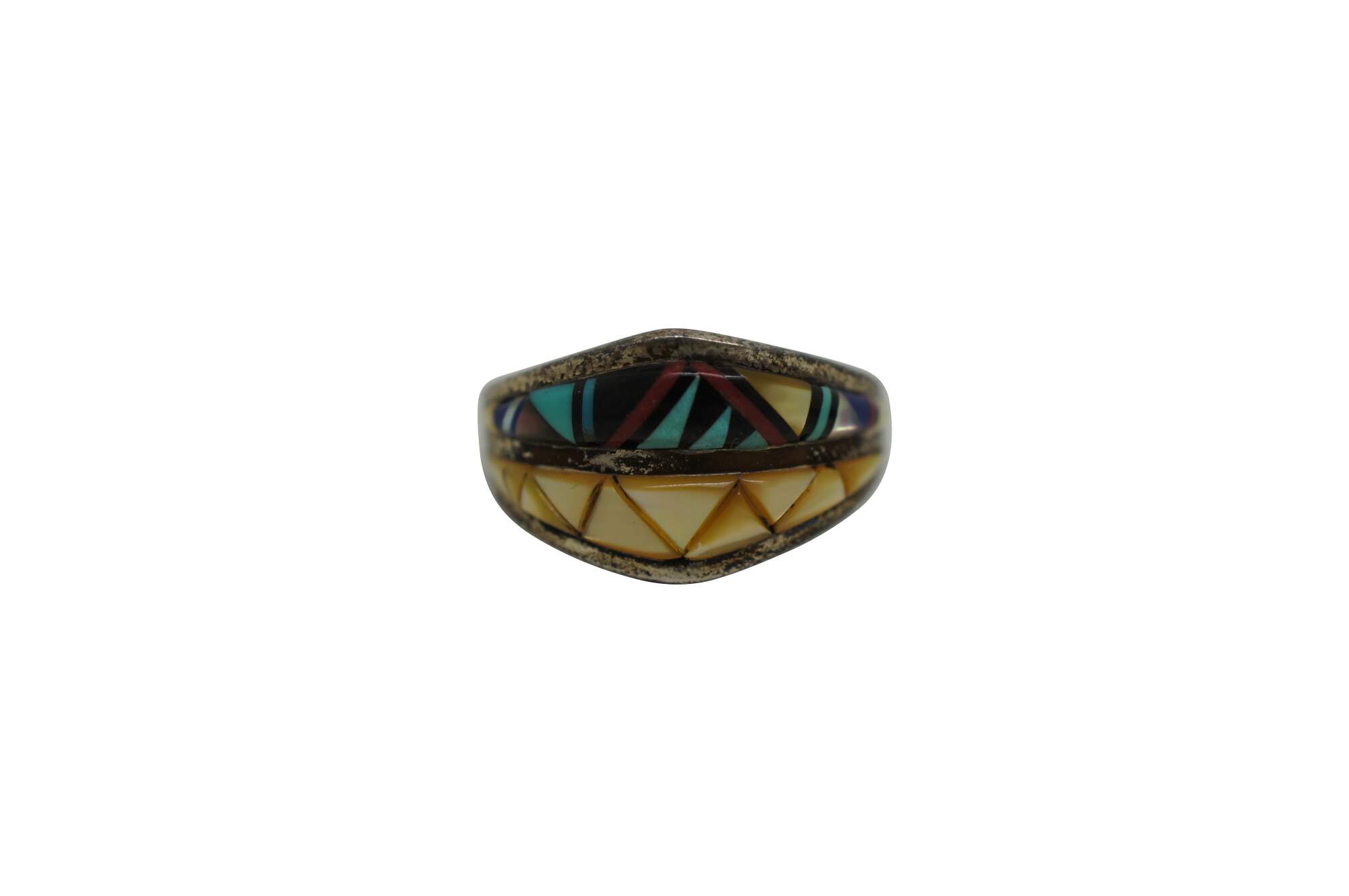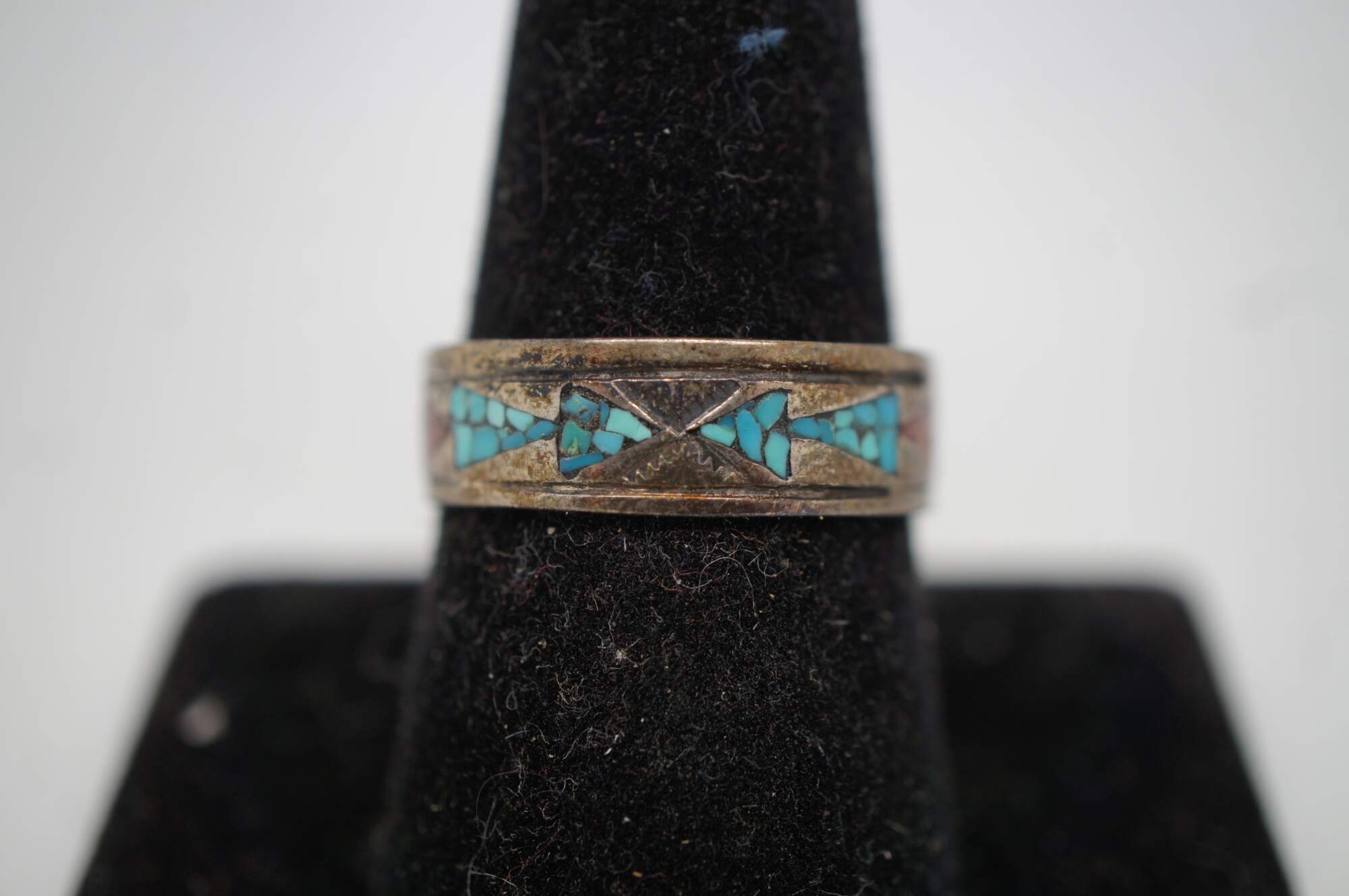 Vintage Native / Southwestern statement rings / bands featuring sterling silver with inlaid mosaic designs. Purchased from OB's Indian American Shop in Gallup New Mexico, circa 1960s-1970s, signed Esalio.