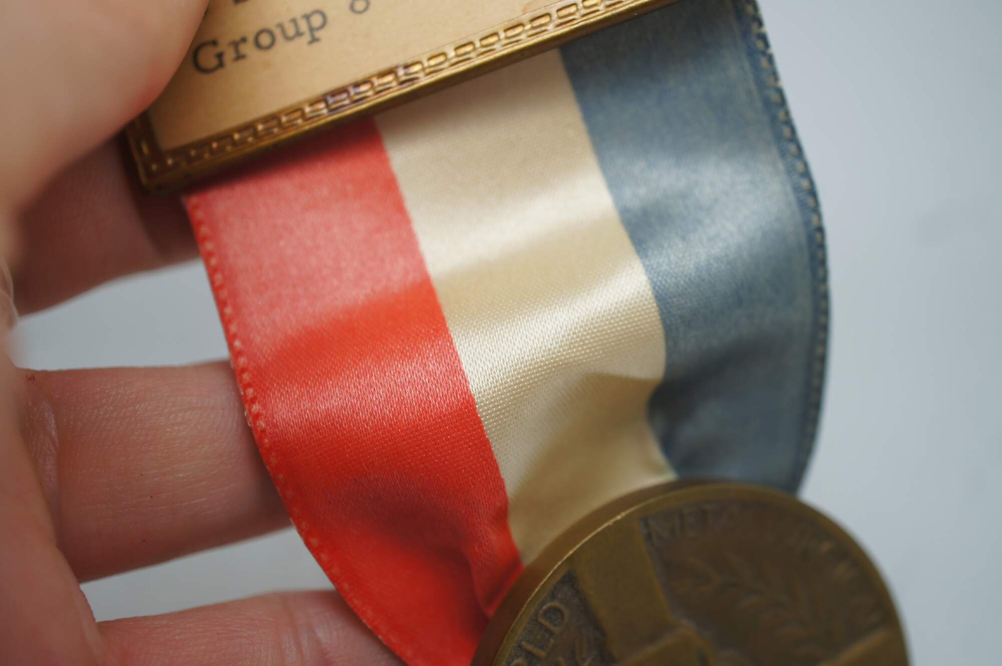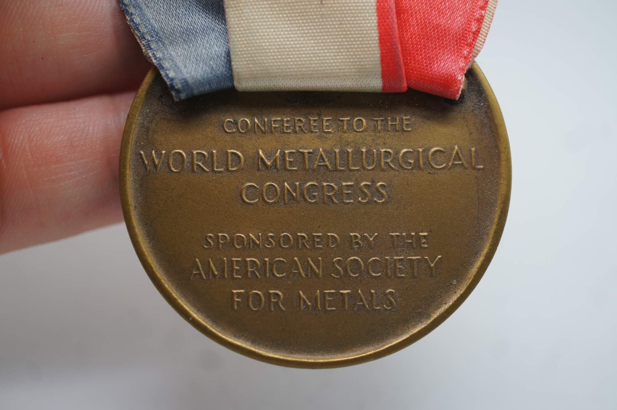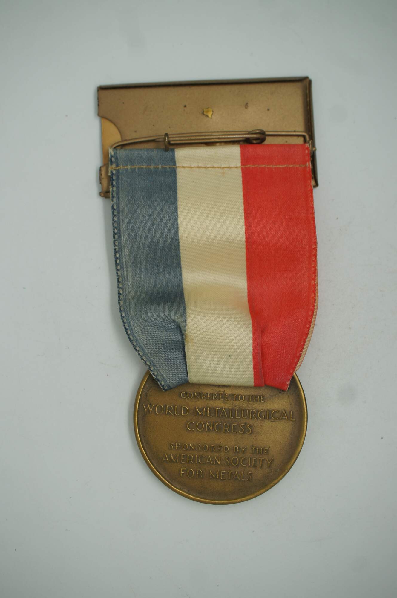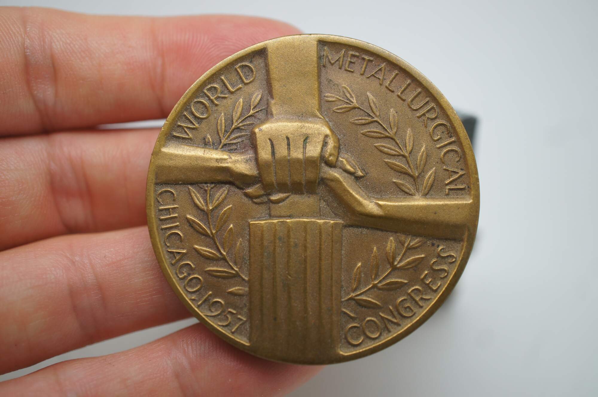 Mid century brass medal / badge / brooch pin from the 1957 Chicago World Metallurgical Congress. American Society for Metals, R.J. Raudebaugh, USA, Group 8, Struck by Medallic Art Co., N.Y.