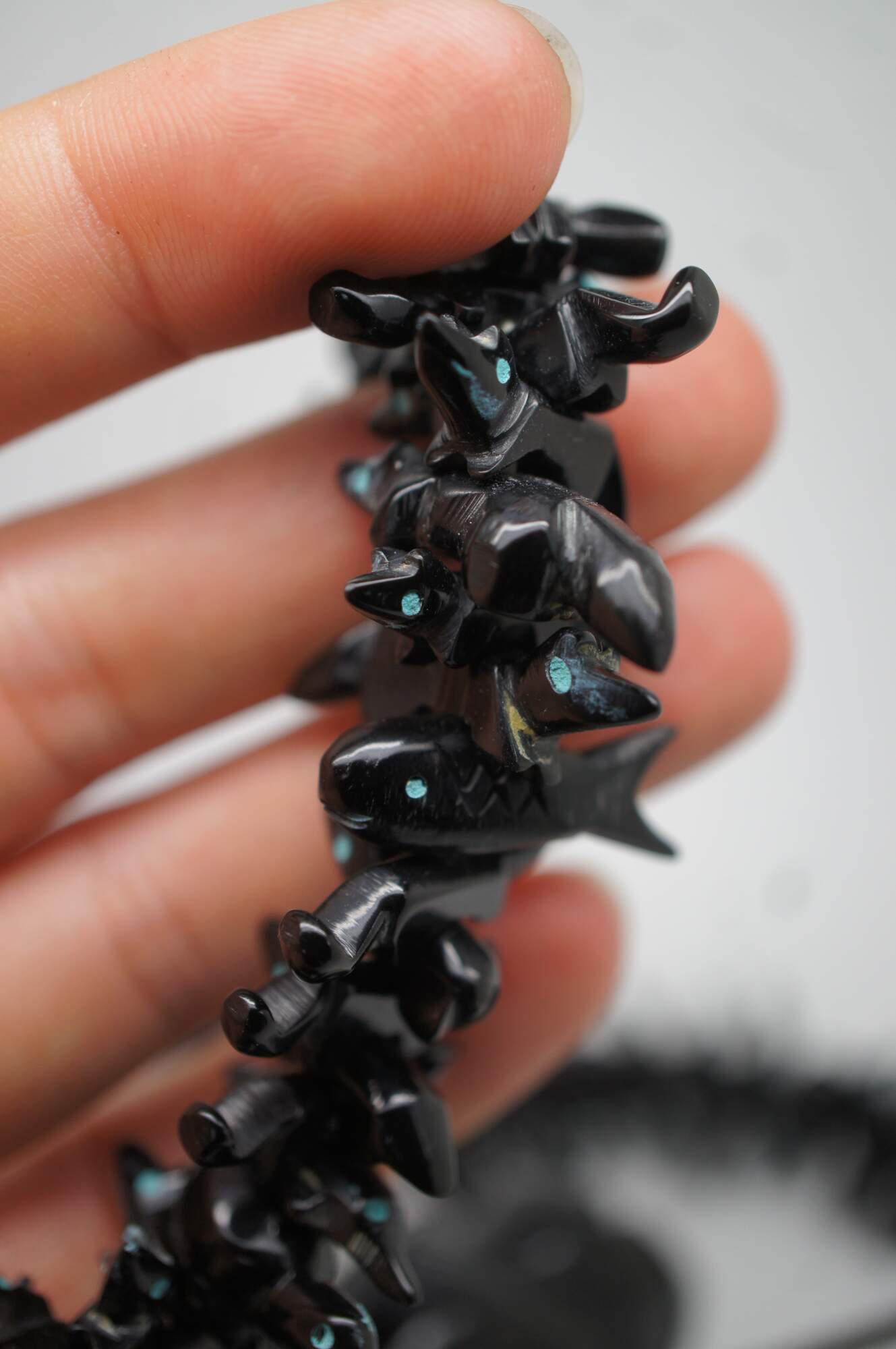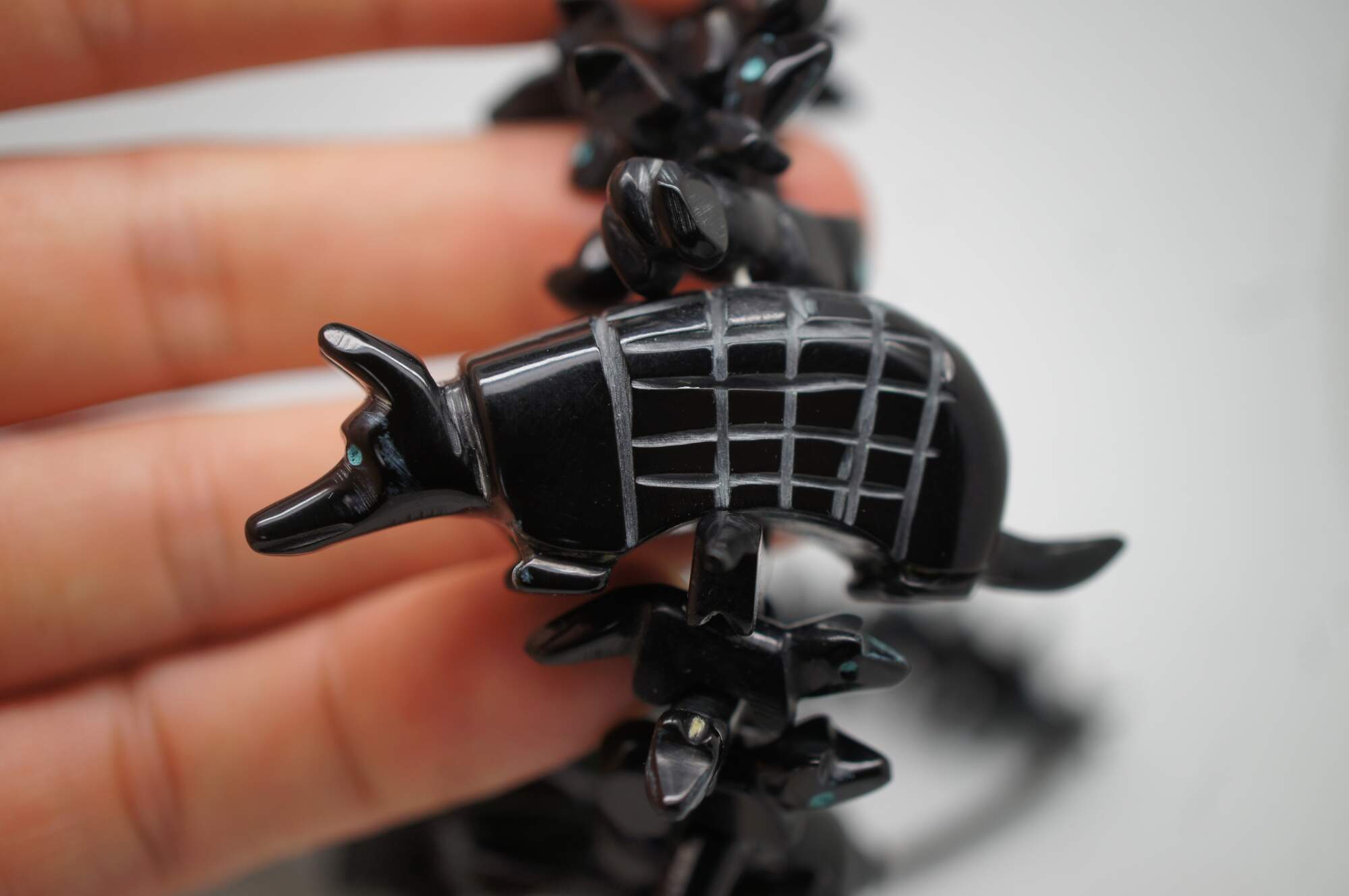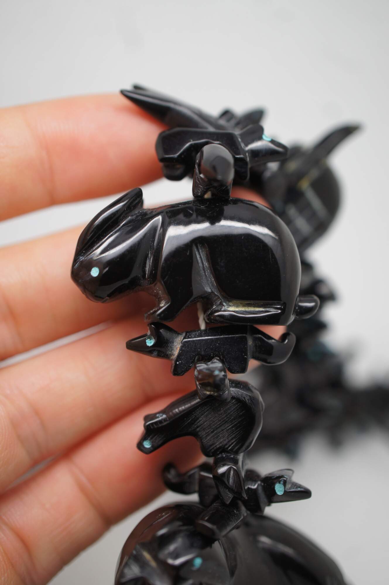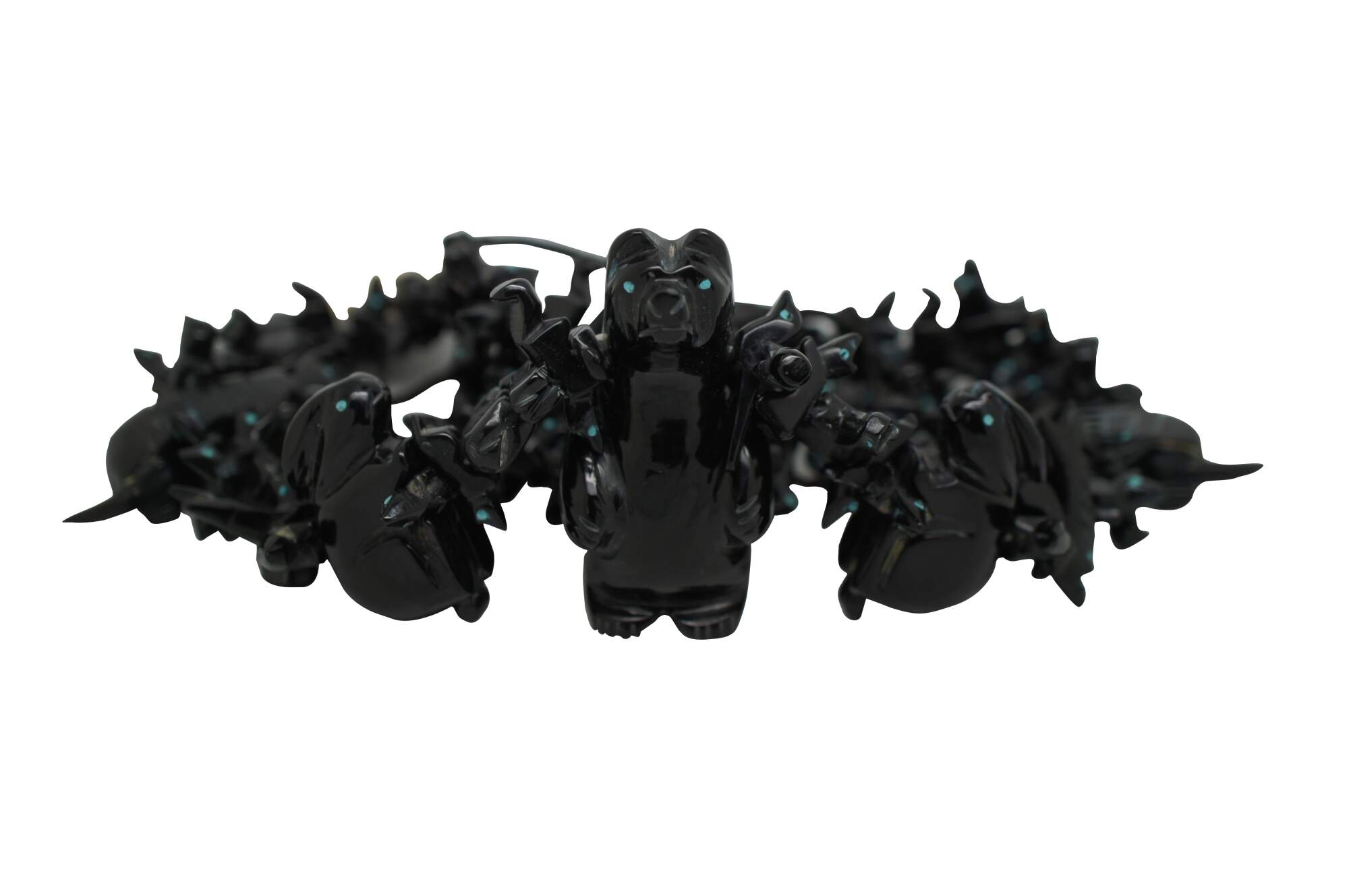 Vintage Native American / Southwestern Zuni statement necklace. Carved from black Jet gemstones with turquoise color eyes. Features a large standing black bear at center with rabbits, birds, ducks, armadillo, squirrel and fox.
