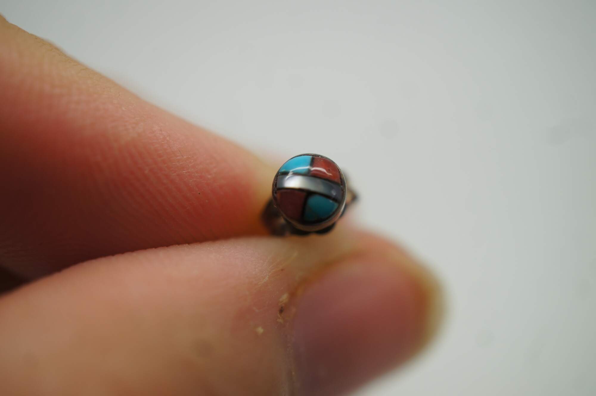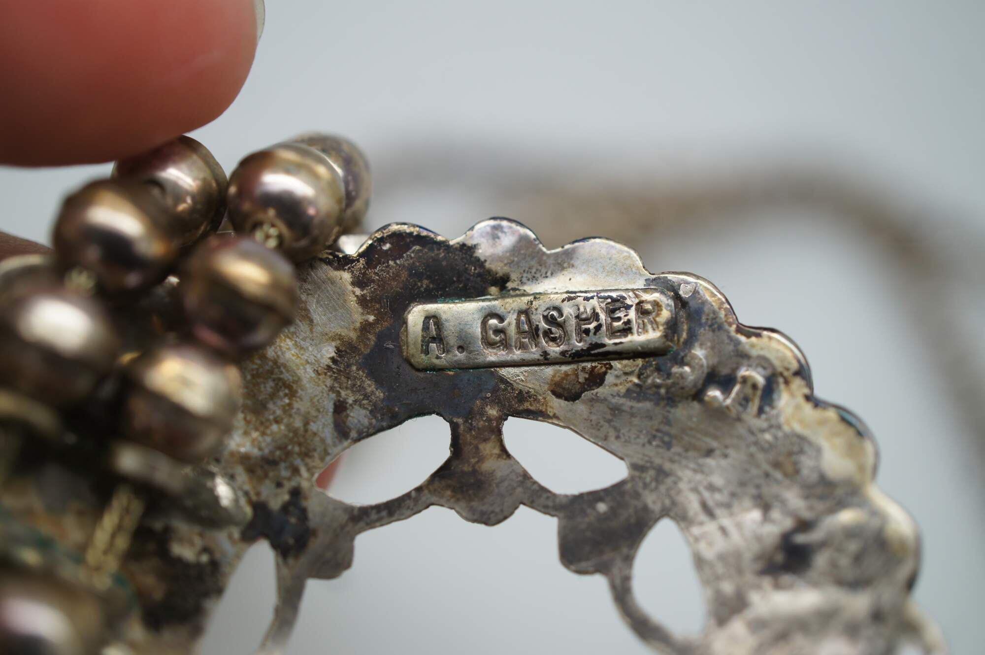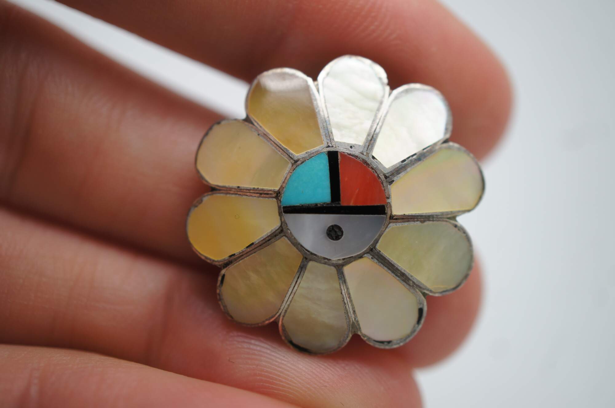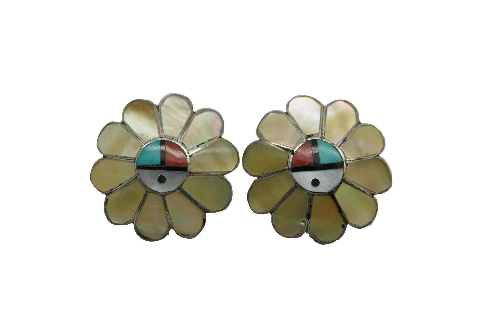 Handmade by one of the most famous Zuni Native American jewelry artists, Ashberry Gasper. This impressive jewelry set features a beaded sterling silver squash blossom / sunface theme with beautifully inlaid semi precious gemstones including Abalone, Red Coral, Mother of Pearl, Turquoise, and Onyx. Purchased in Gallup New Mexico, circa 1960s-1970s.