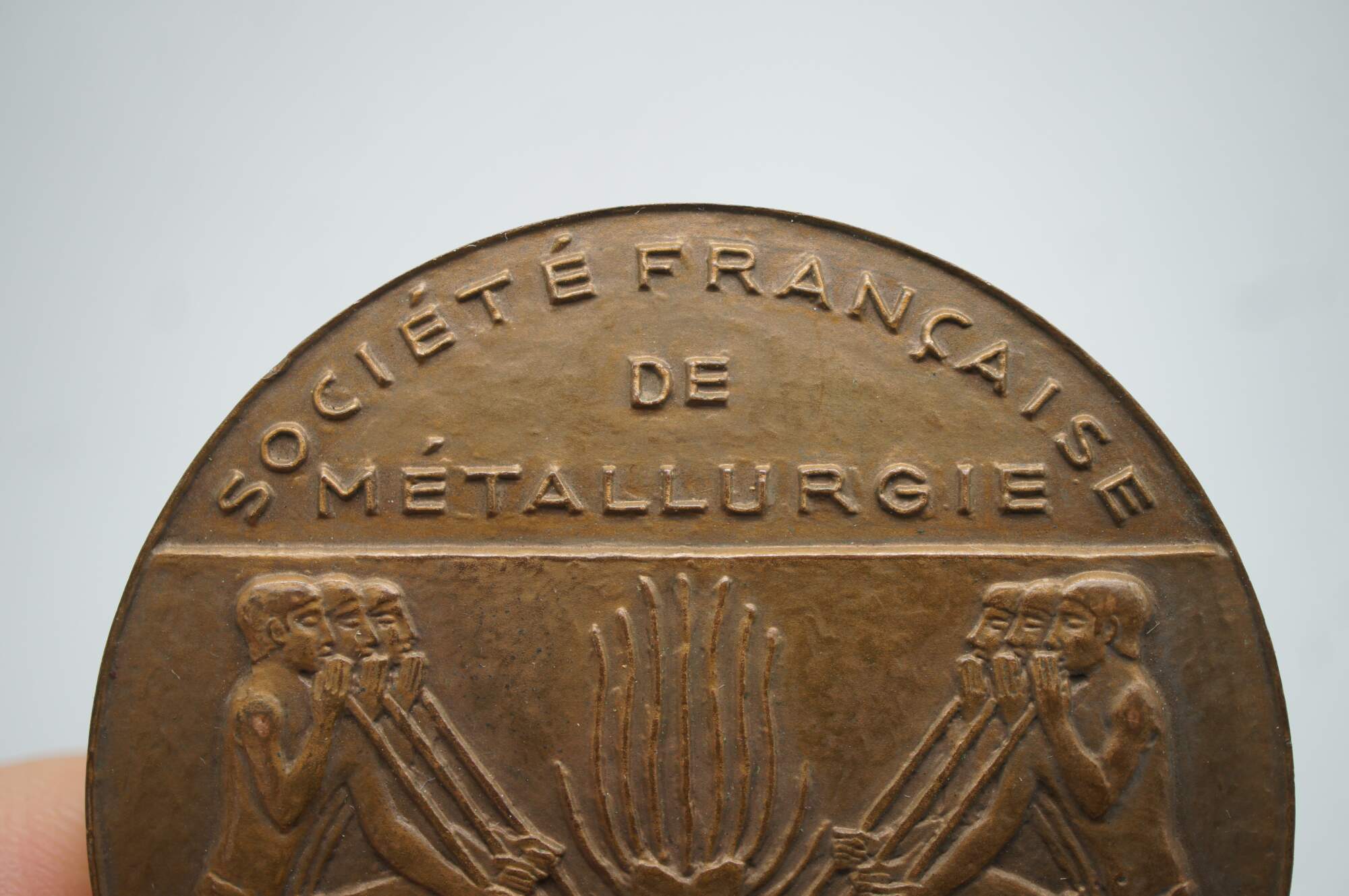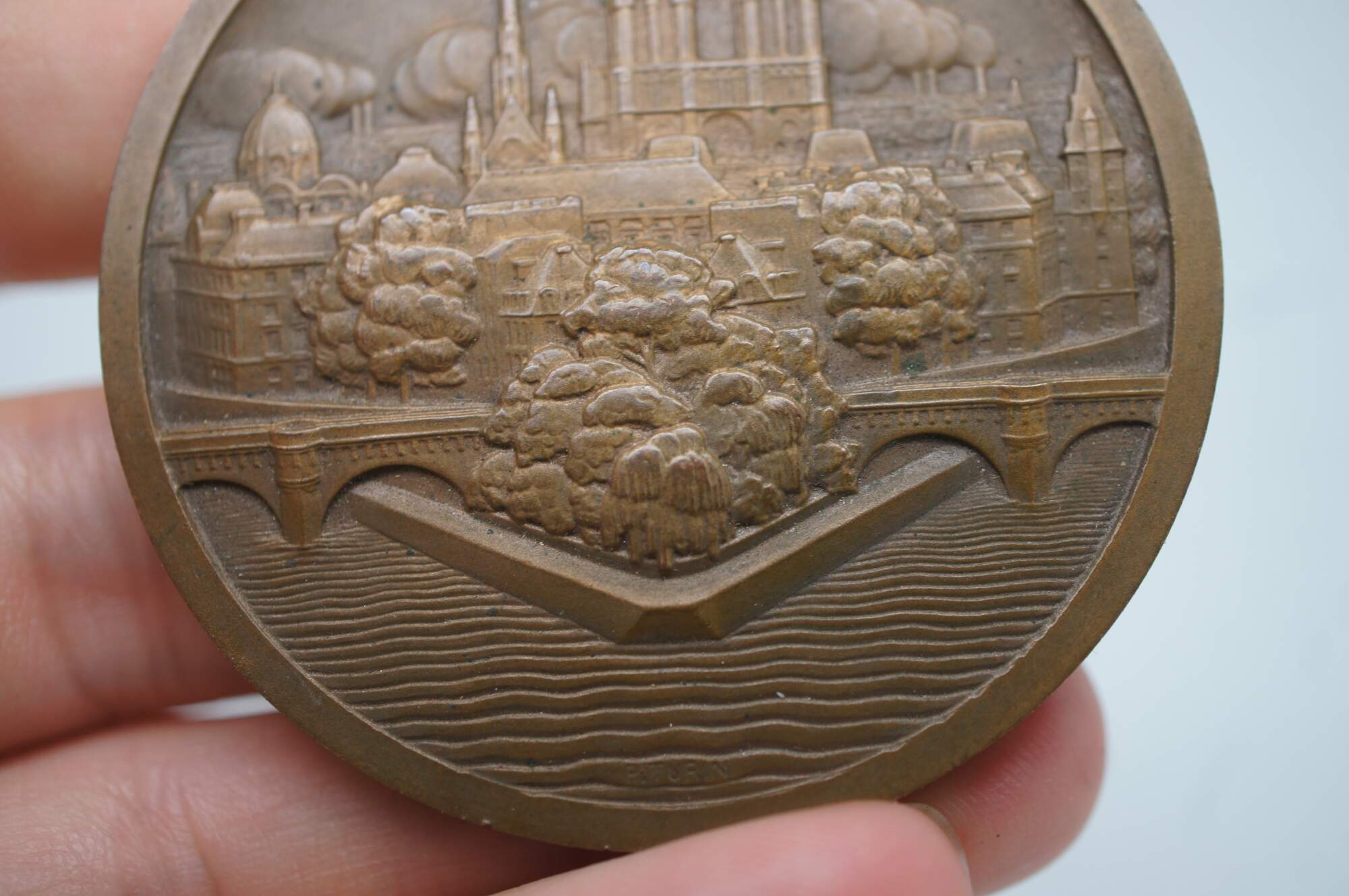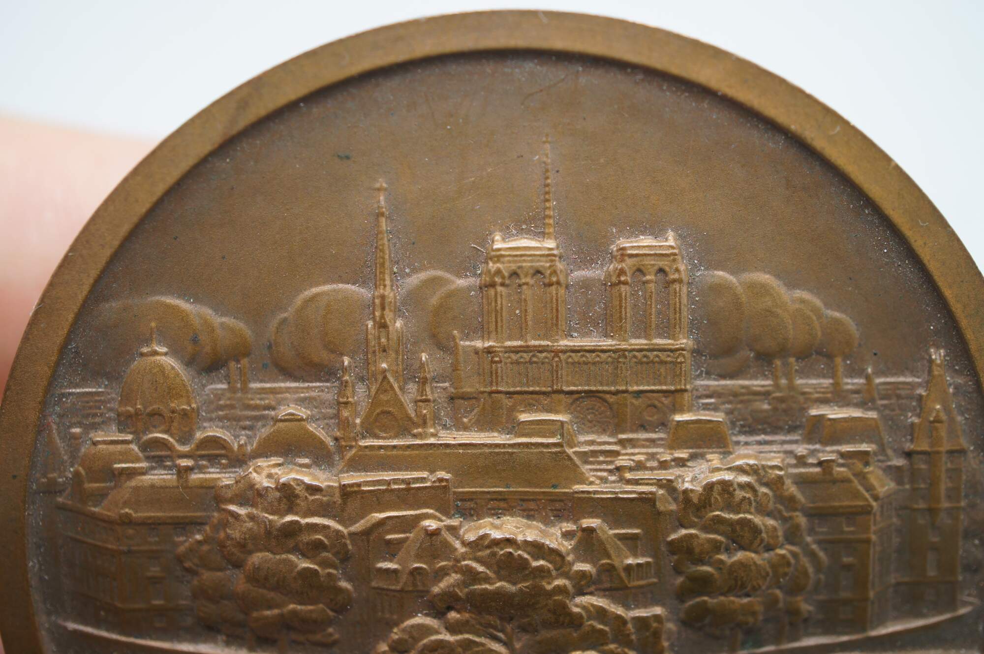 Mid to early 20th century Pierre Turin bronze medal featuring the Societe Francaise de Metallurgie and the city of Paris landscape including Notre Dame
