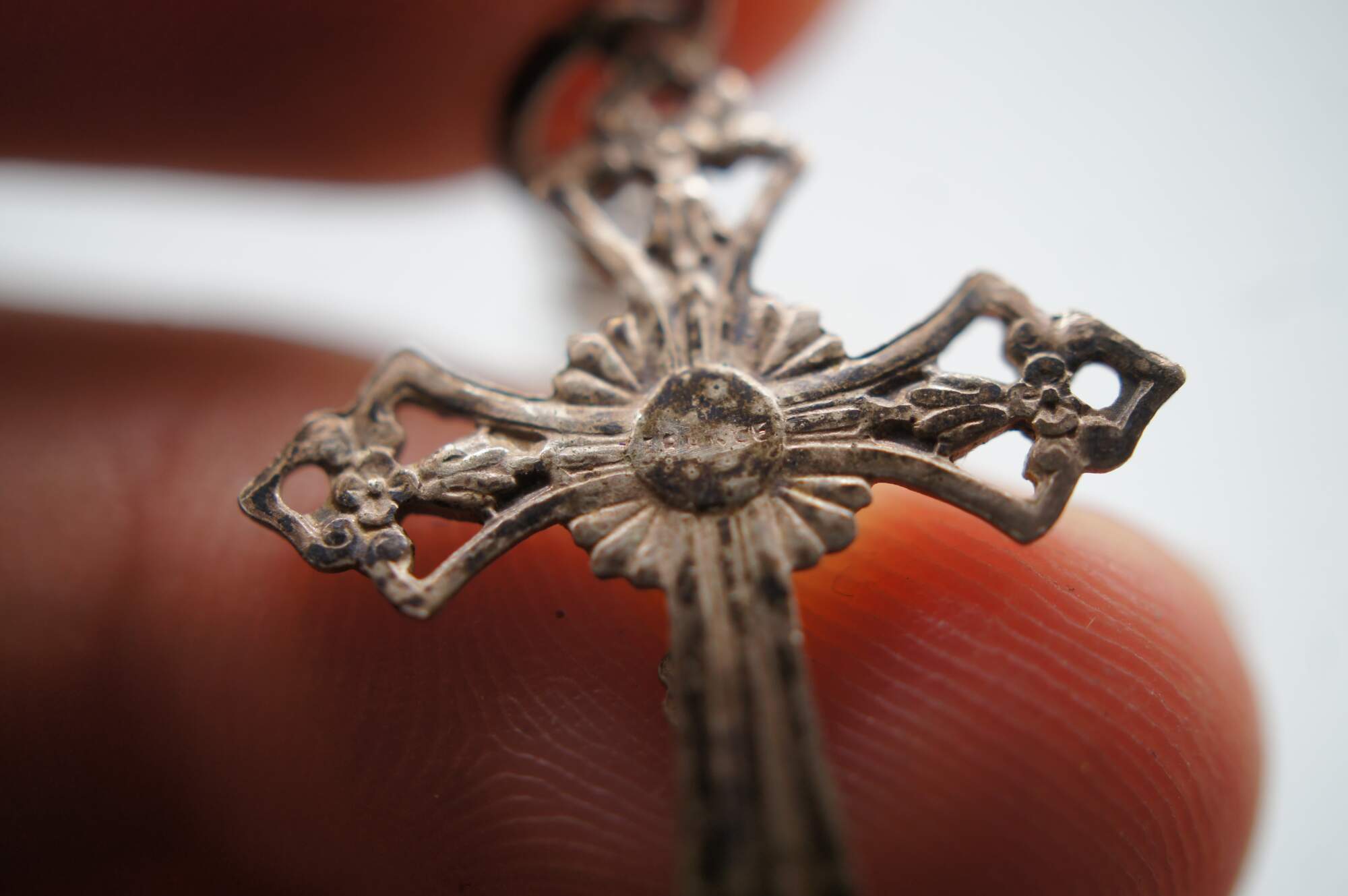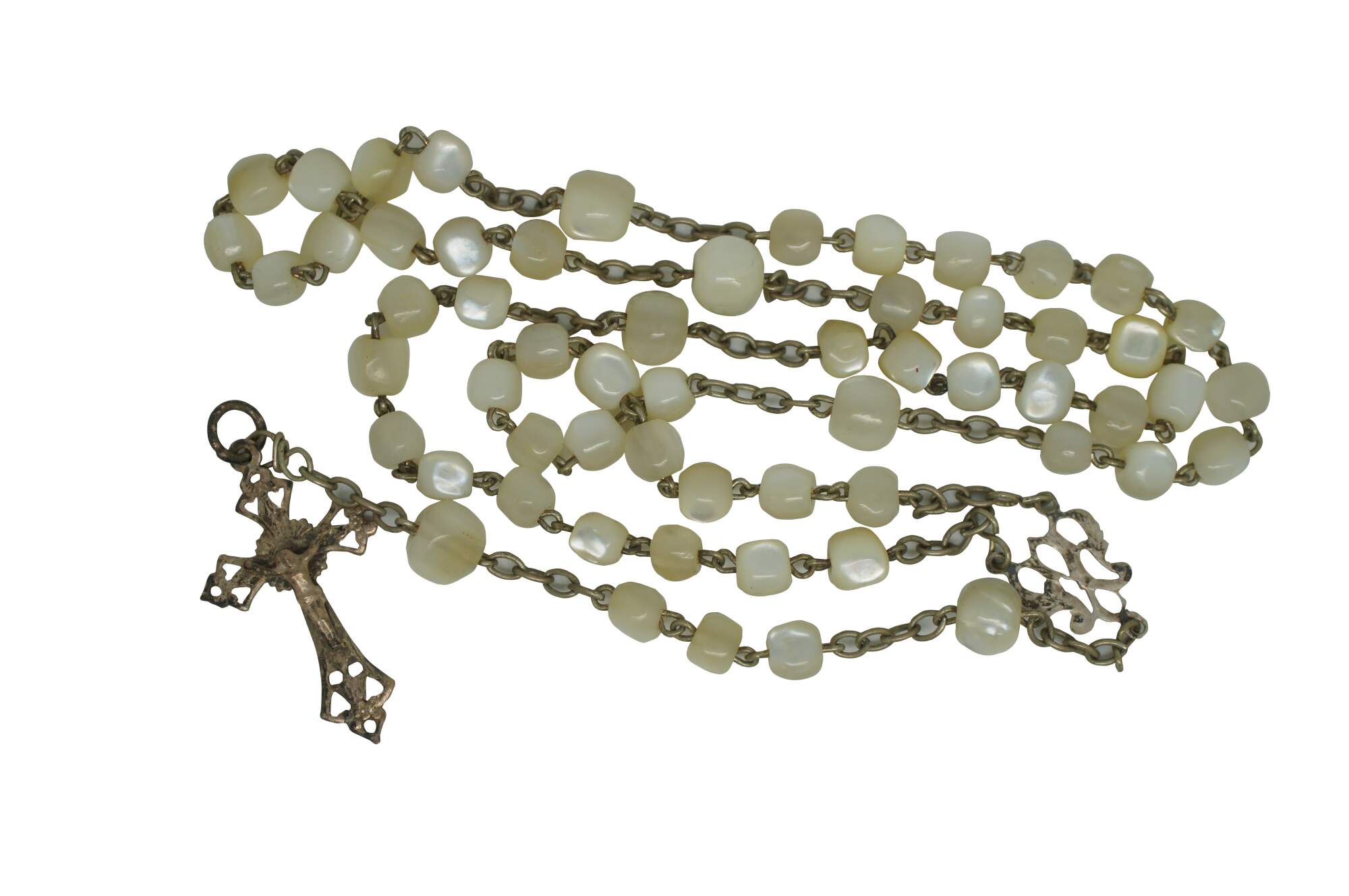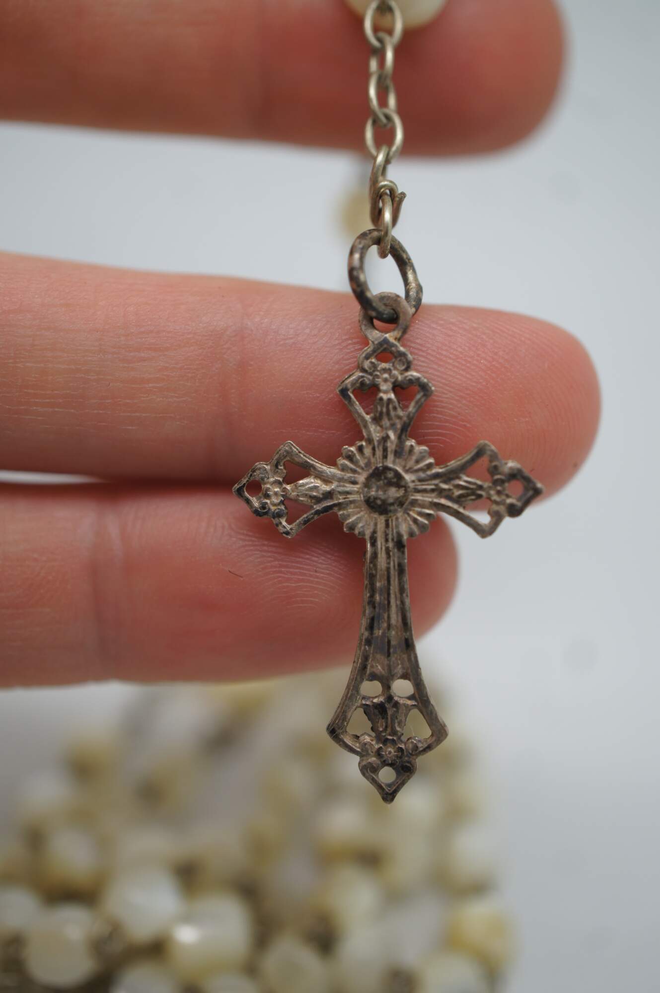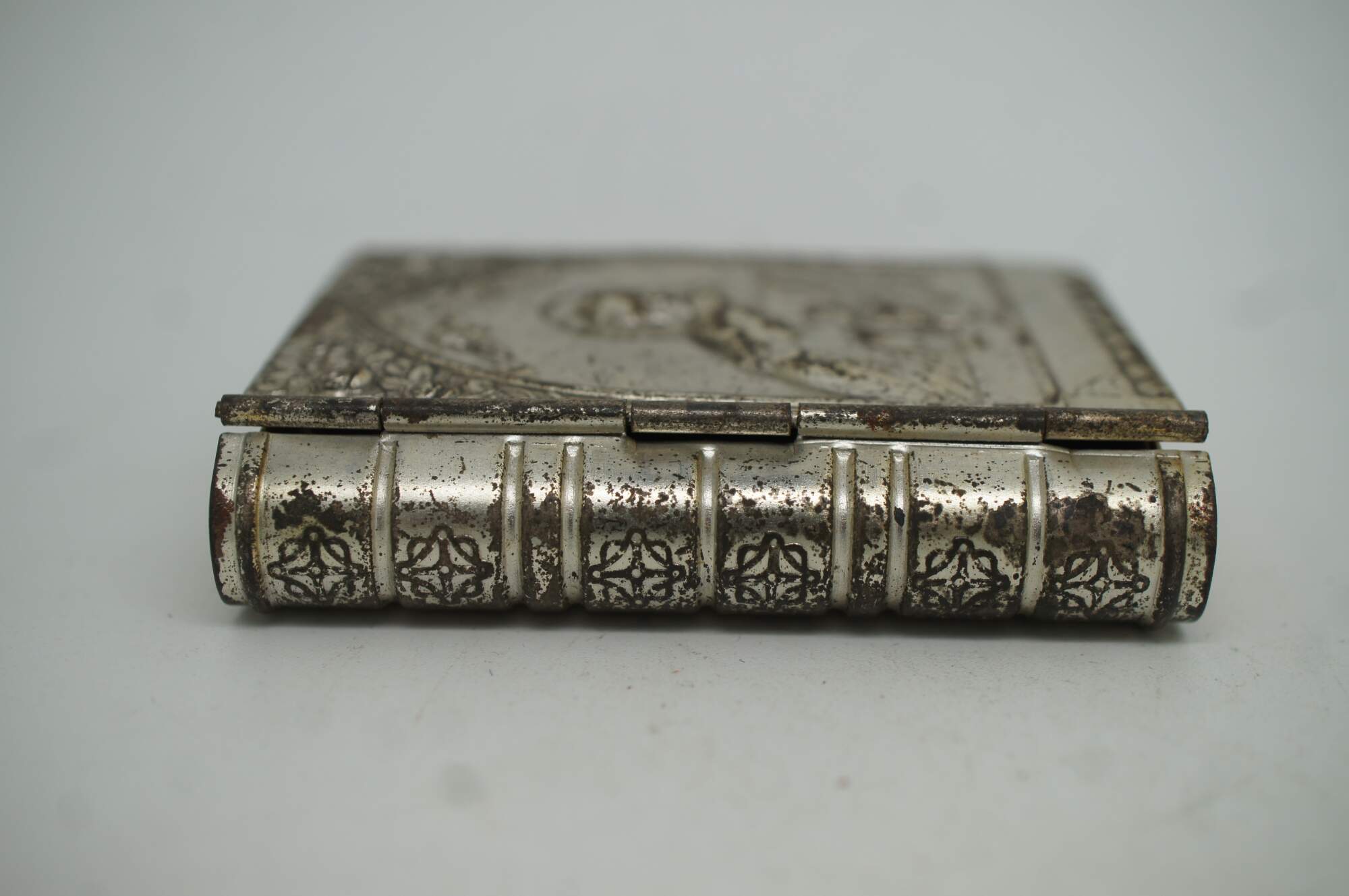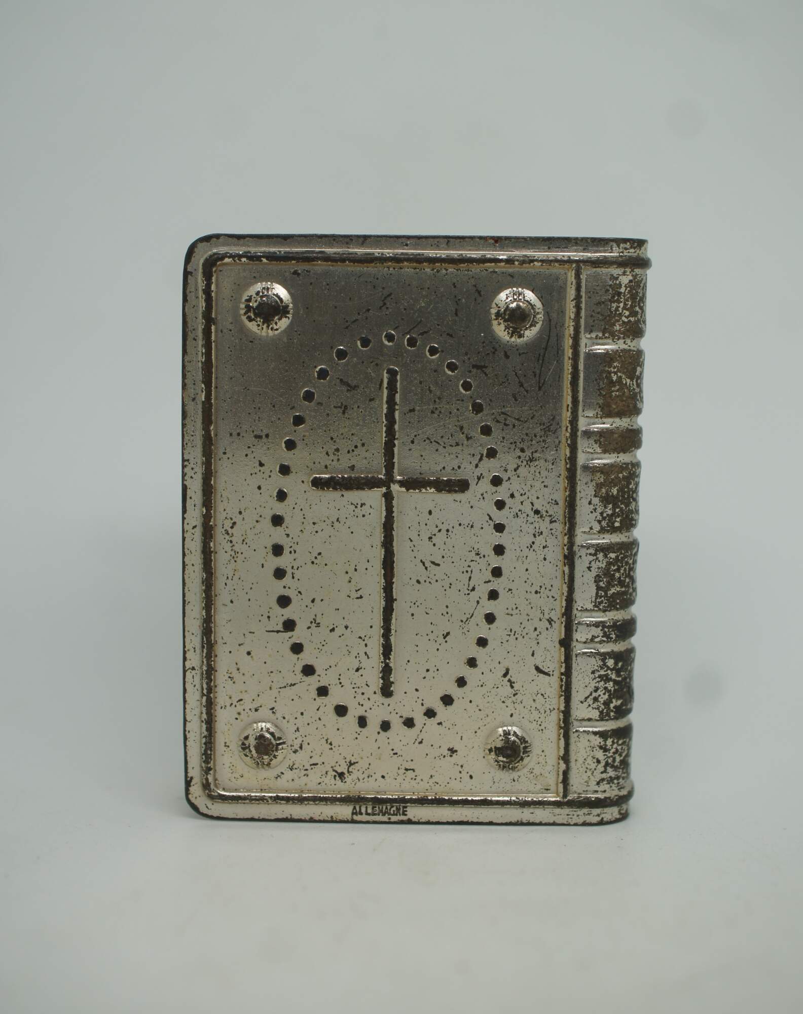 Mid to early 20th century German / French silver plate rosary holder case and necklace. Shaped like a bible book featuring a scene with Jesus giving communion and mother of pearl rosary with cross. Allemagne is the French name for Germany.