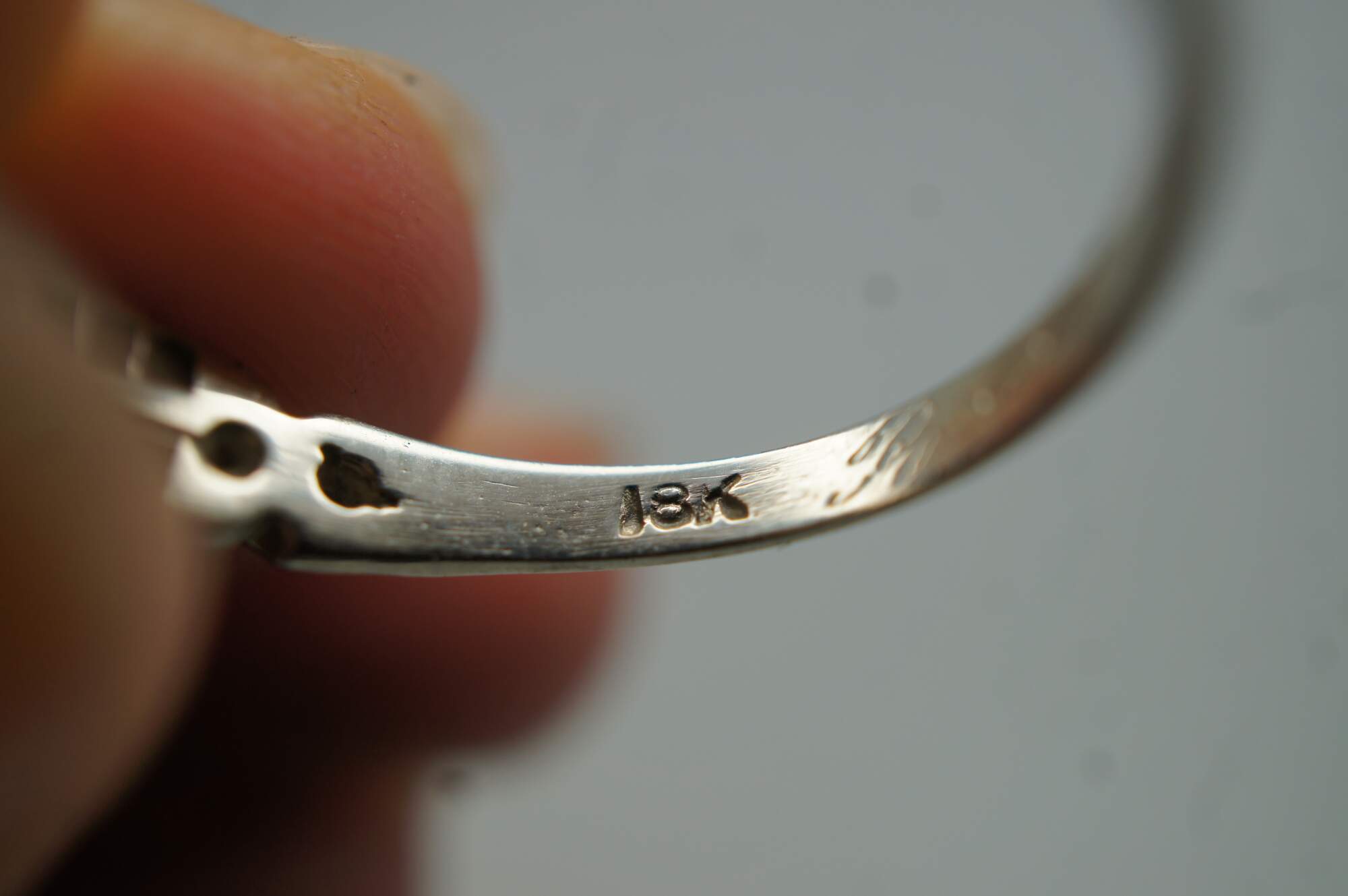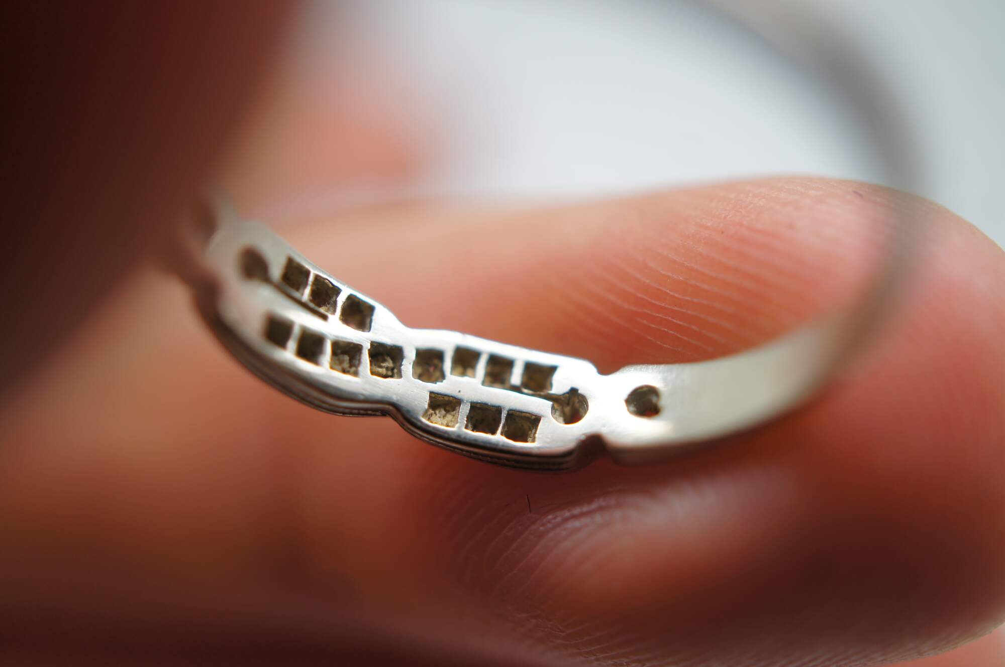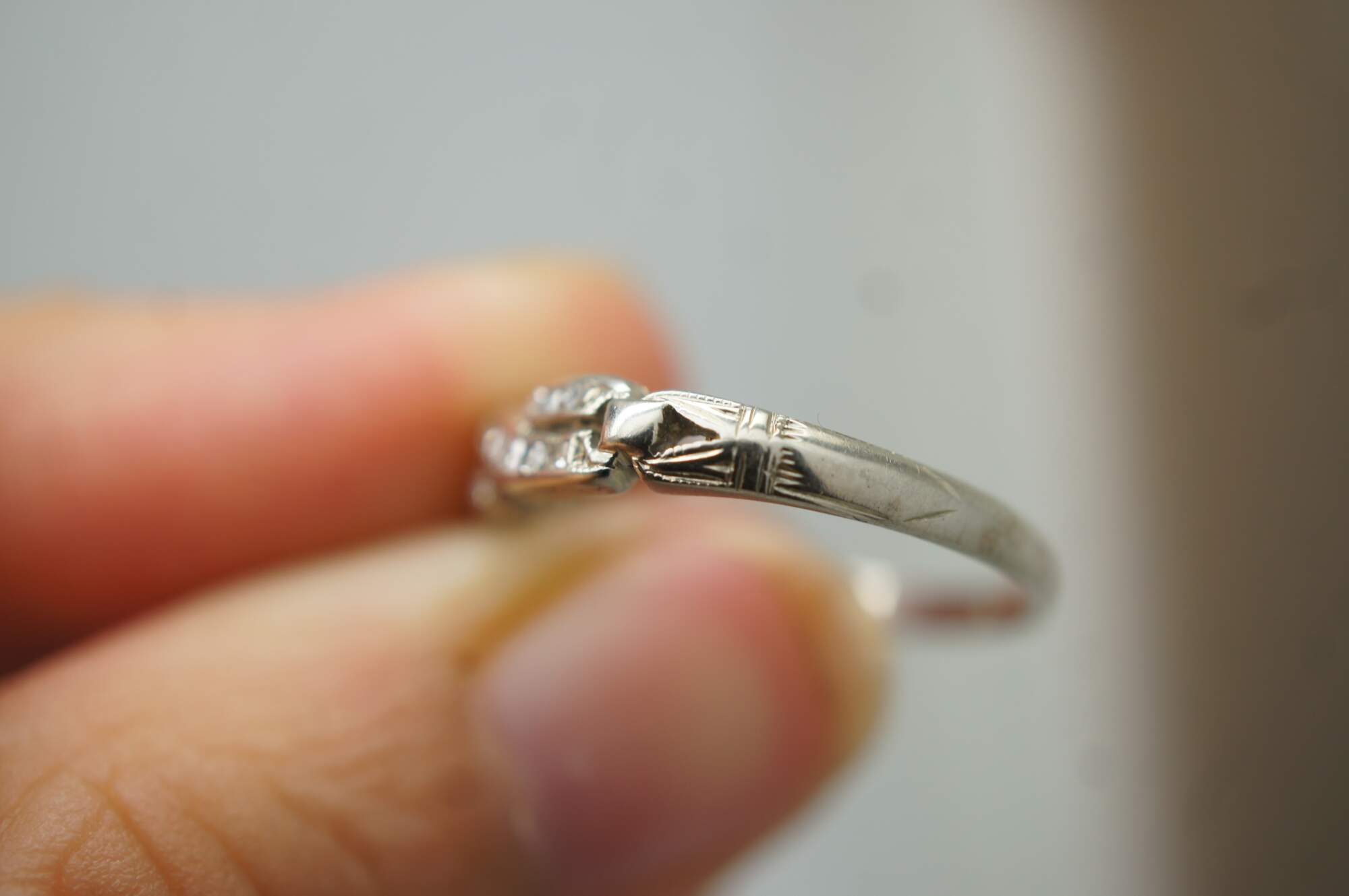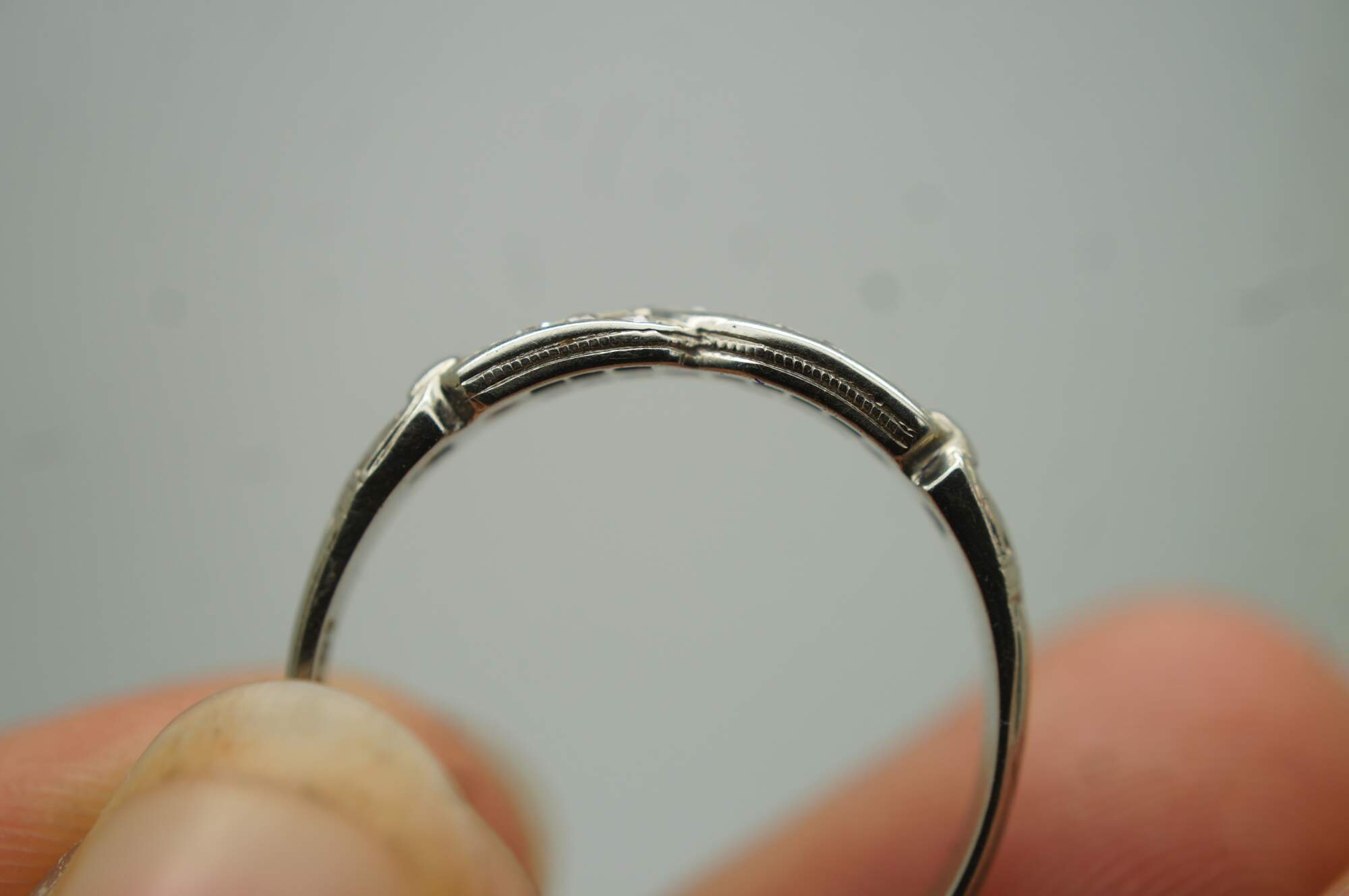 Antique art deco 18k white gold engagement / wedding ring / band featuring a reticulated milgrain channel & buckle twisted infinity design with 14 diamonds. Engraved inside "RJR-BMC".