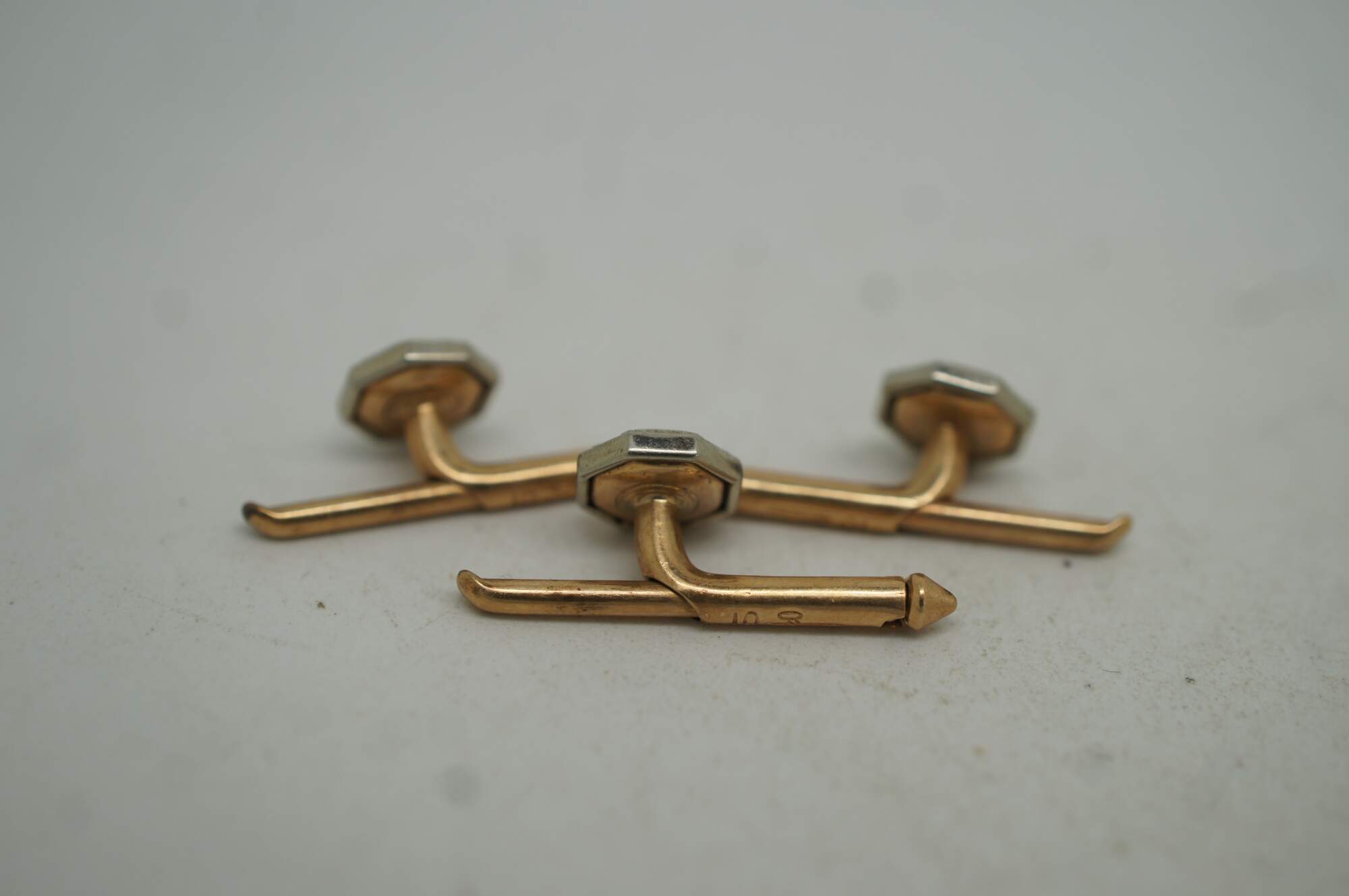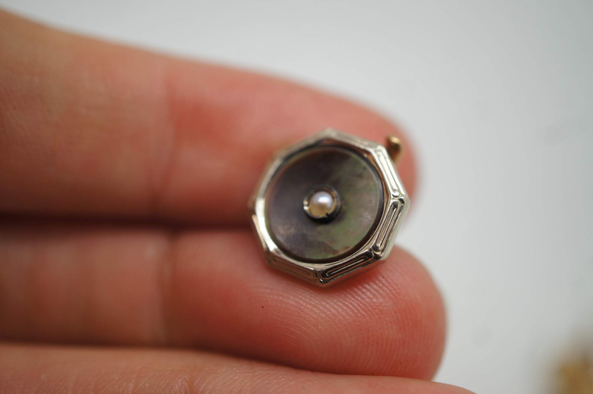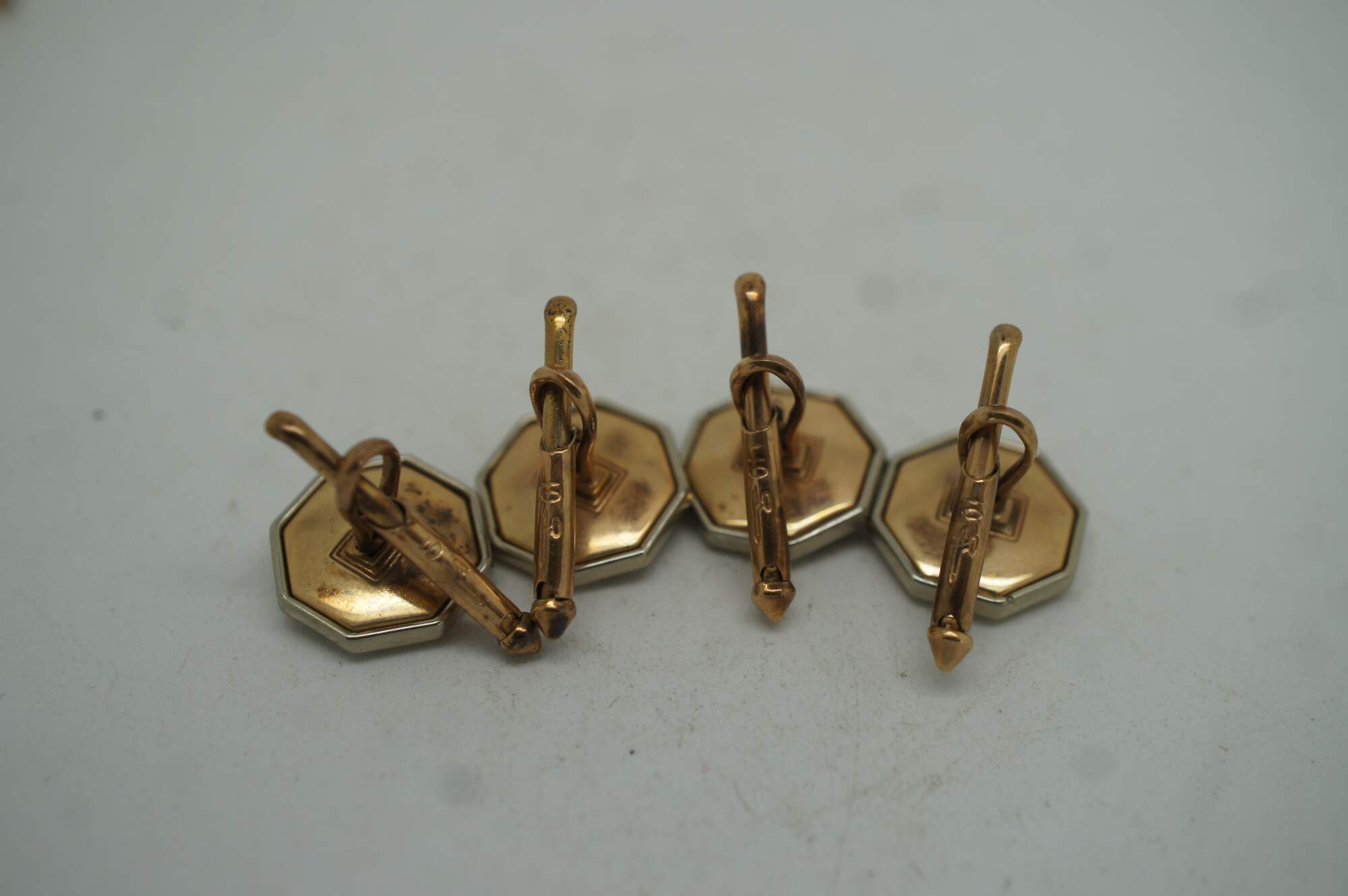 Vintage 10k gold mother of pearl (mop) cufflinks and button studs featuring octagonal form with central pearls.