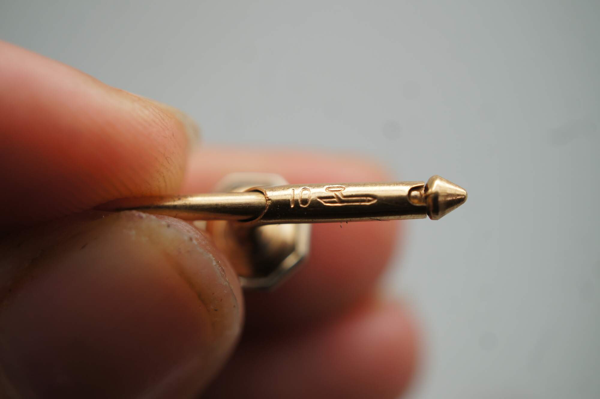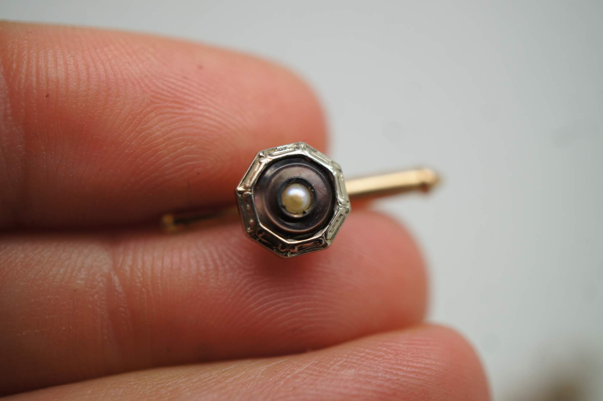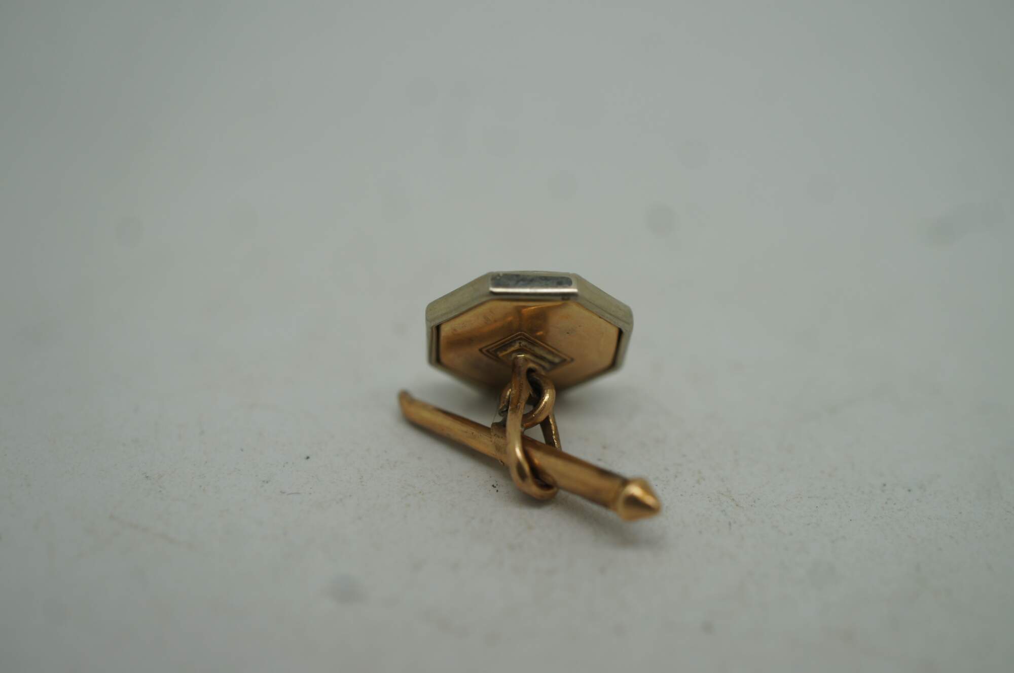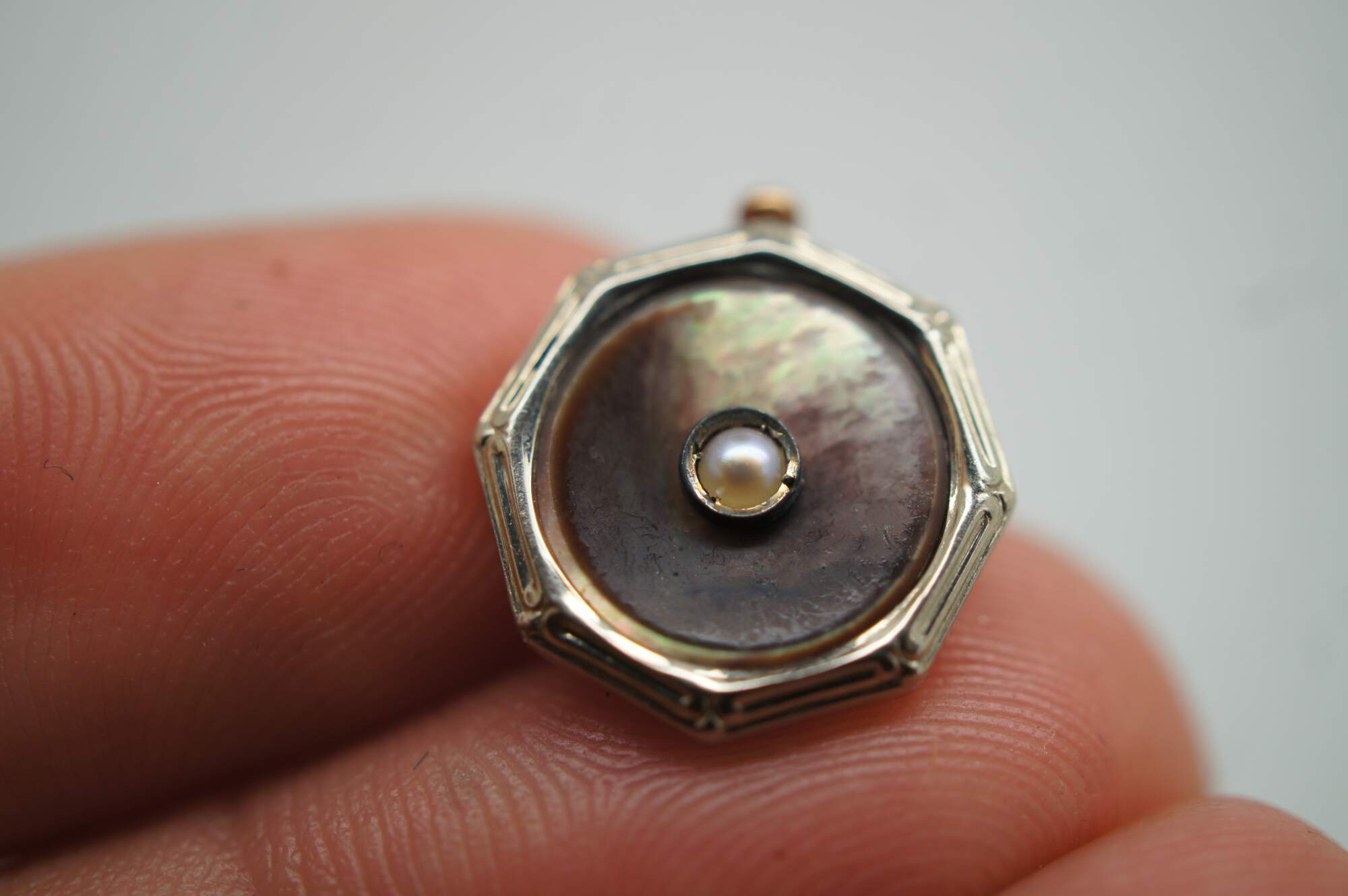 Vintage 10k gold mother of pearl (mop) cufflinks and button studs featuring octagonal form with central pearls.