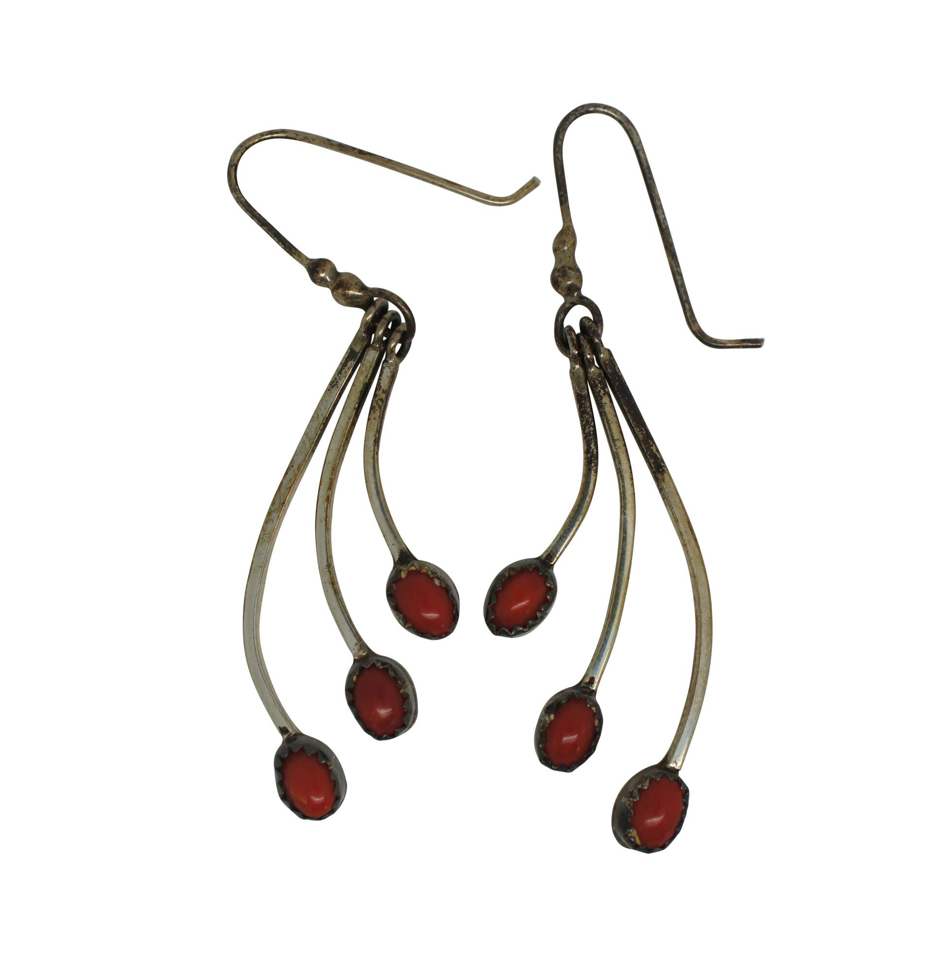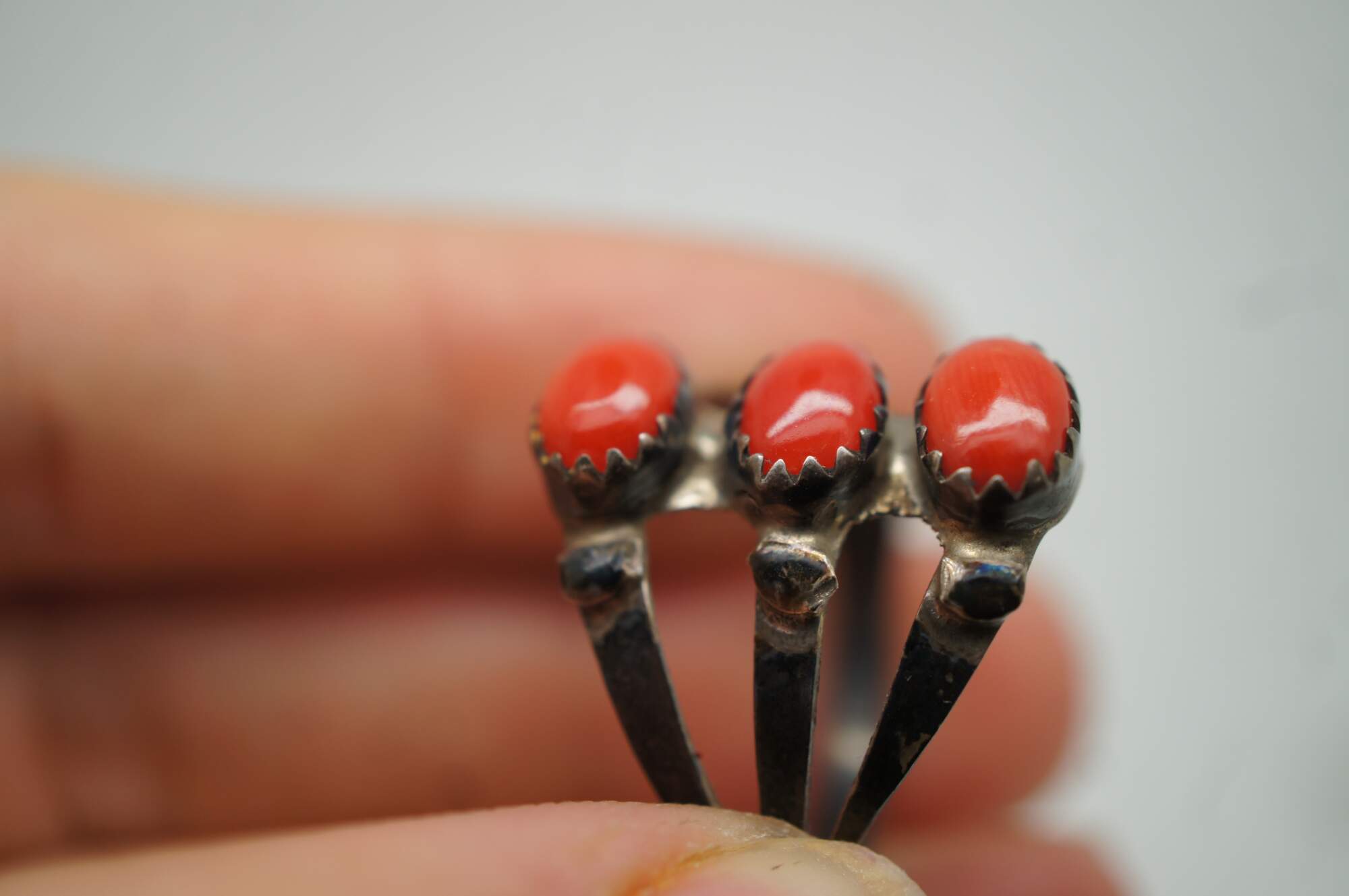 Vintage Native American Southwestern Navajo sterling silver coral ring and earring set featuring triple coral stacked ring and dangle earrings. Purchased 1960s-1970s in New Mexico.