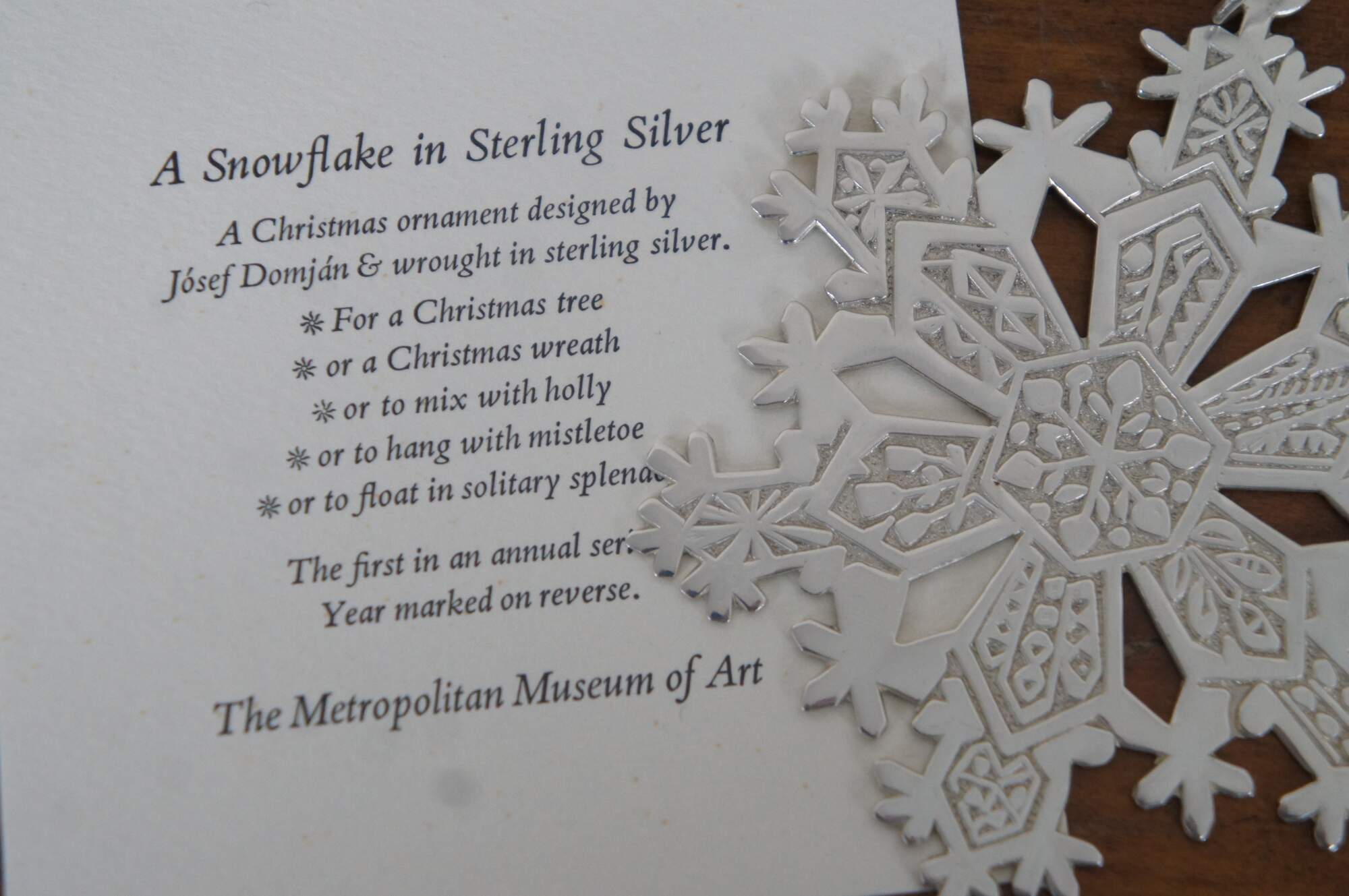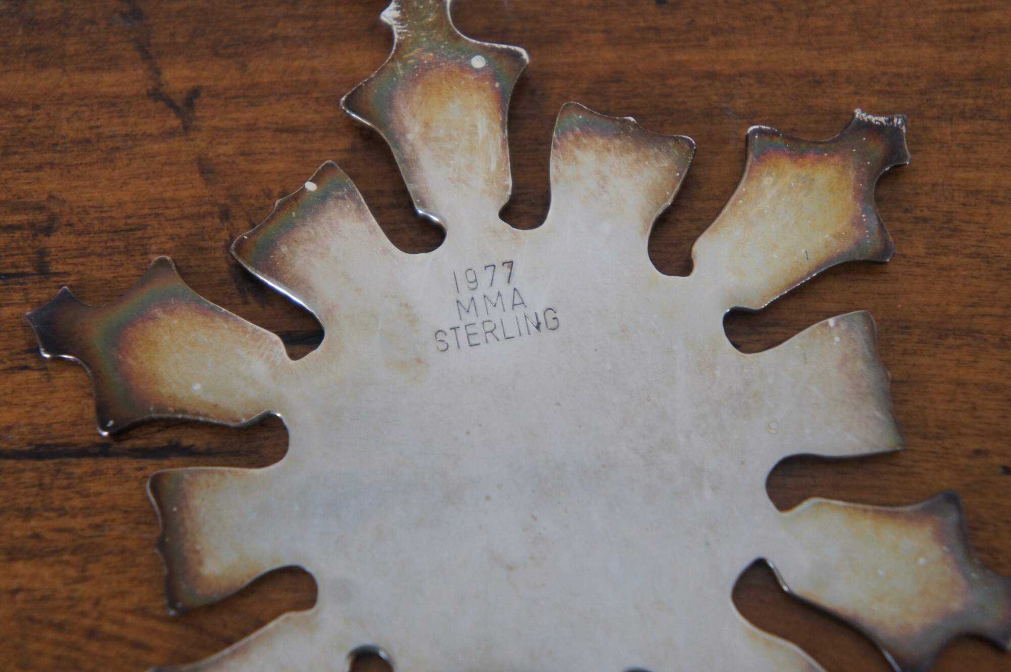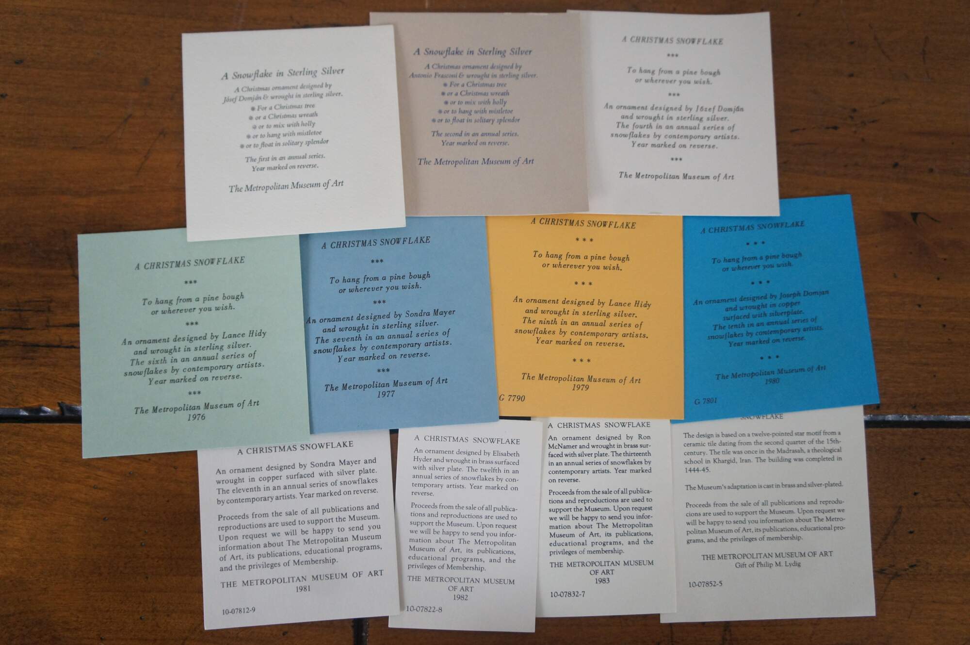 Twelve vintage MMA Christmas tree ornaments featuring reticulated / pierced designs. Includes 1971 (sterling) designed by Josepf Domjan, 1972 (sterling) by Antonio Frasconi, 1974 (sterling) by Jozef Domjan, 1976 (sterling) by Lance Hidy, 1977 (sterling) by Sondra Mayer, 1979 (sterling) by Lance Hidy, 1980 (silverplate) by Joseph Domjan, 1981 (silverplate) by Sondra Mayer, 1982 (silverplate) by Elisabeth Hyder, 1983 (silverplate) by Ron McNamer, 1984 (silverplate) from a motif on an 18th century cittern, and 1985 (silverplate) from a 15th century ceramic tile.