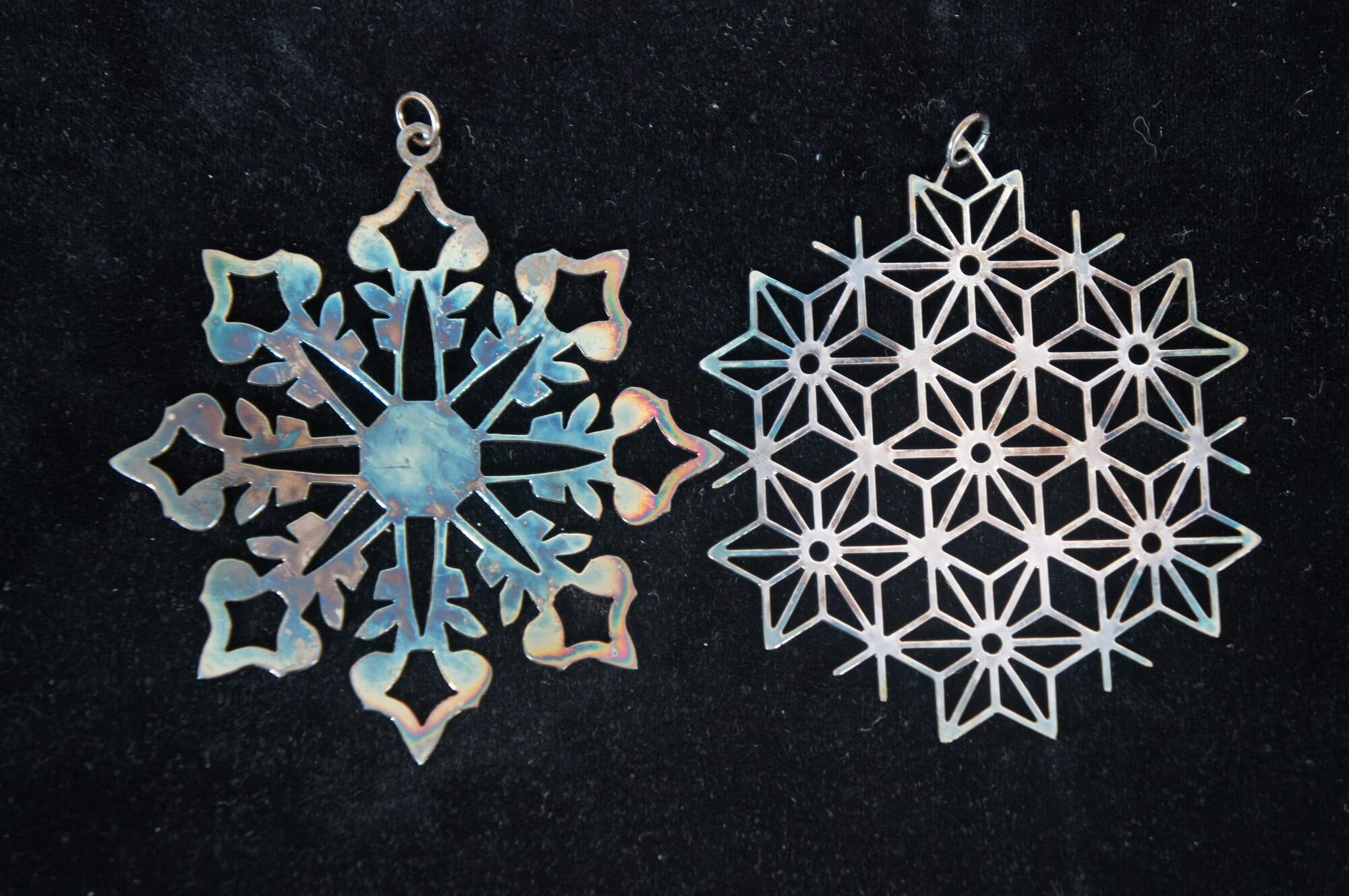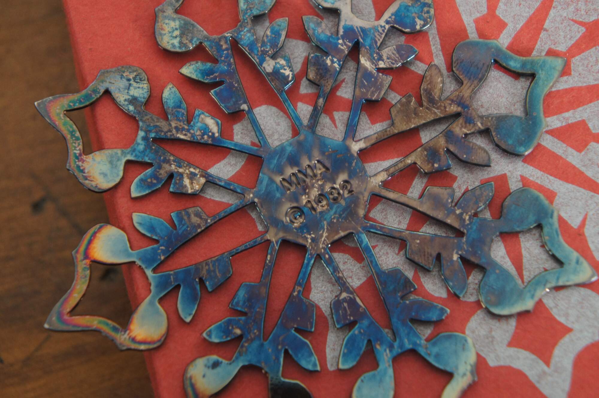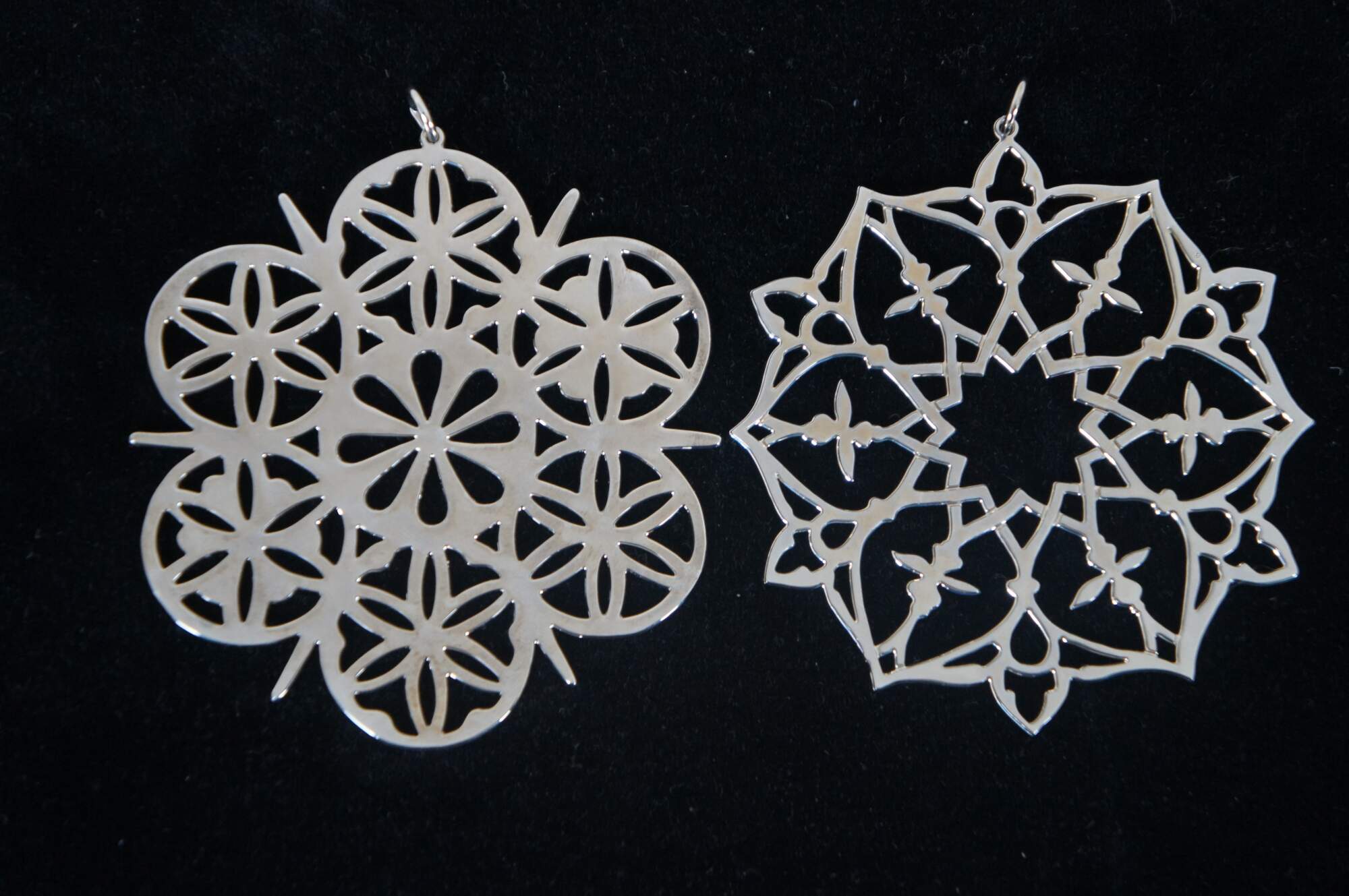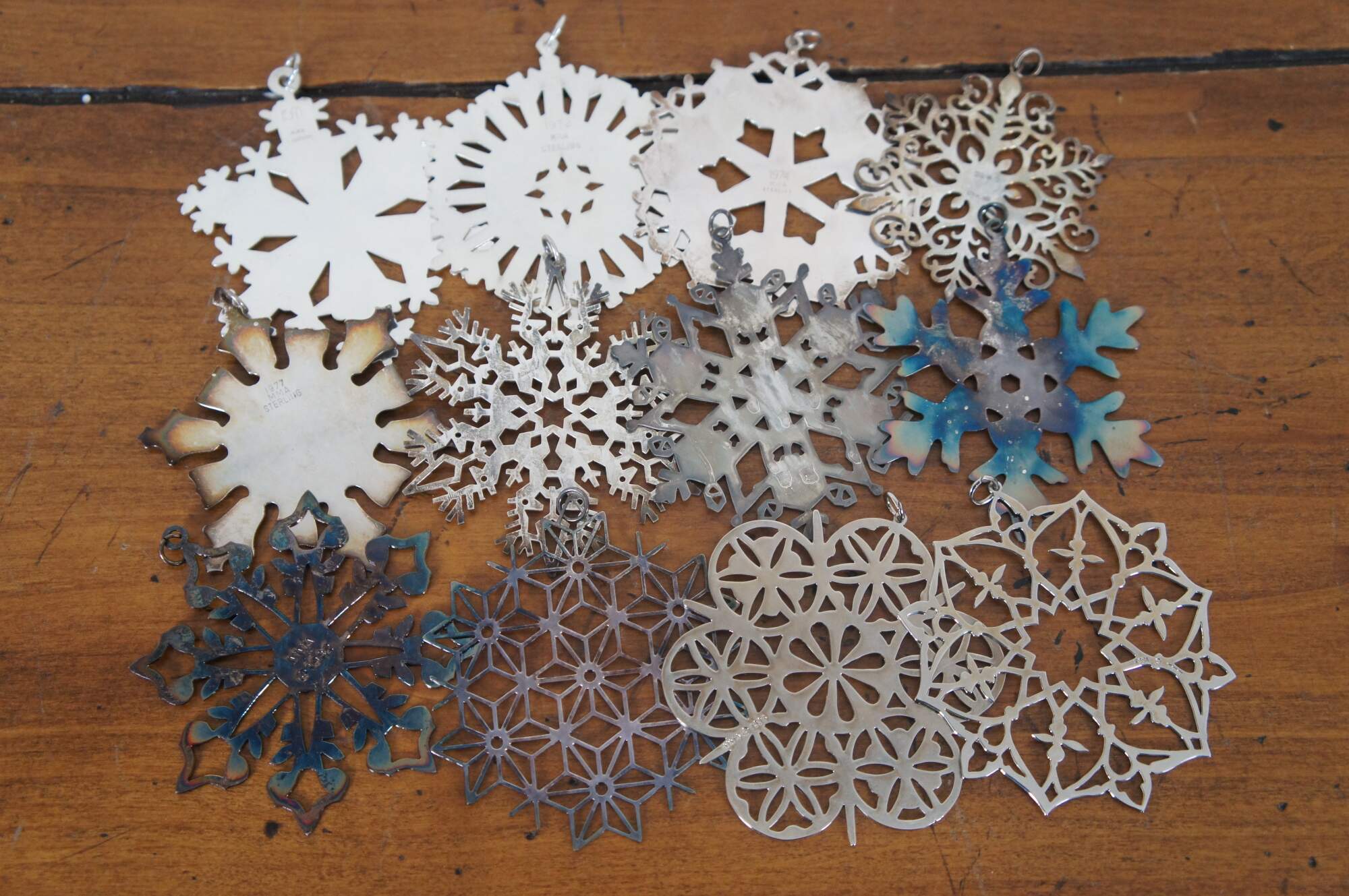 Twelve vintage MMA Christmas tree ornaments featuring reticulated / pierced designs. Includes 1971 (sterling) designed by Josepf Domjan, 1972 (sterling) by Antonio Frasconi, 1974 (sterling) by Jozef Domjan, 1976 (sterling) by Lance Hidy, 1977 (sterling) by Sondra Mayer, 1979 (sterling) by Lance Hidy, 1980 (silverplate) by Joseph Domjan, 1981 (silverplate) by Sondra Mayer, 1982 (silverplate) by Elisabeth Hyder, 1983 (silverplate) by Ron McNamer, 1984 (silverplate) from a motif on an 18th century cittern, and 1985 (silverplate) from a 15th century ceramic tile.
