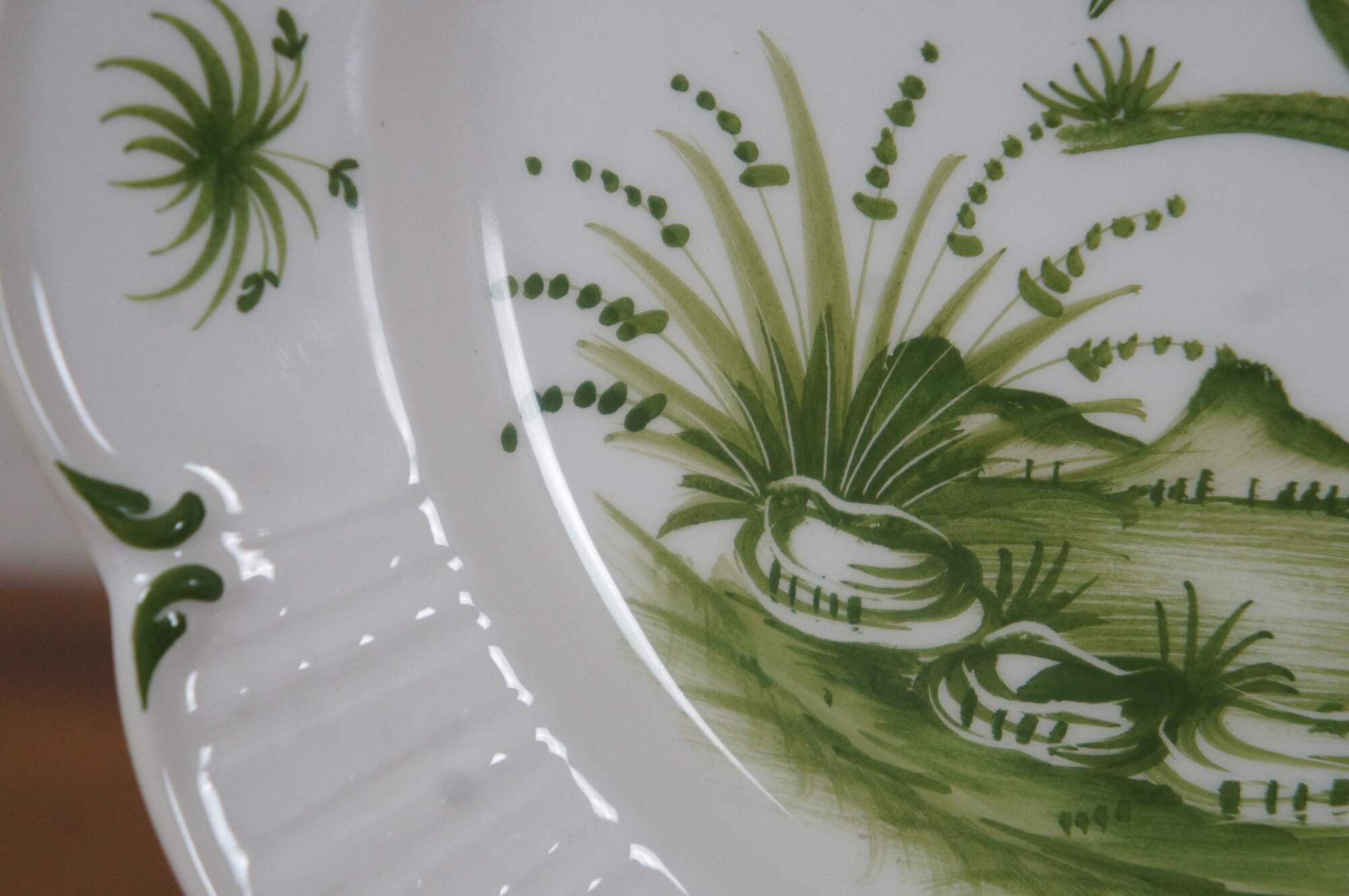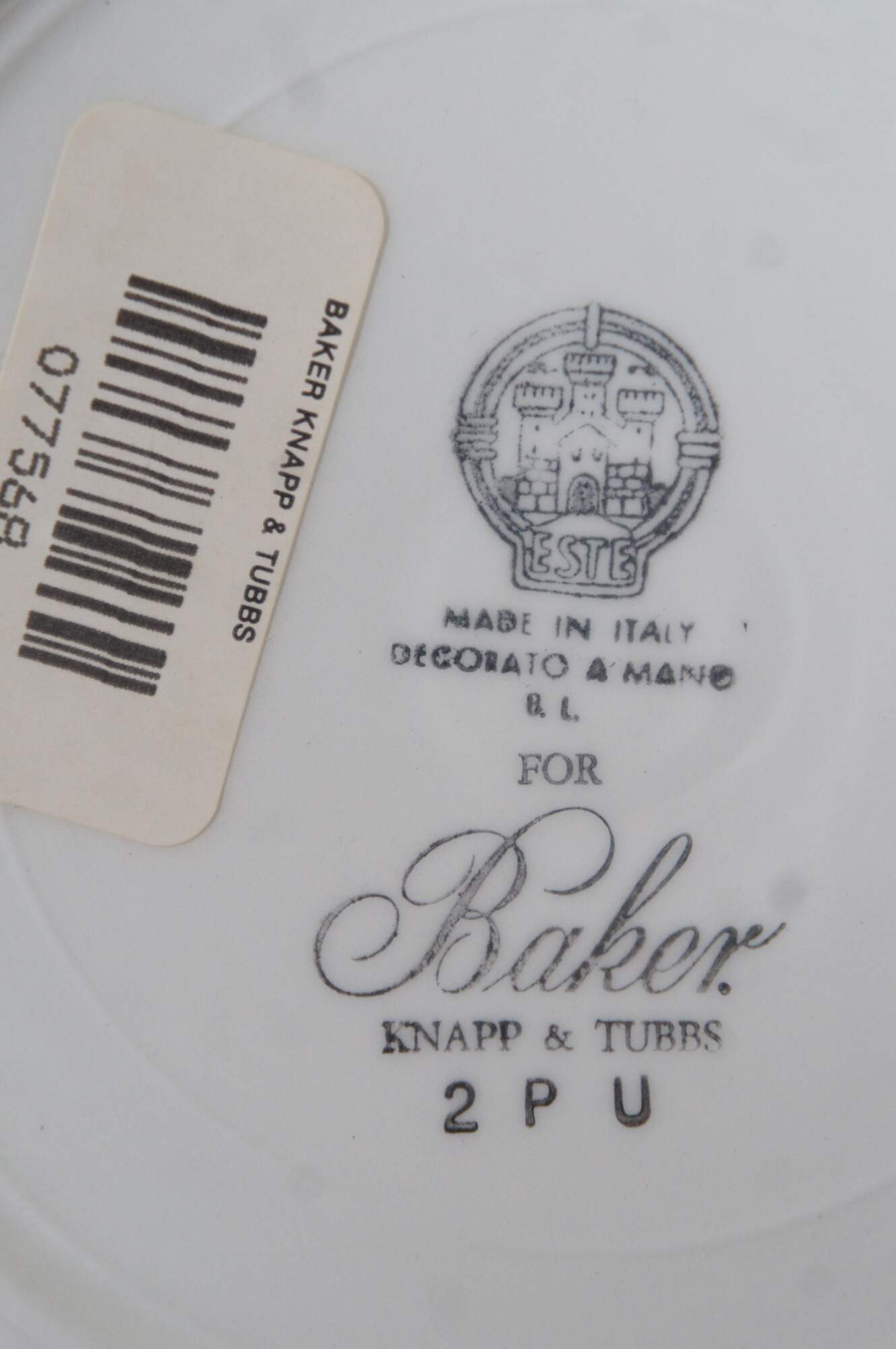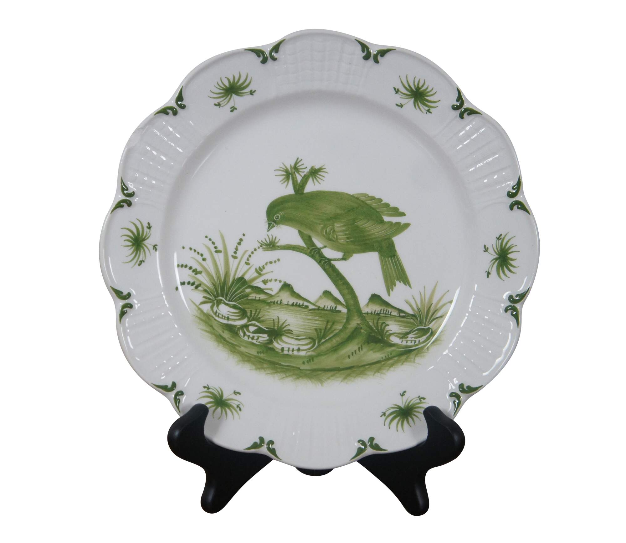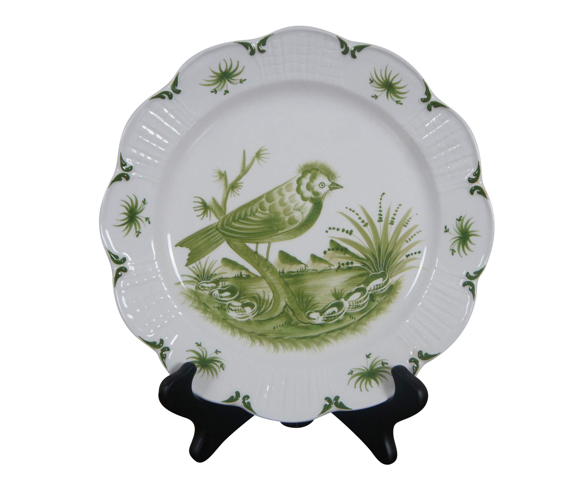 Pair of Vintage Baker Knapp & Tubbs Italian porcelain plates on stands. Each is Hand Painted in green over ivory. Made by Este porcelain for Baker.