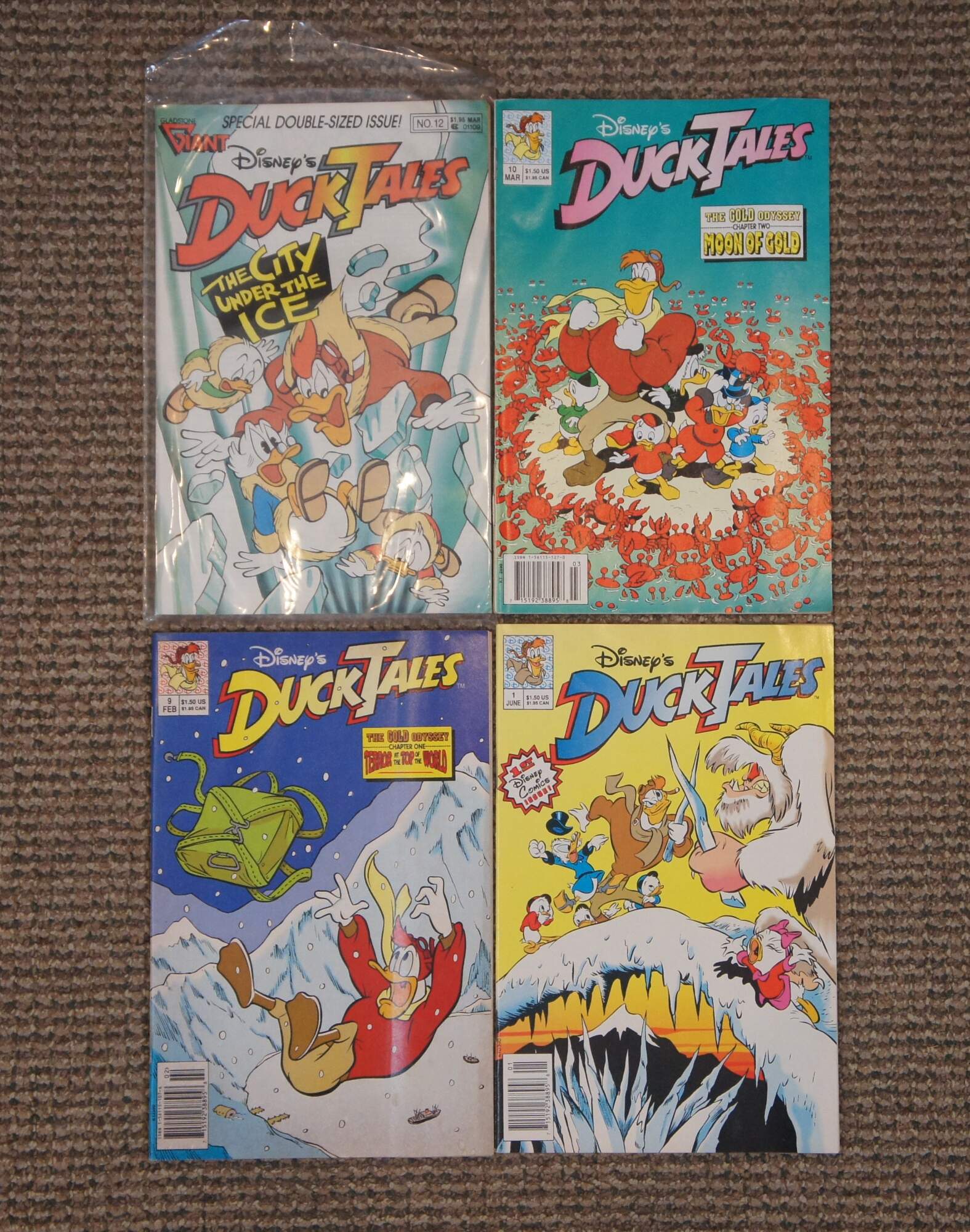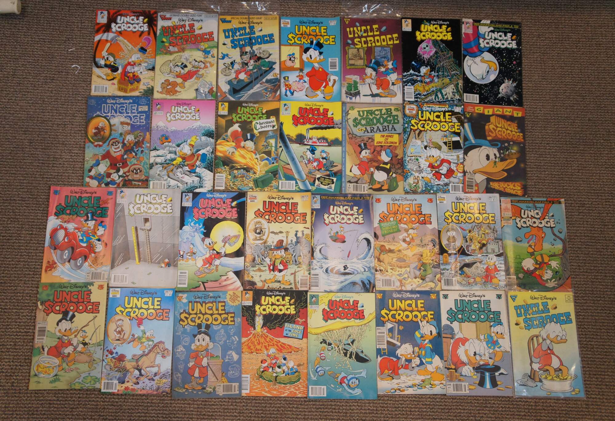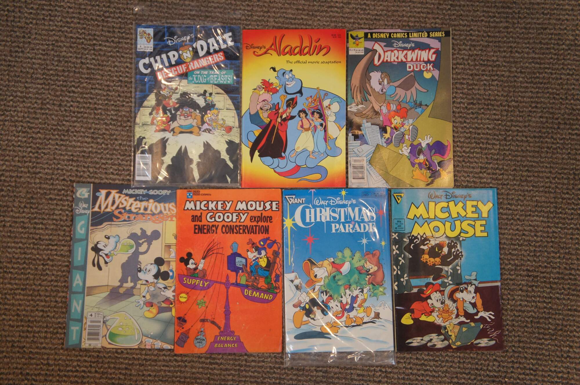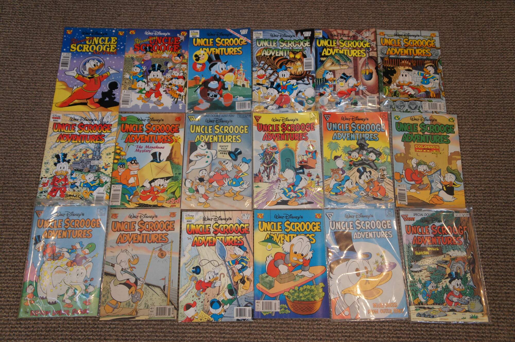 1980s - 1990s Walt Disney comics. 19 Donald Duck, 29 Donald Duck Adventures, 13 Donald and Mickey, 23 Comics and Stories (featuring Donald), 30 Uncle Scrooge, 16 Uncle Scrooge Adventures, 6 Count Duckula, 4 Ducktales, 1 Darkwing Duck, 1 Christmas Parade (featuring Donald), 3 Spanish language mini comics (Pato Donald, Tio Rico, and Mickey), 2 Mickey and Goofy (one 1978), 2 The Adventurous Scrooge McDuck, 1 Mickey Mouse, 1 Chip n' Dale Rescue Rangers, 1 Aladdin: The Official Movie Adaptation
