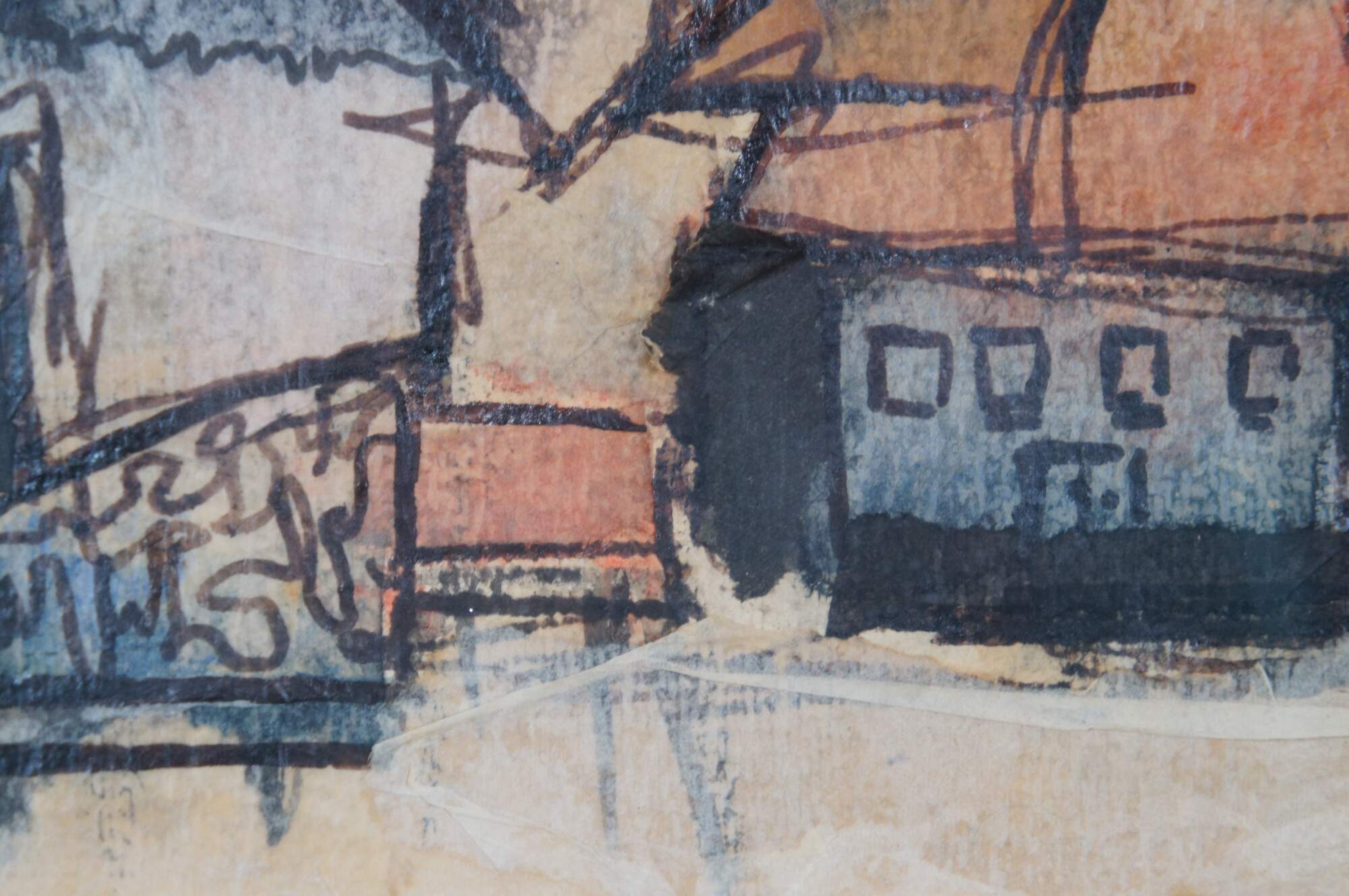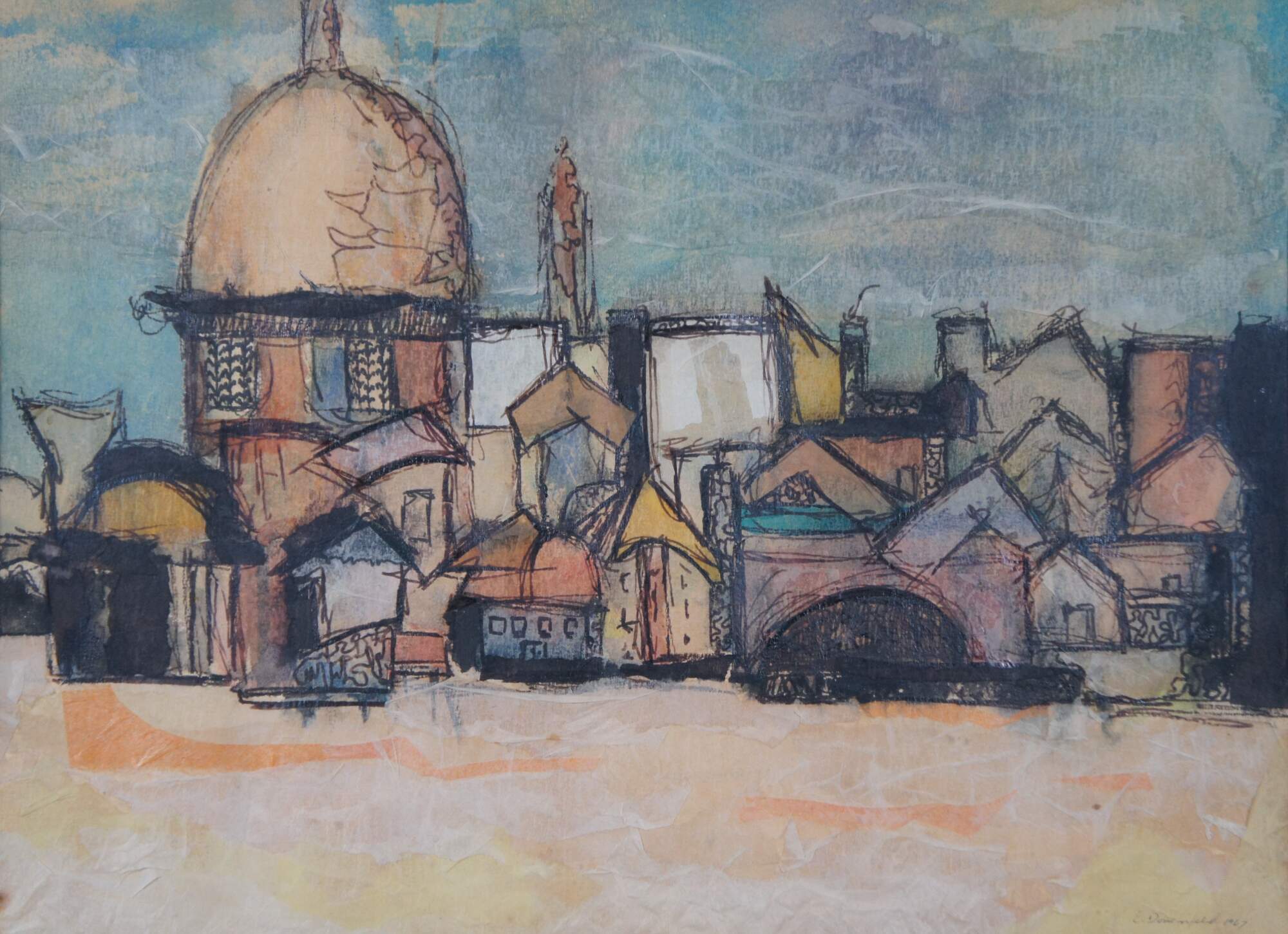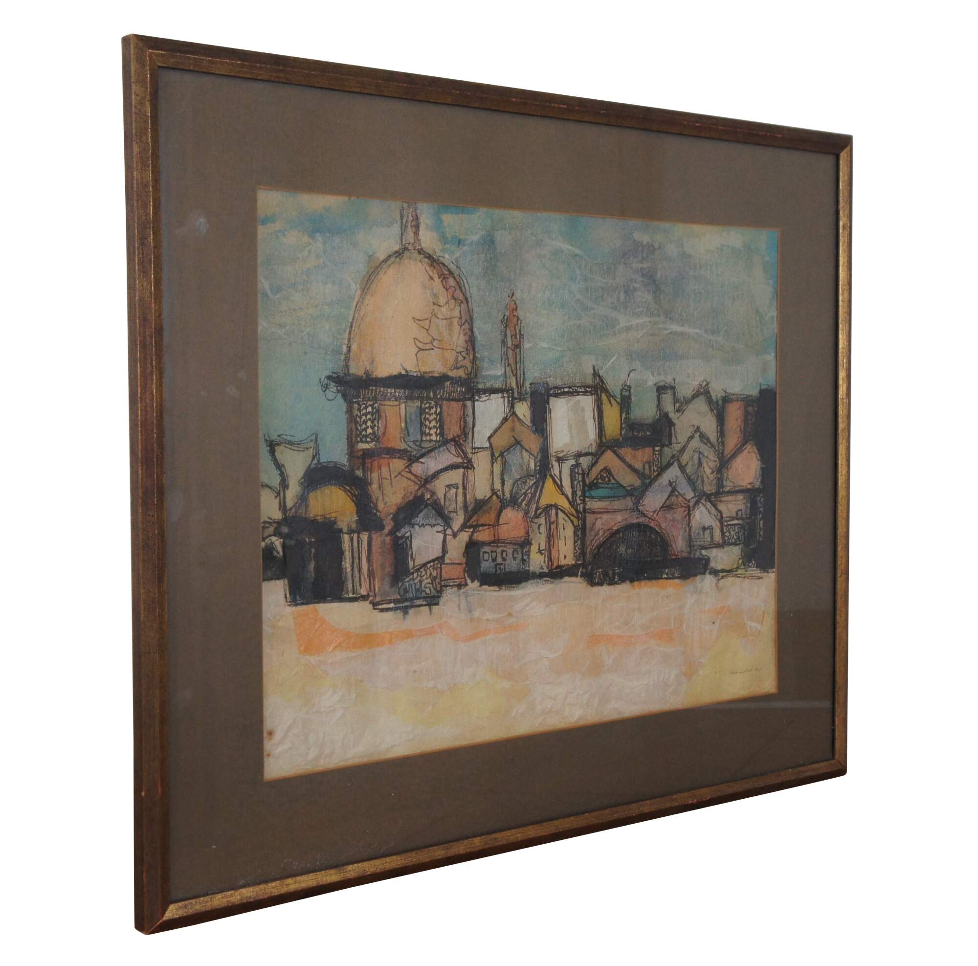 A beautiful abstract cityscape painting by Elaine Donenfeld from 1967. The watercolor is on paper and features a town with a domed temple. Signed lower right. Framed and matted.