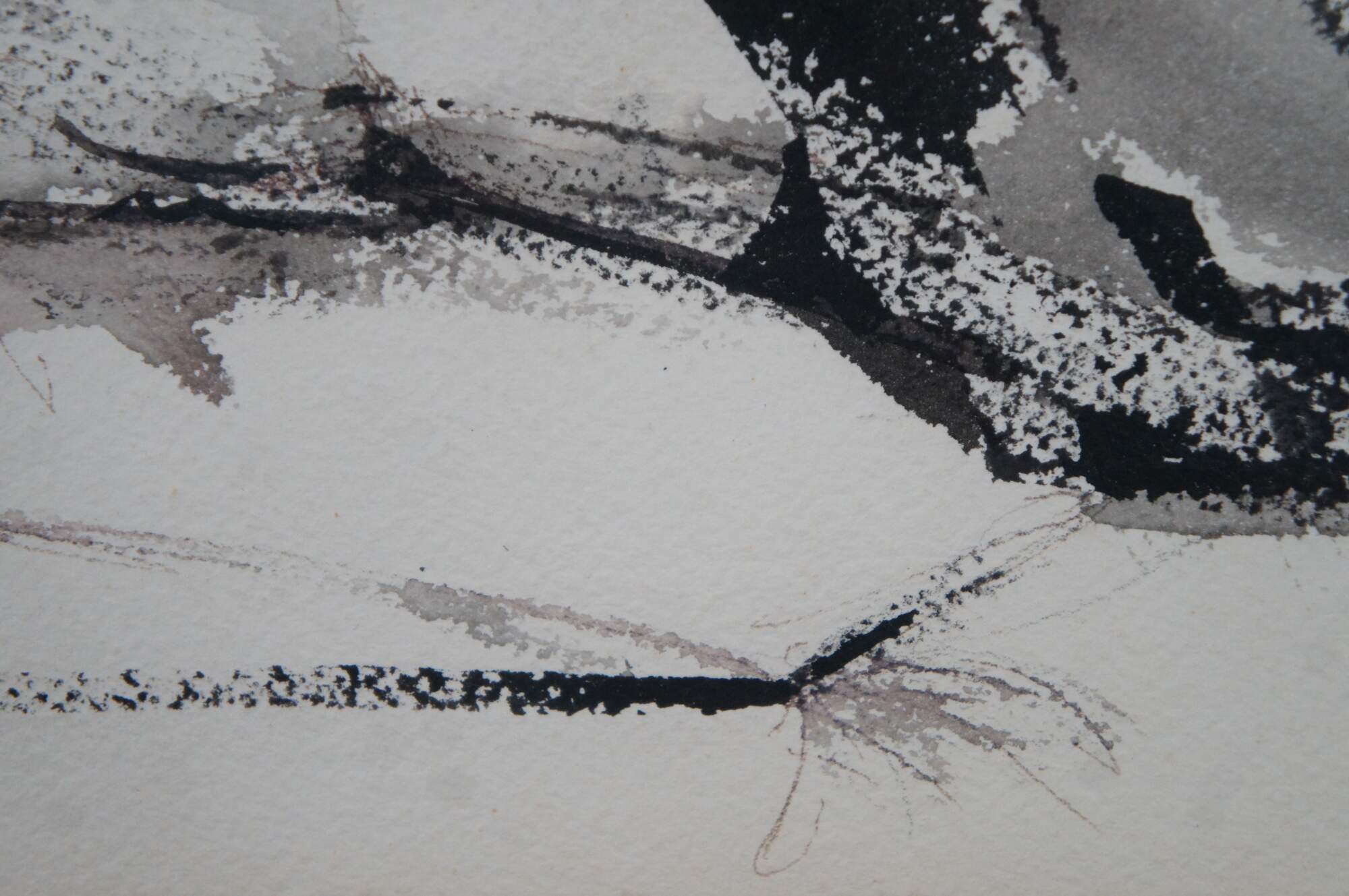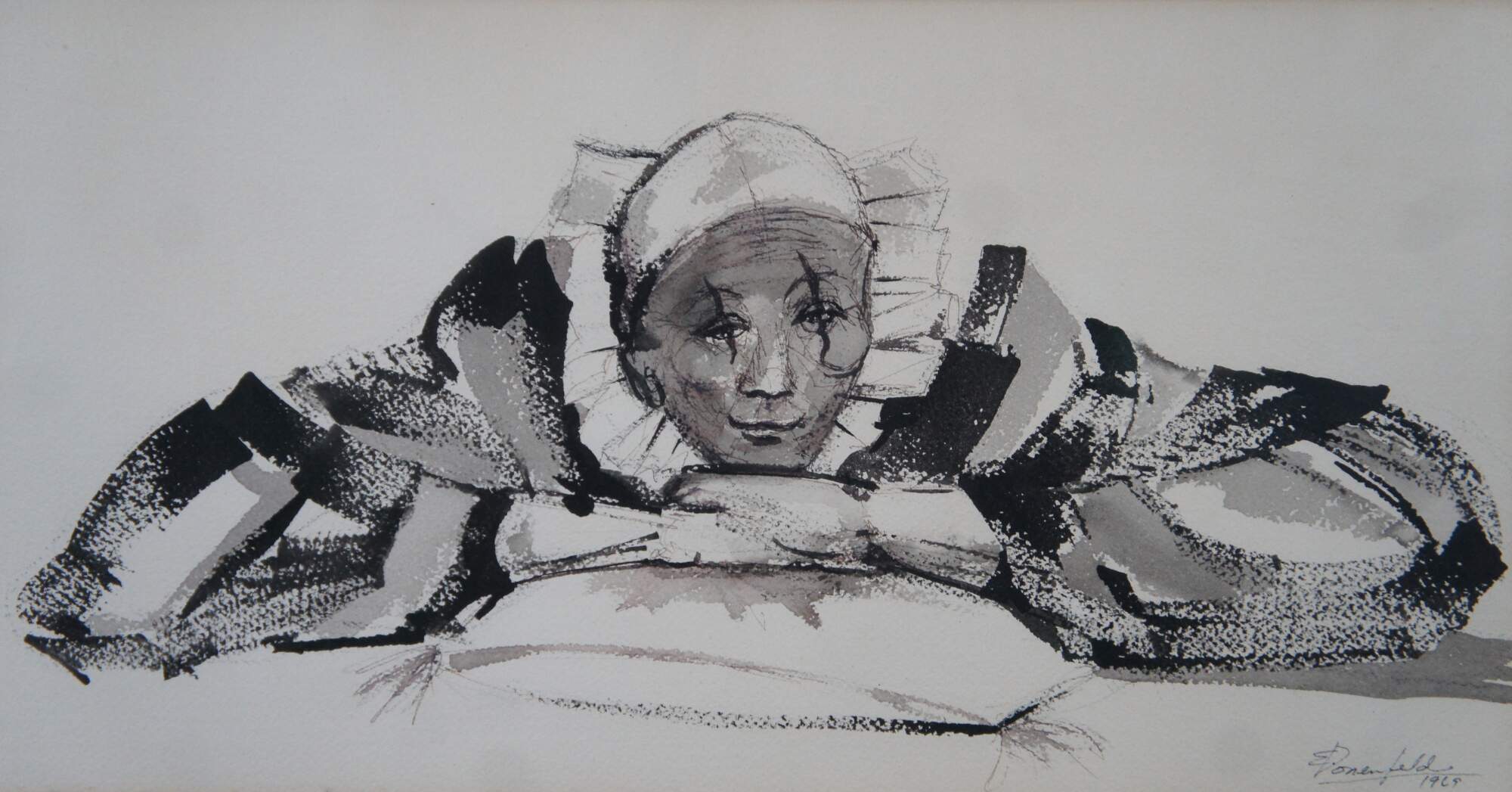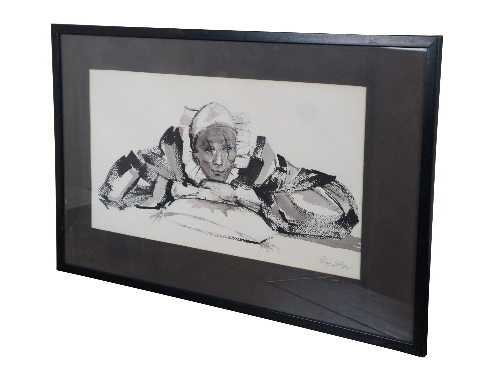 A creative portrait painting by Elaine Donenfeld from 1969. The watercolor is on paper and features a clown in B + W resting on a pillow.. Signed lower right. Framed and matted.