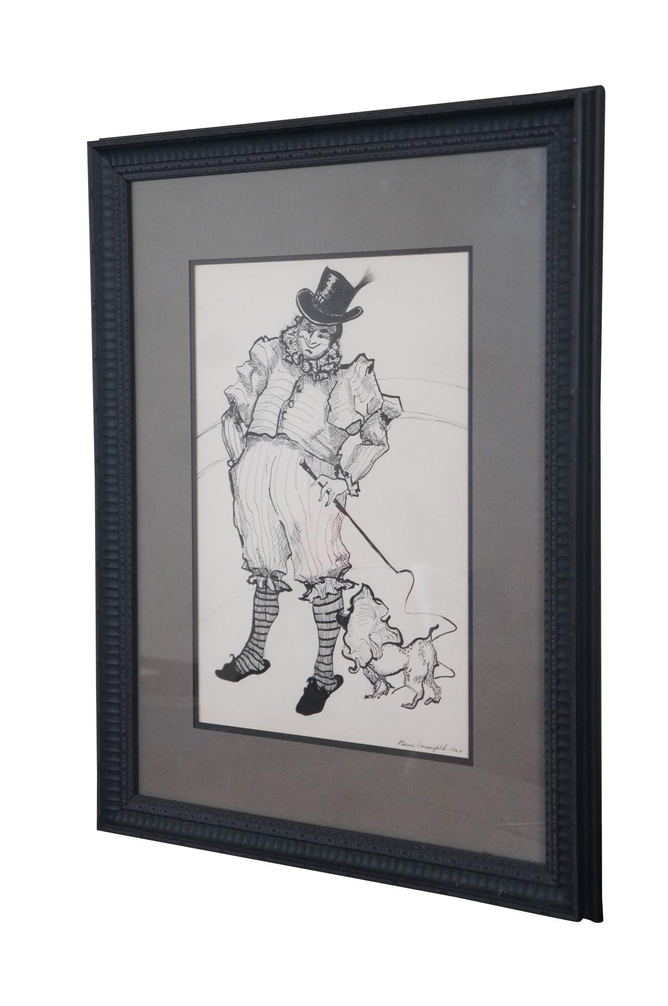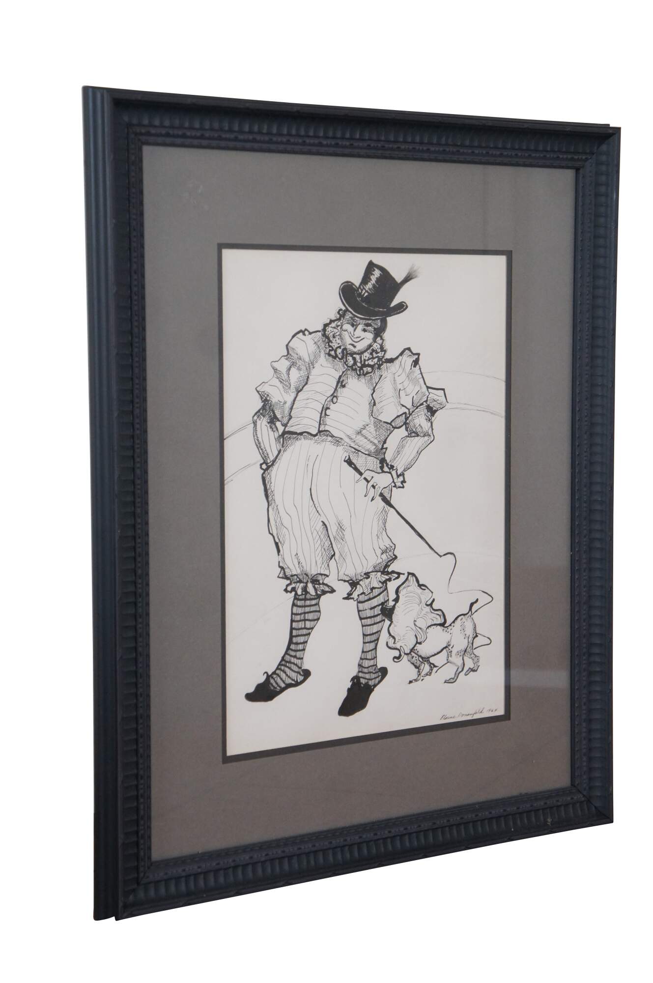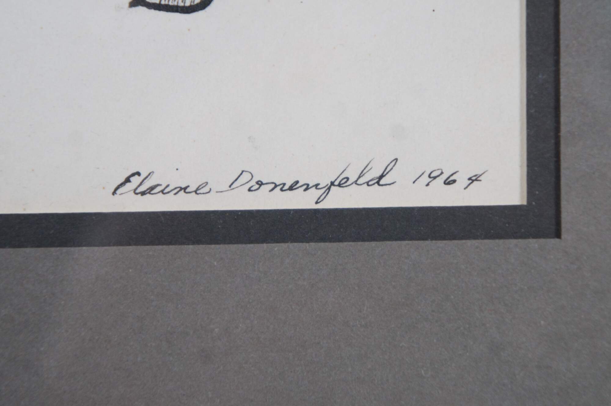A creative portrait drawing by Elaine Donenfeld from 1964. The ink drawing is on paper and features a circus lion tamer in B + W with pet. Signed lower right. Framed in green and matted. Elaine Levine Denenfeld (1928 - 2007). Born in Dayton, Ohio Dayton, A graduate of Traphagan School of Design in New York, Elaine was a life long artist arid a much loved jewelry designer. Married to Stanley Donenfeld, Co-Owner of Donenfeld Inc, a departments store that opened in the 1920s.
