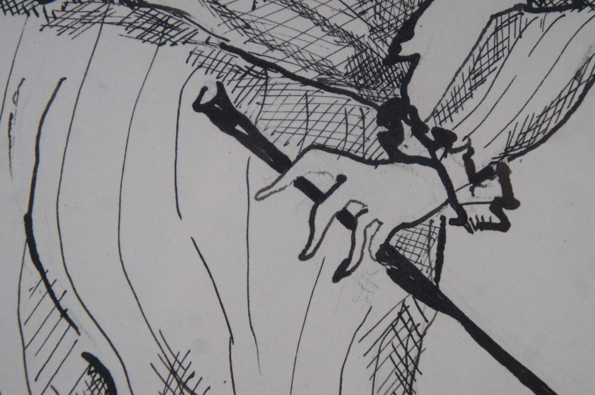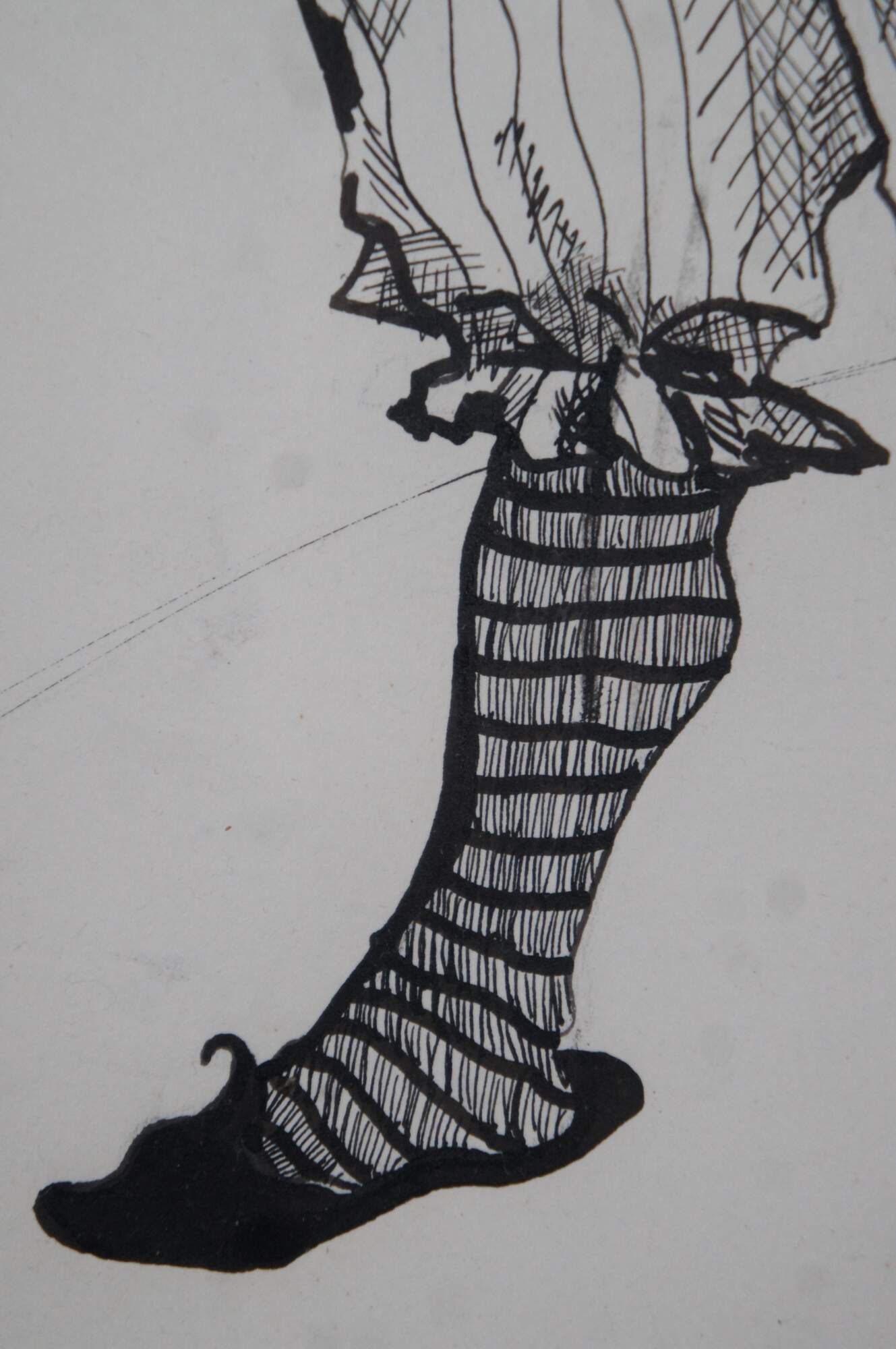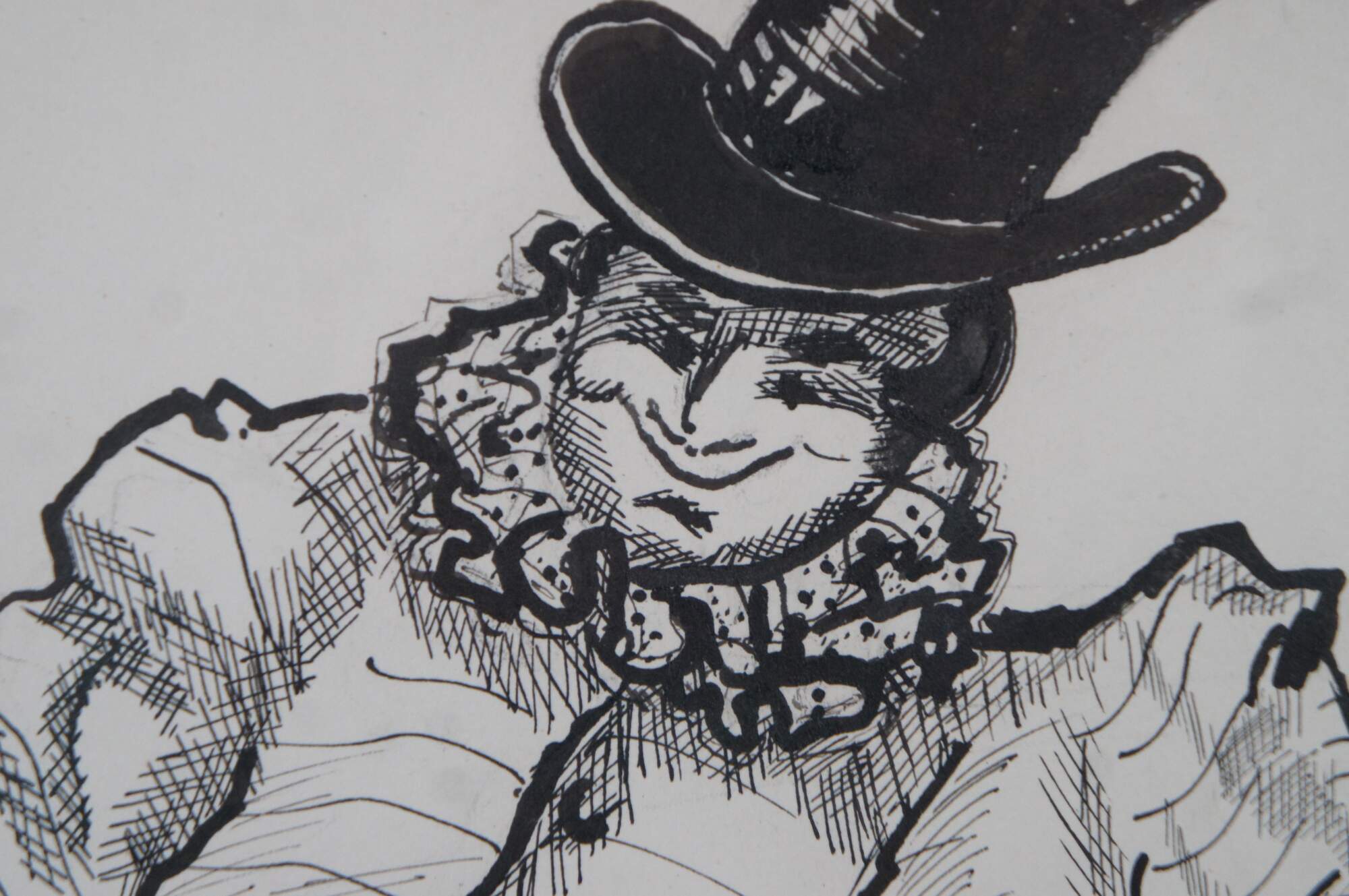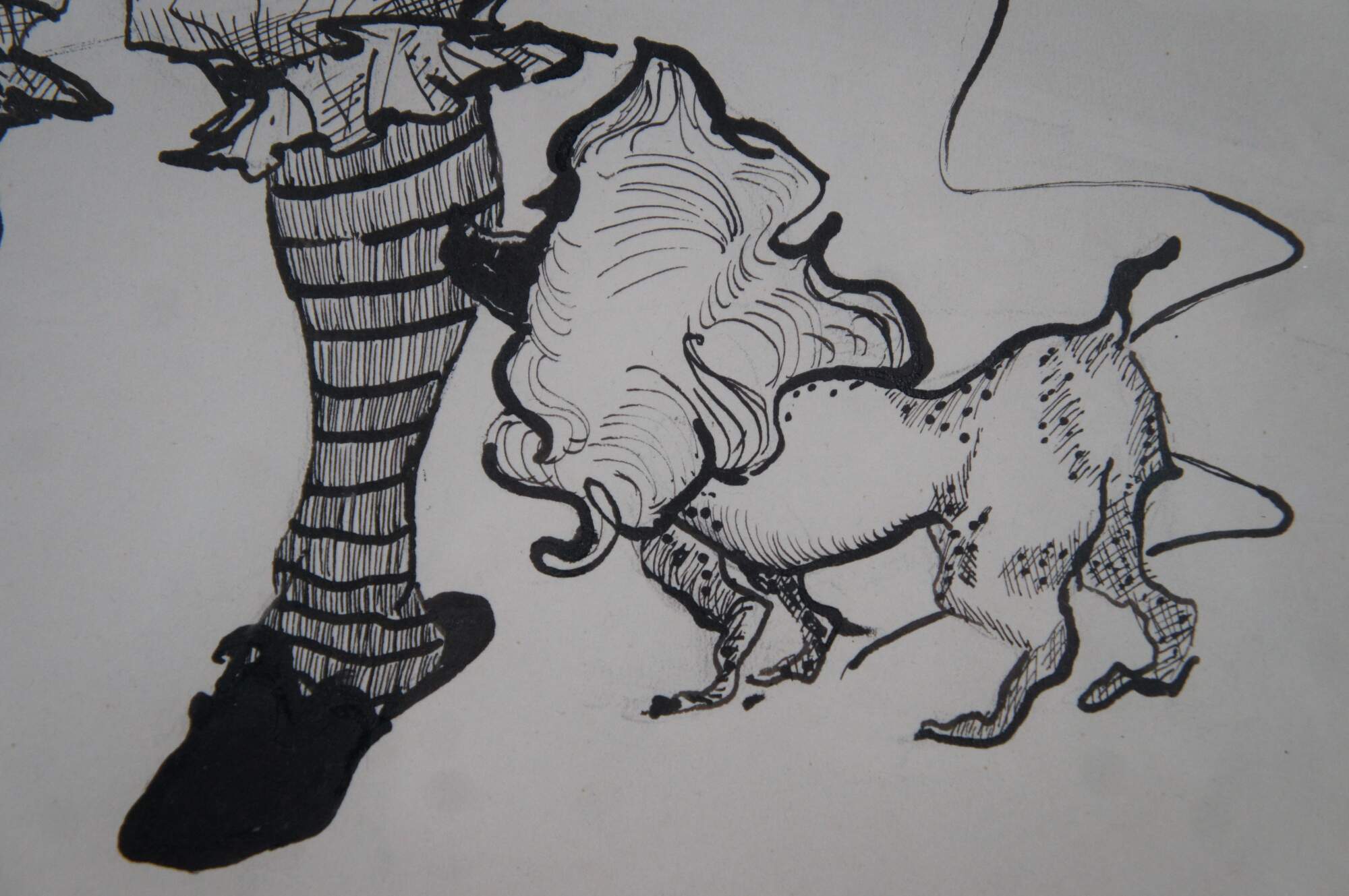 A creative portrait drawing by Elaine Donenfeld from 1964. The ink drawing is on paper and features a circus lion tamer in B + W with pet. Signed lower right. Framed in green and matted. Elaine Levine Denenfeld (1928 - 2007). Born in Dayton, Ohio Dayton, A graduate of Traphagan School of Design in New York, Elaine was a life long artist arid a much loved jewelry designer. Married to Stanley Donenfeld, Co-Owner of Donenfeld Inc, a departments store that opened in the 1920s.