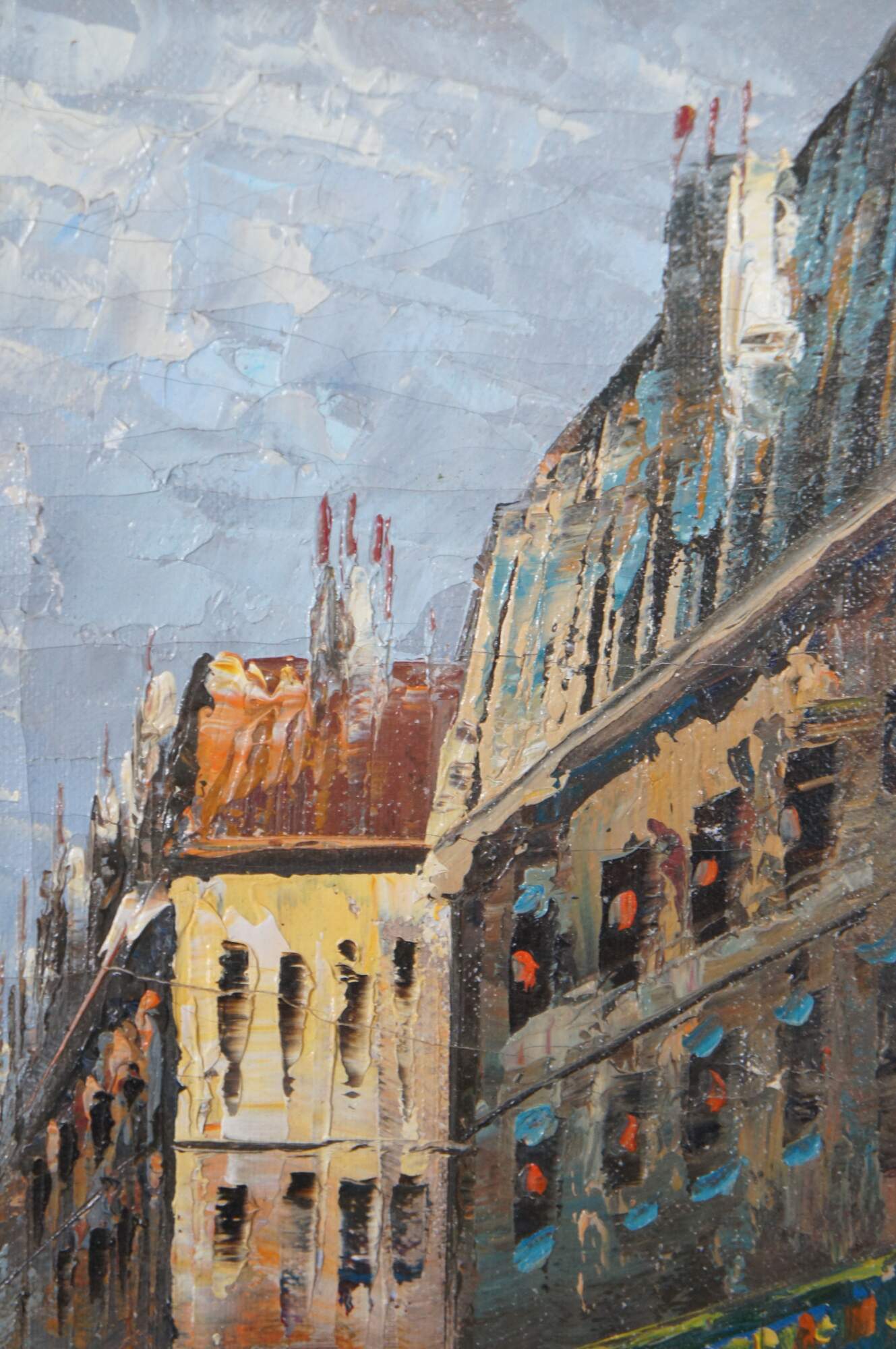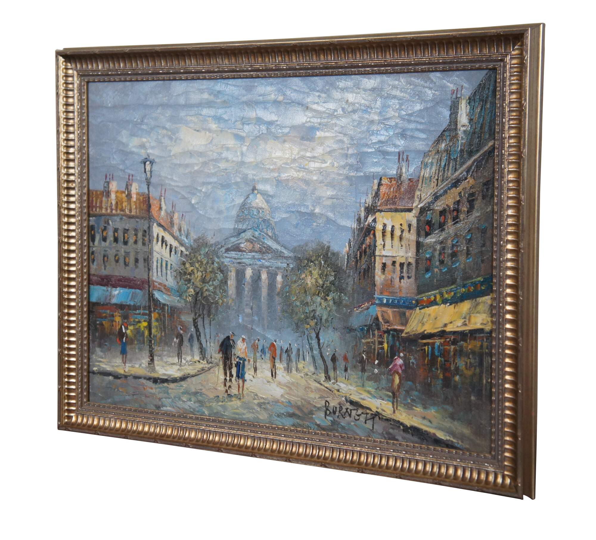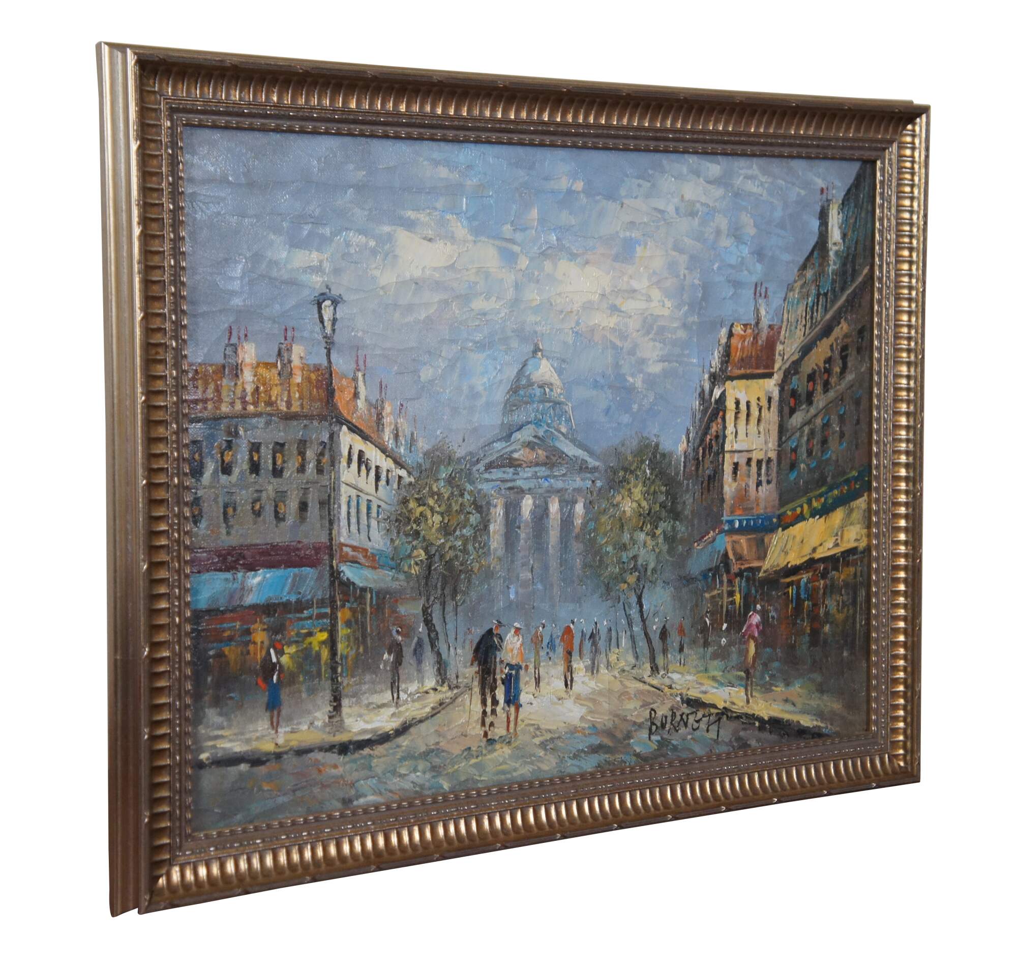 Vintage Parisian Cityscape. Features a crowded street leading up to a capital building. Beautifully detailed with vibrant colors. Signed Lower right with gold frame.