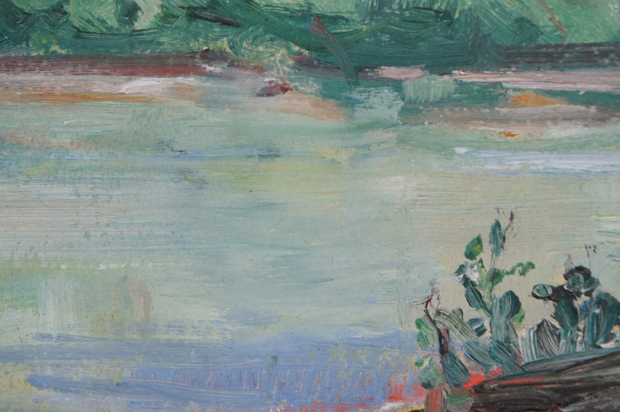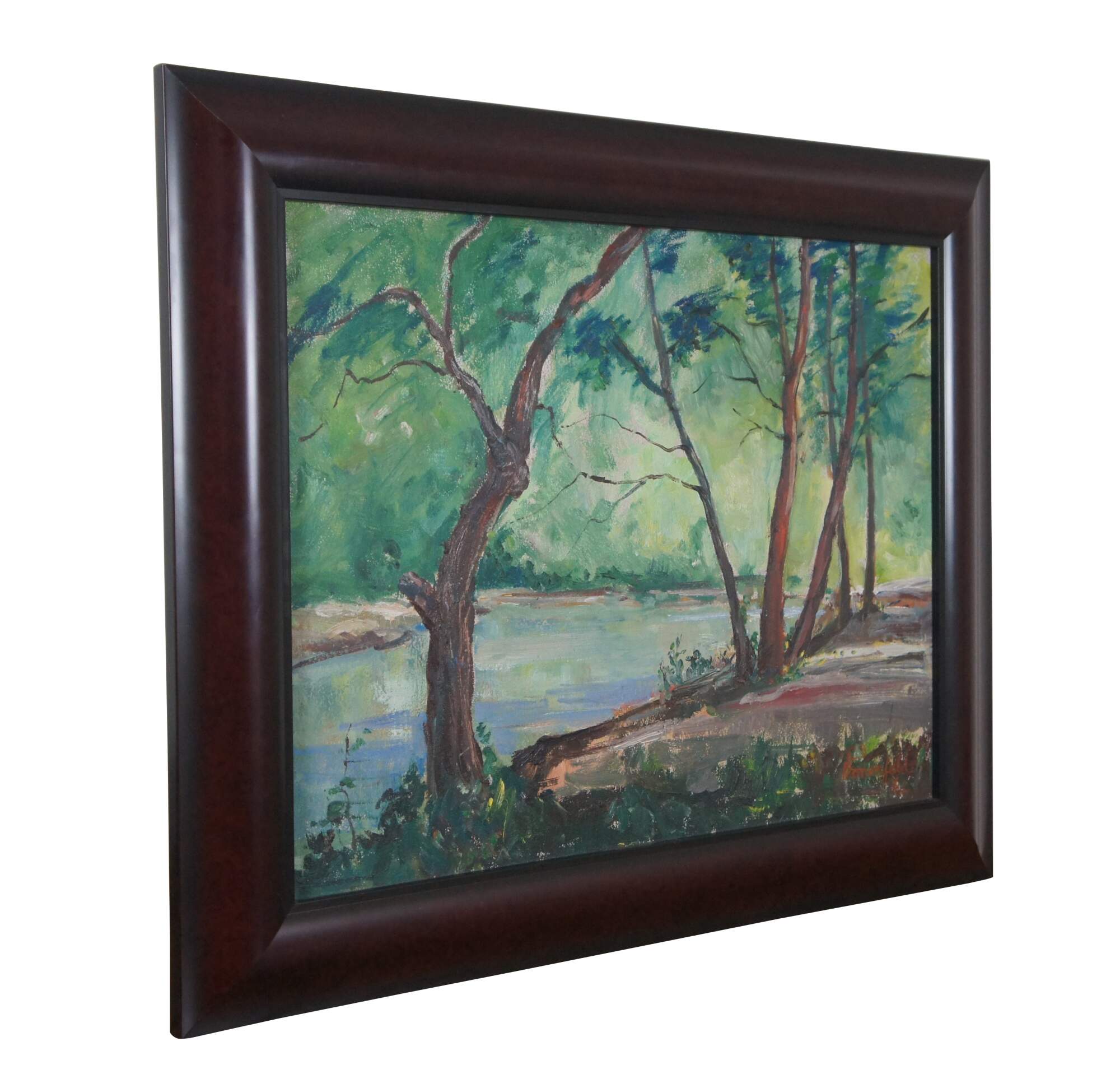 A beautiful Impressionist landscape painting by Elaine Donenfeld from 1962. The oild is painted on board and features a forest setting by the river. Signed lower right. Framed in wood with a red mahogany finish