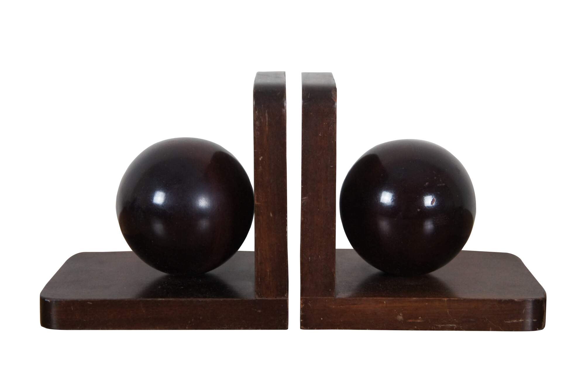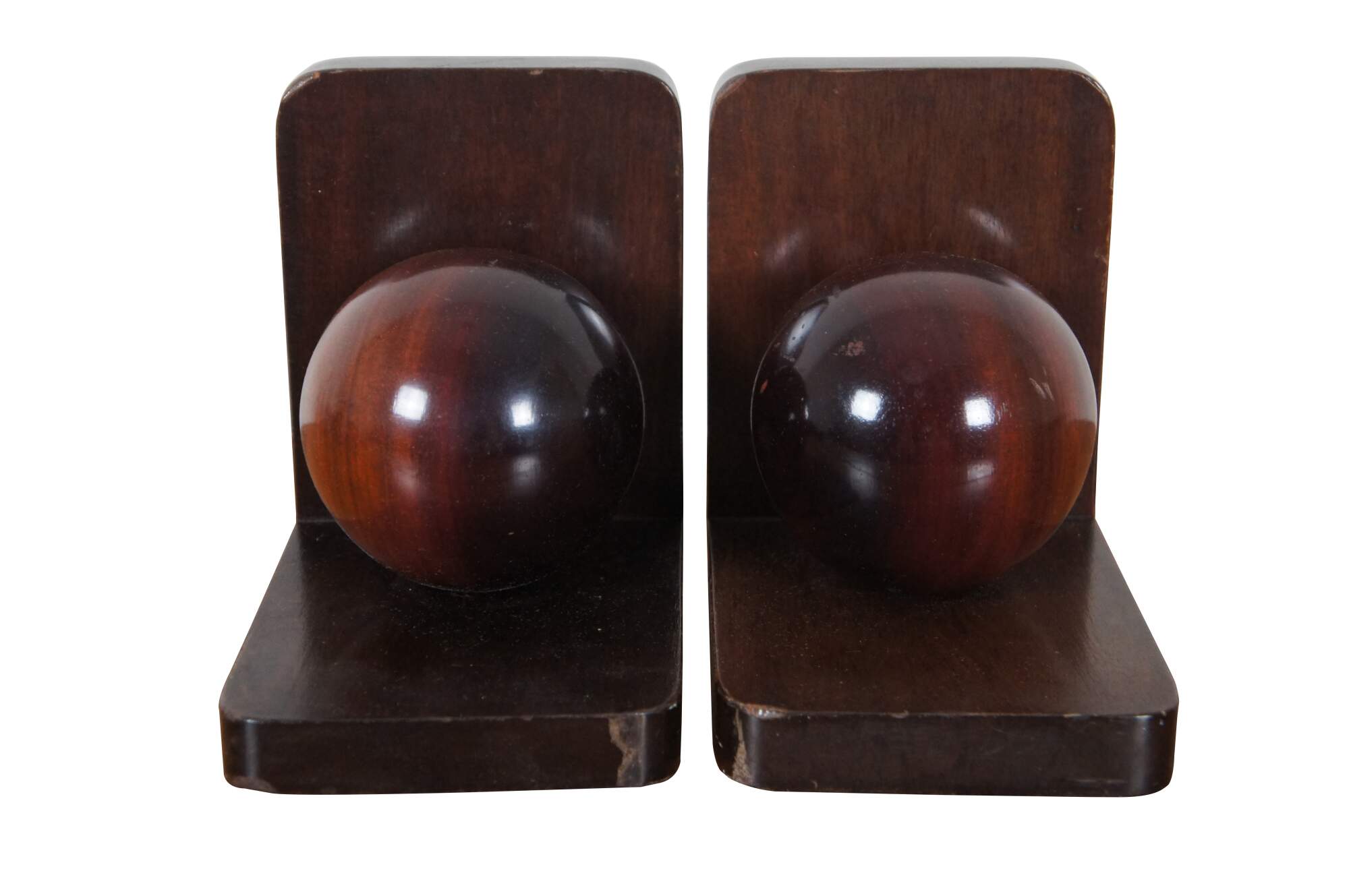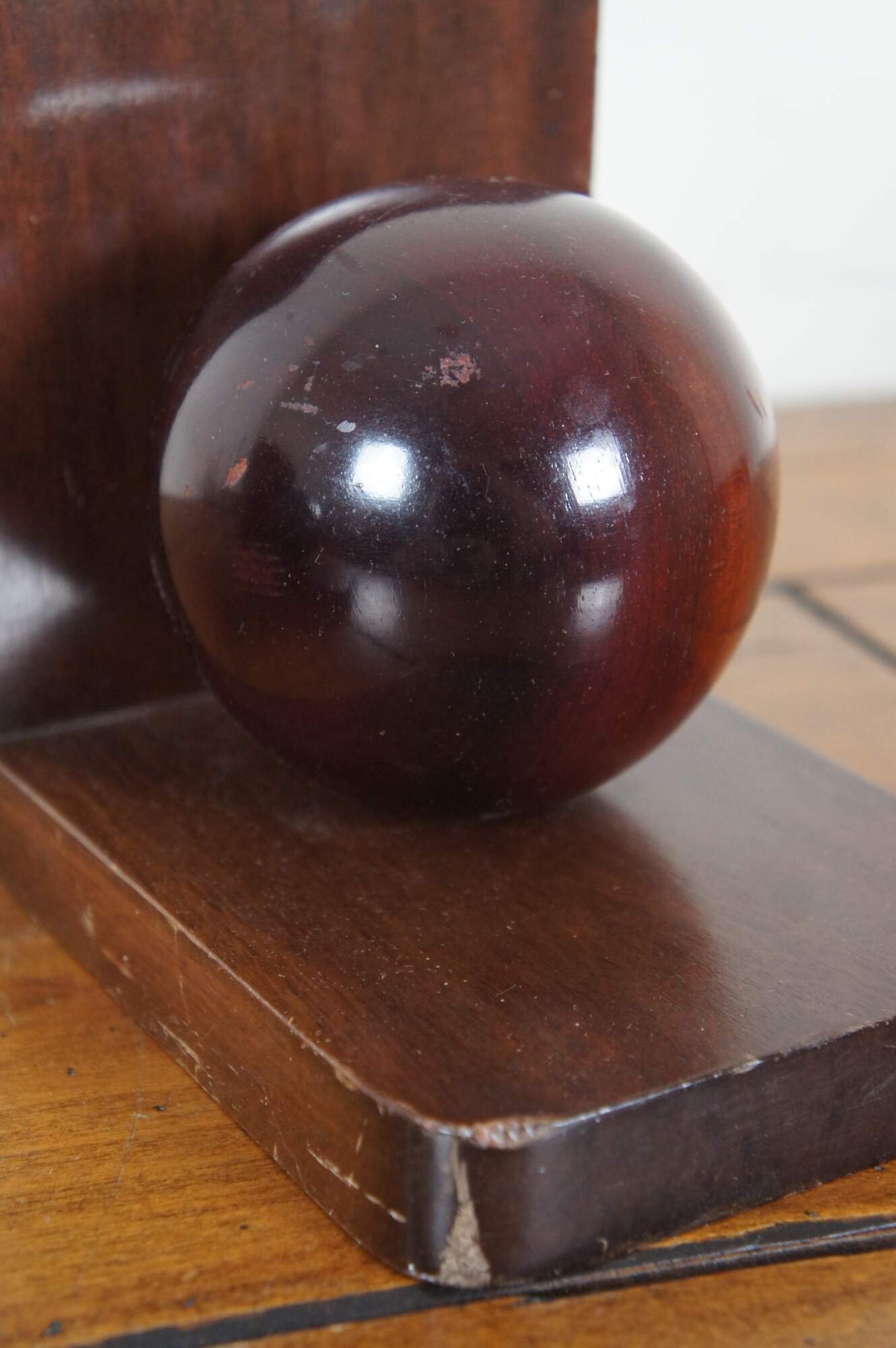 Pair of Art Deco wooden bookends. Made from mahogany with a wooden stand and turned ball.