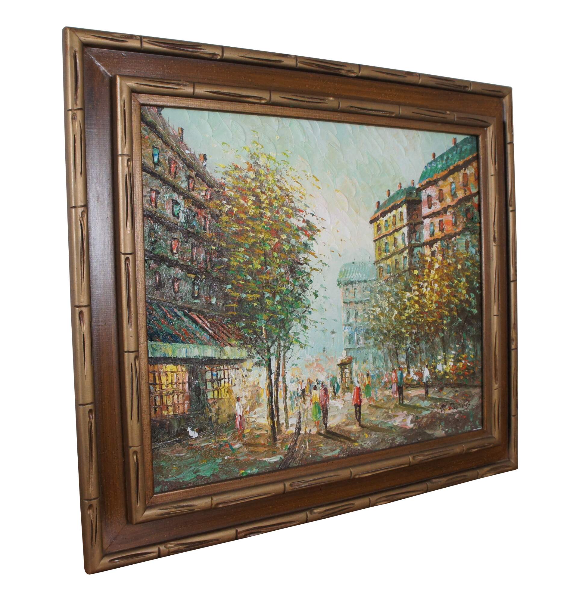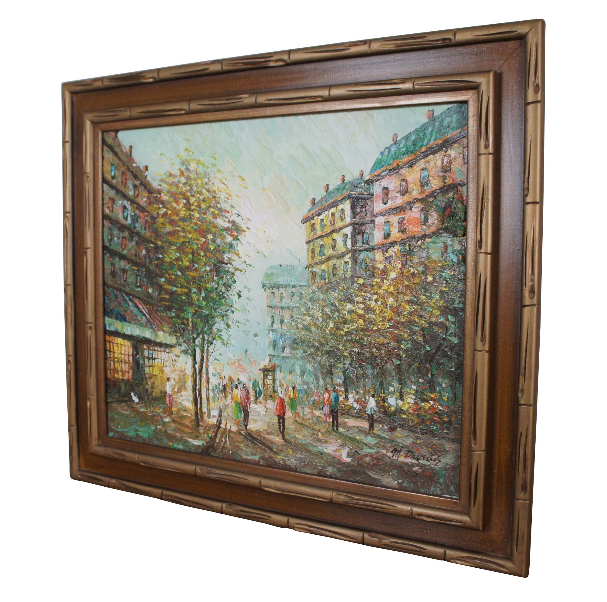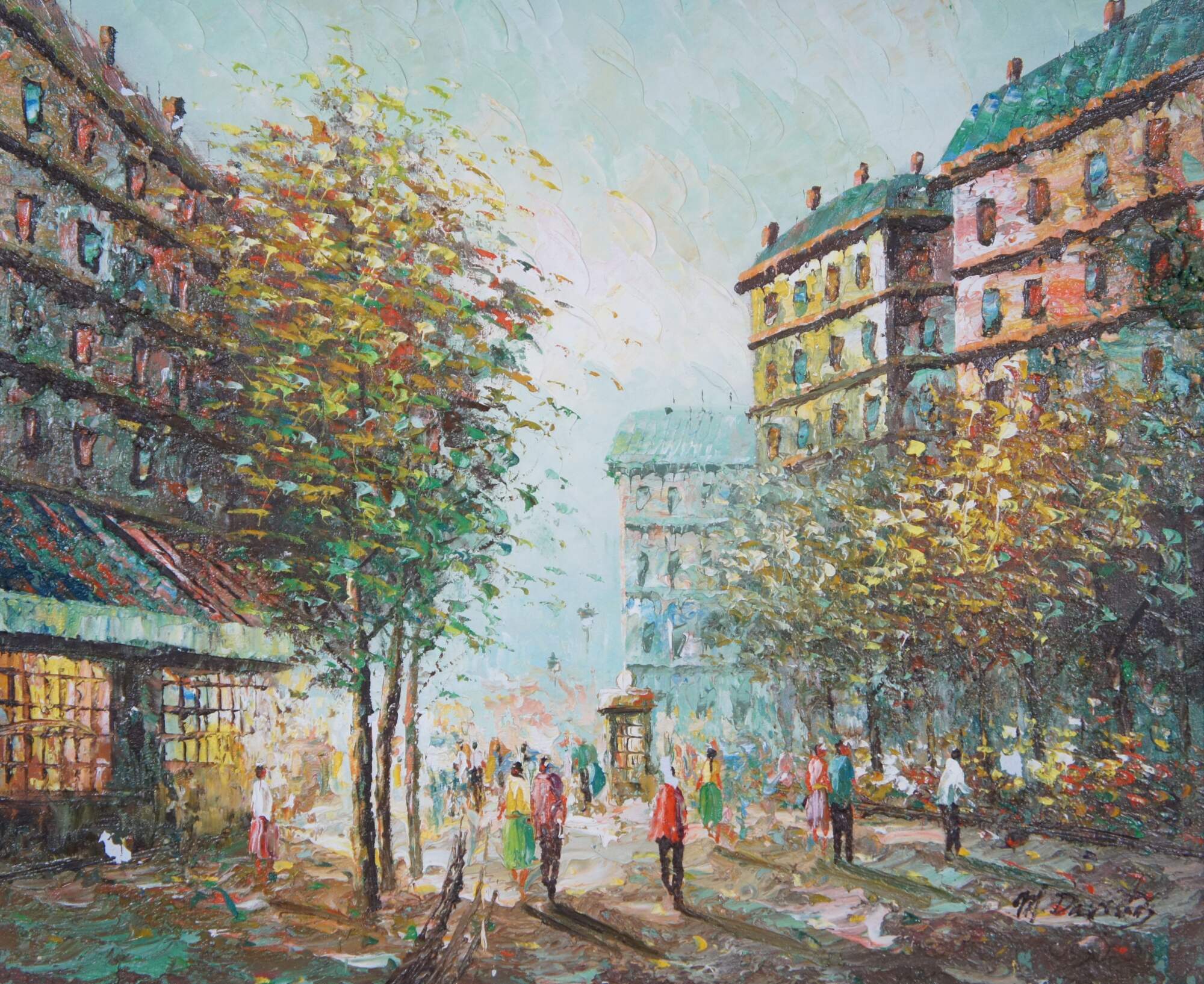 Parisian cityscape painting by M. Davids. An oil on canvas in the streets of Paris. Beautifully painted with exceptional colors. Hand Signed lower right.