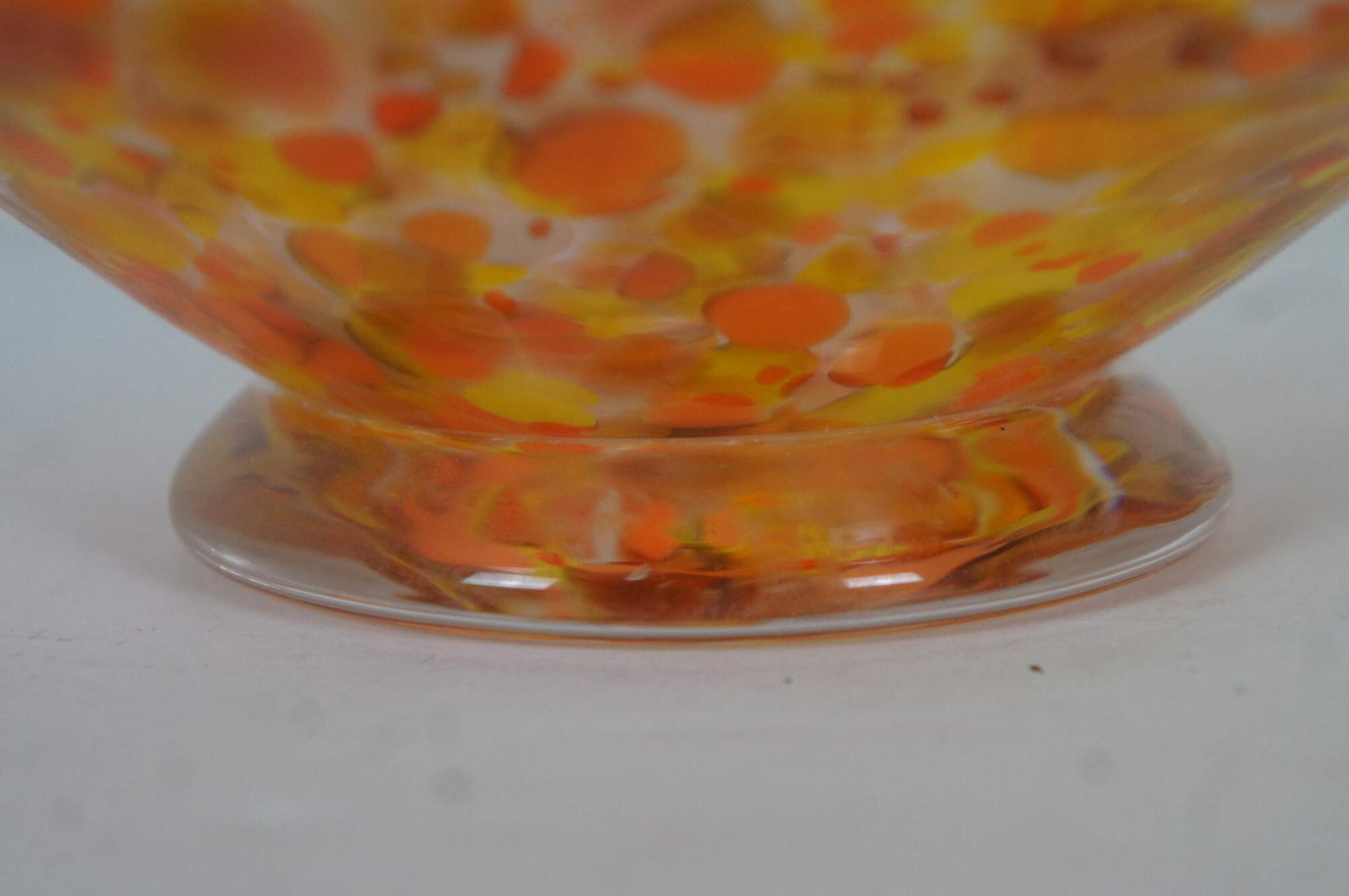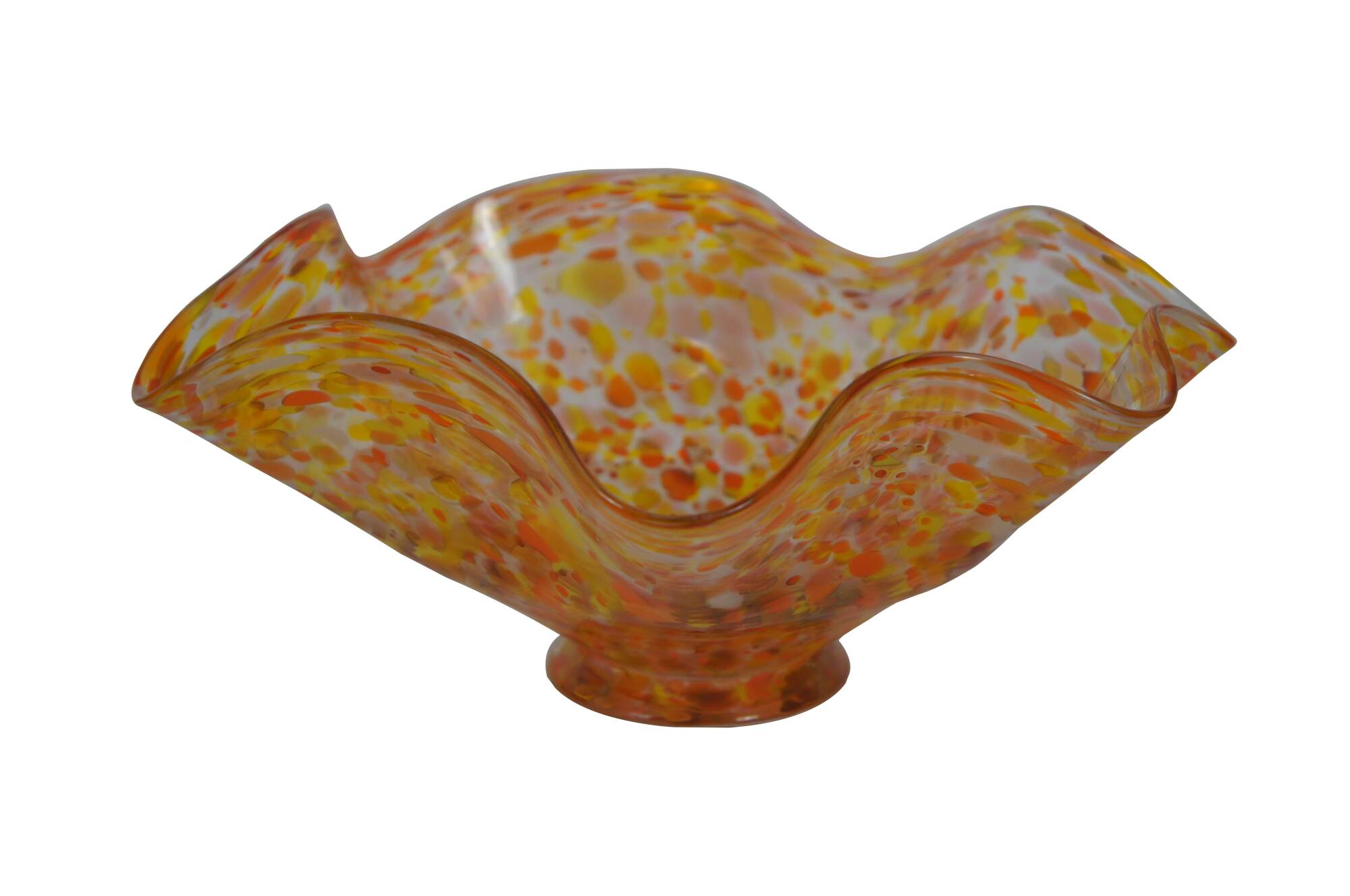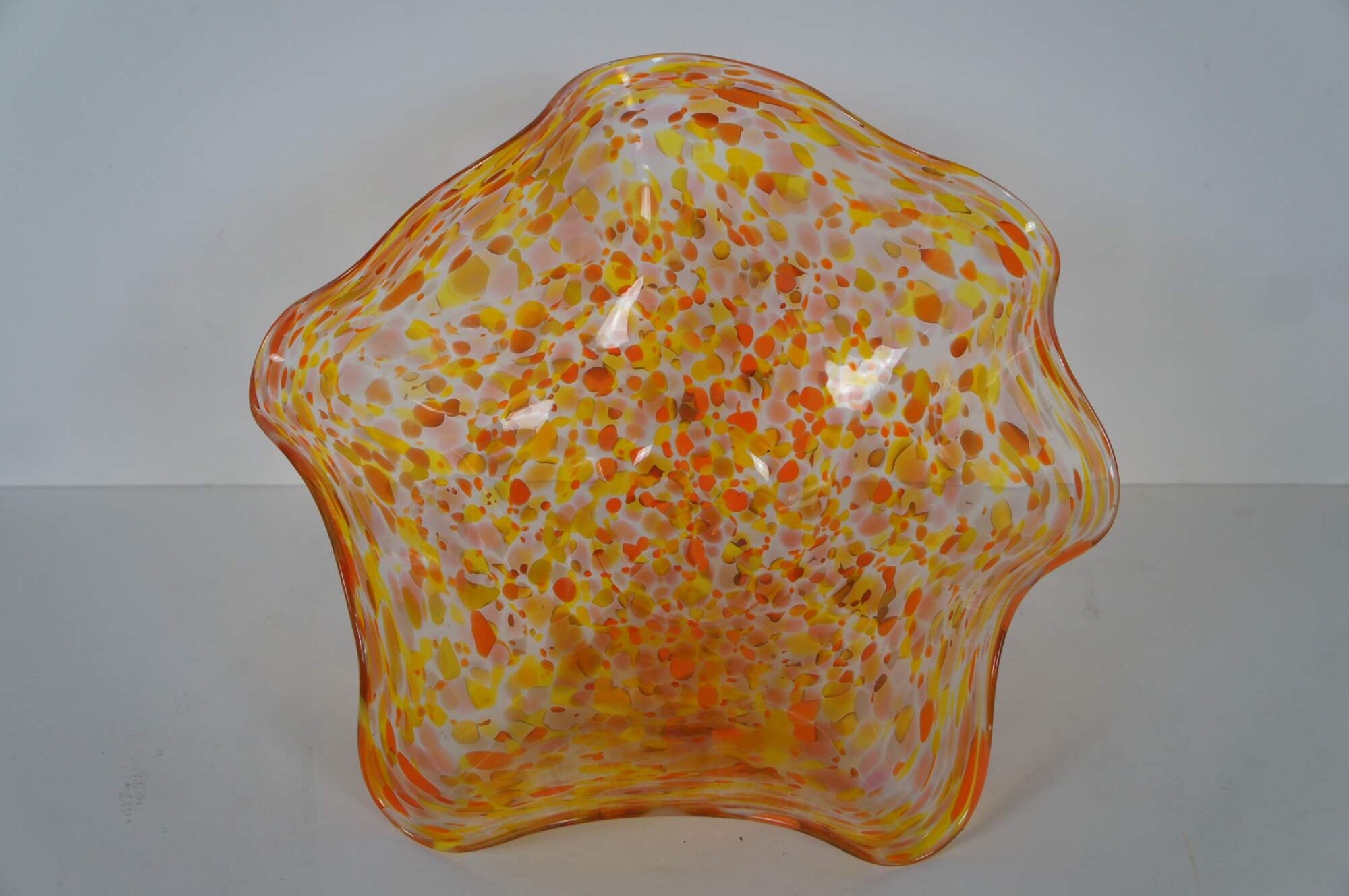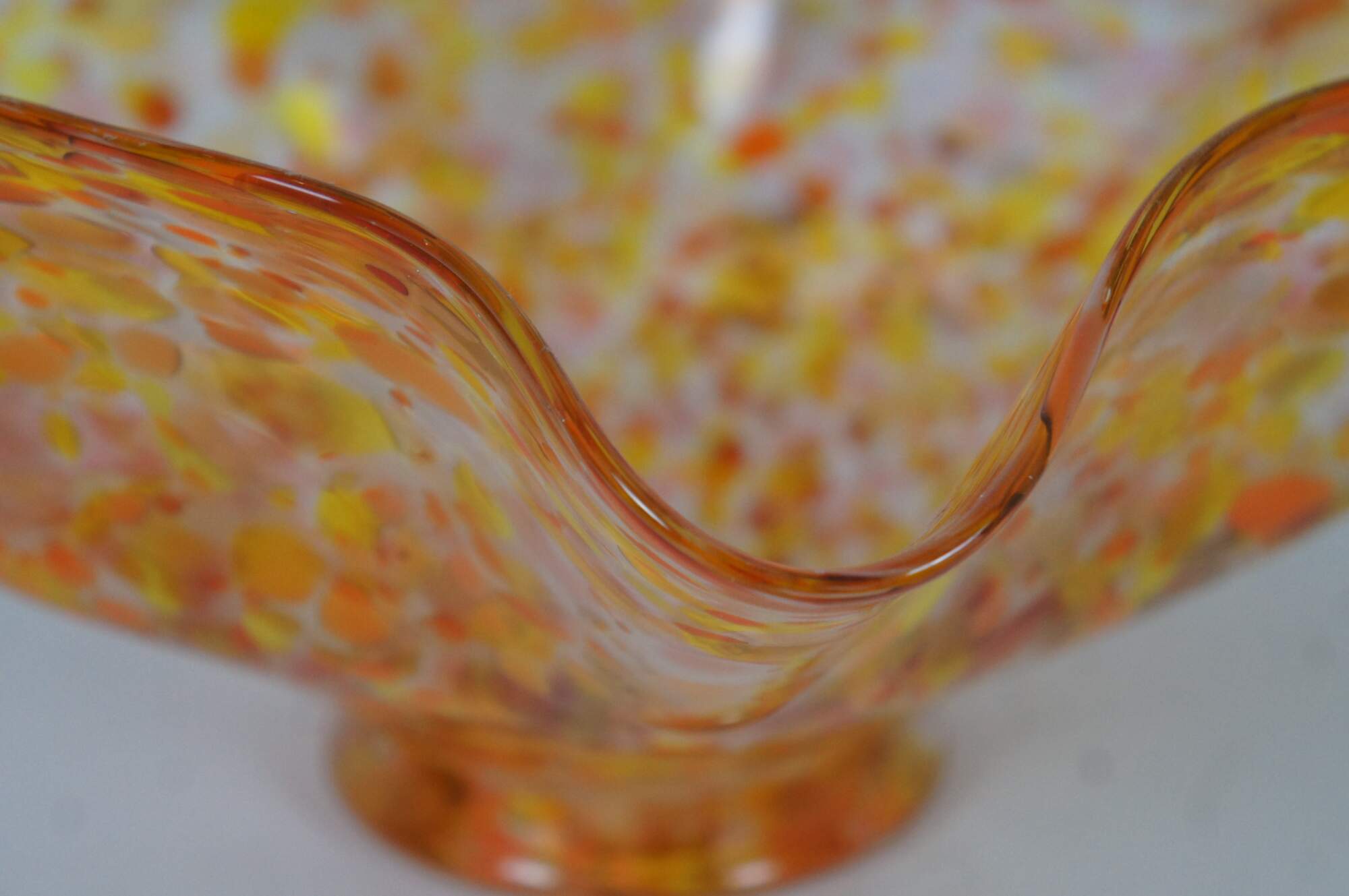 Intriguing hand blown footed free form ruffled centerpiece bowl. Features a swirl of yellows and oranges.