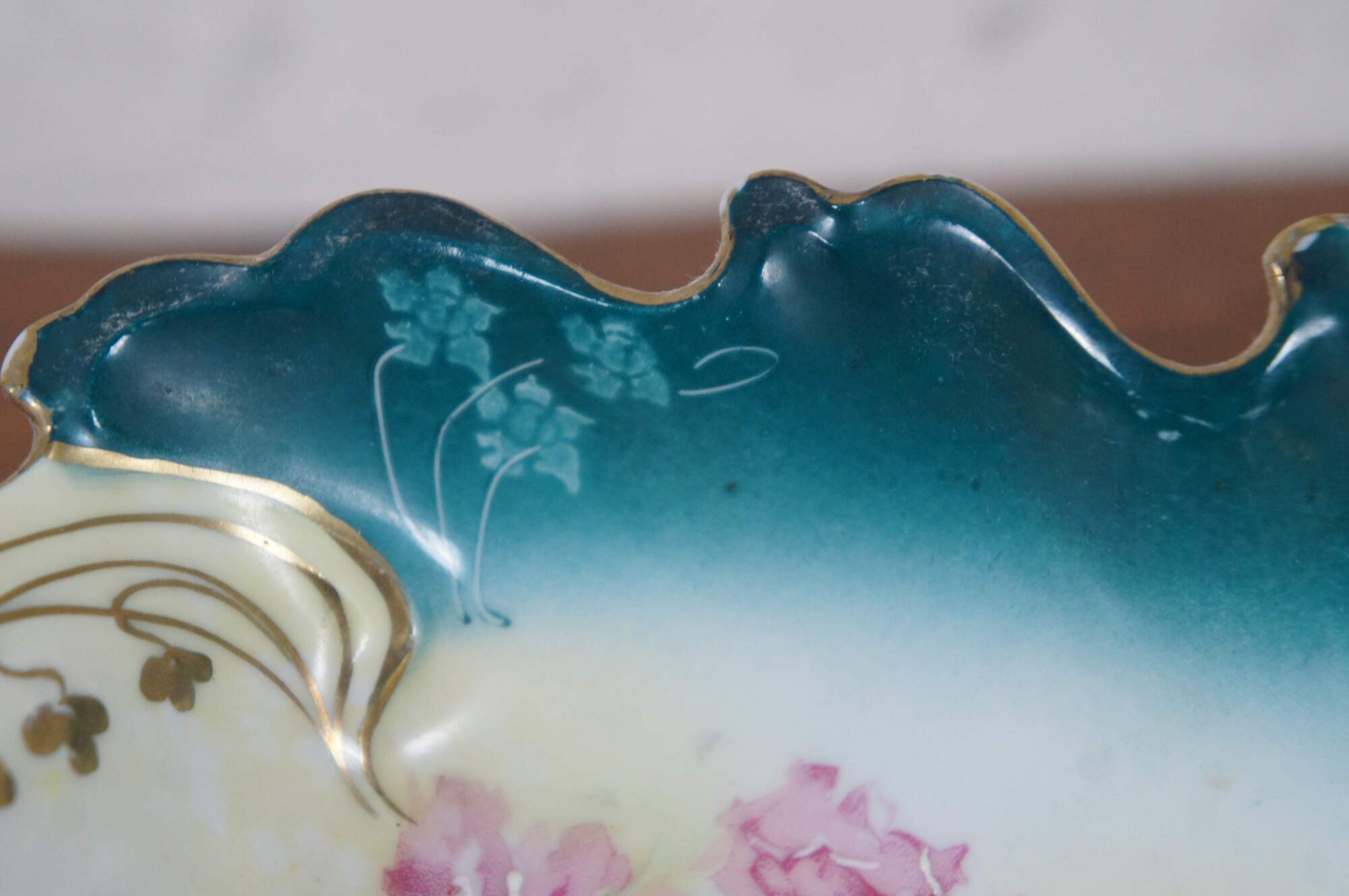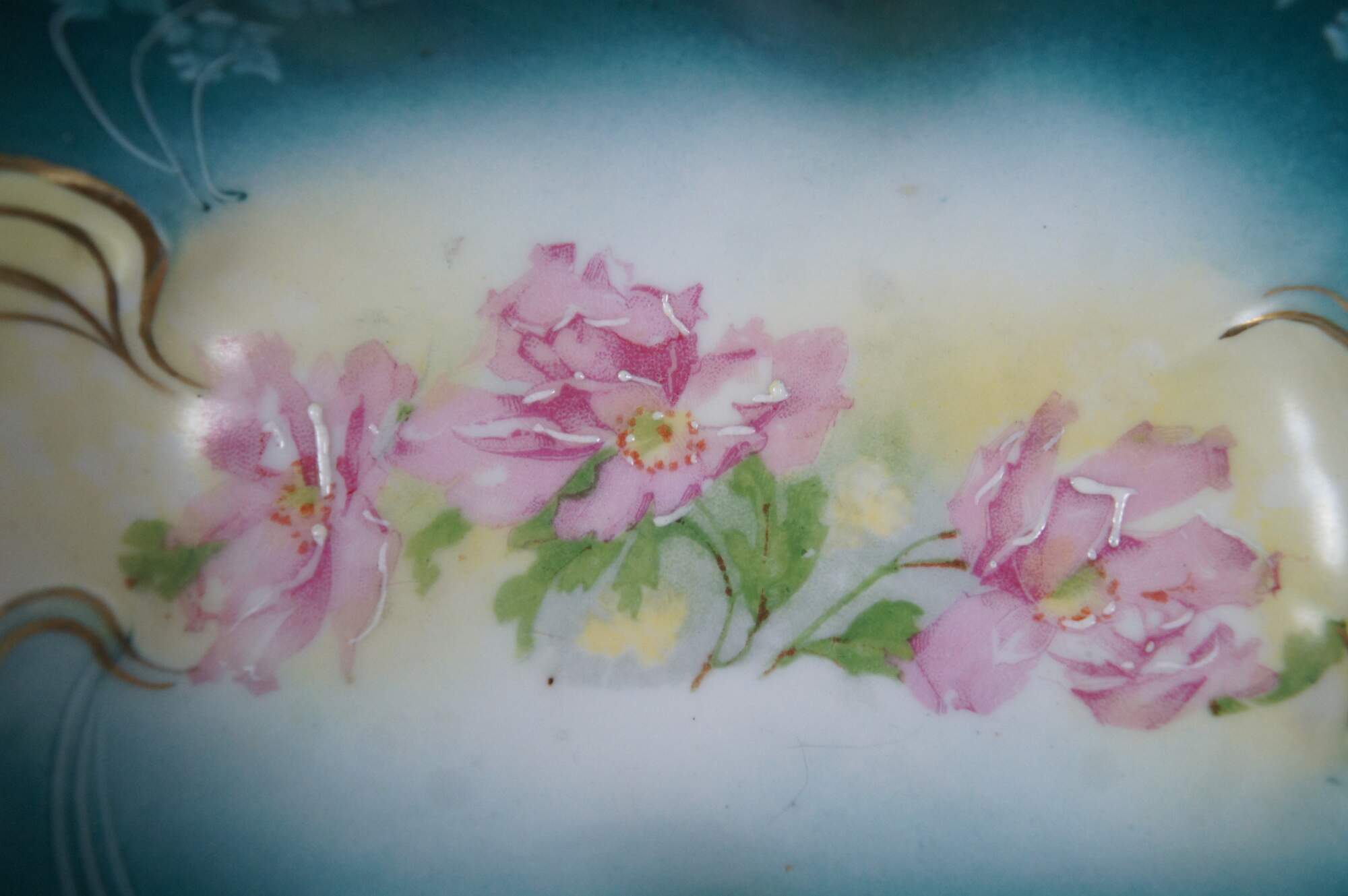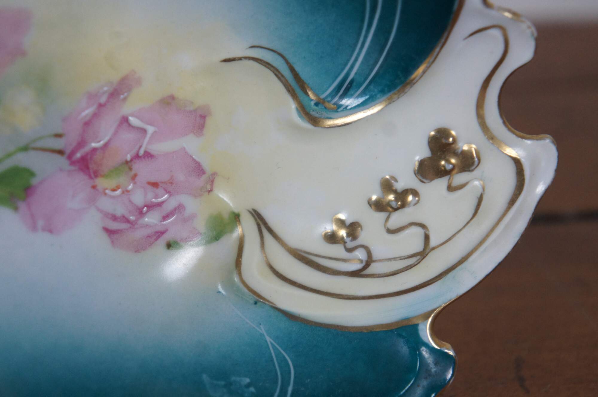 Antique New Habsburg floral centerpiece. Handpainted with pink flowers over a green background with gold trimming.