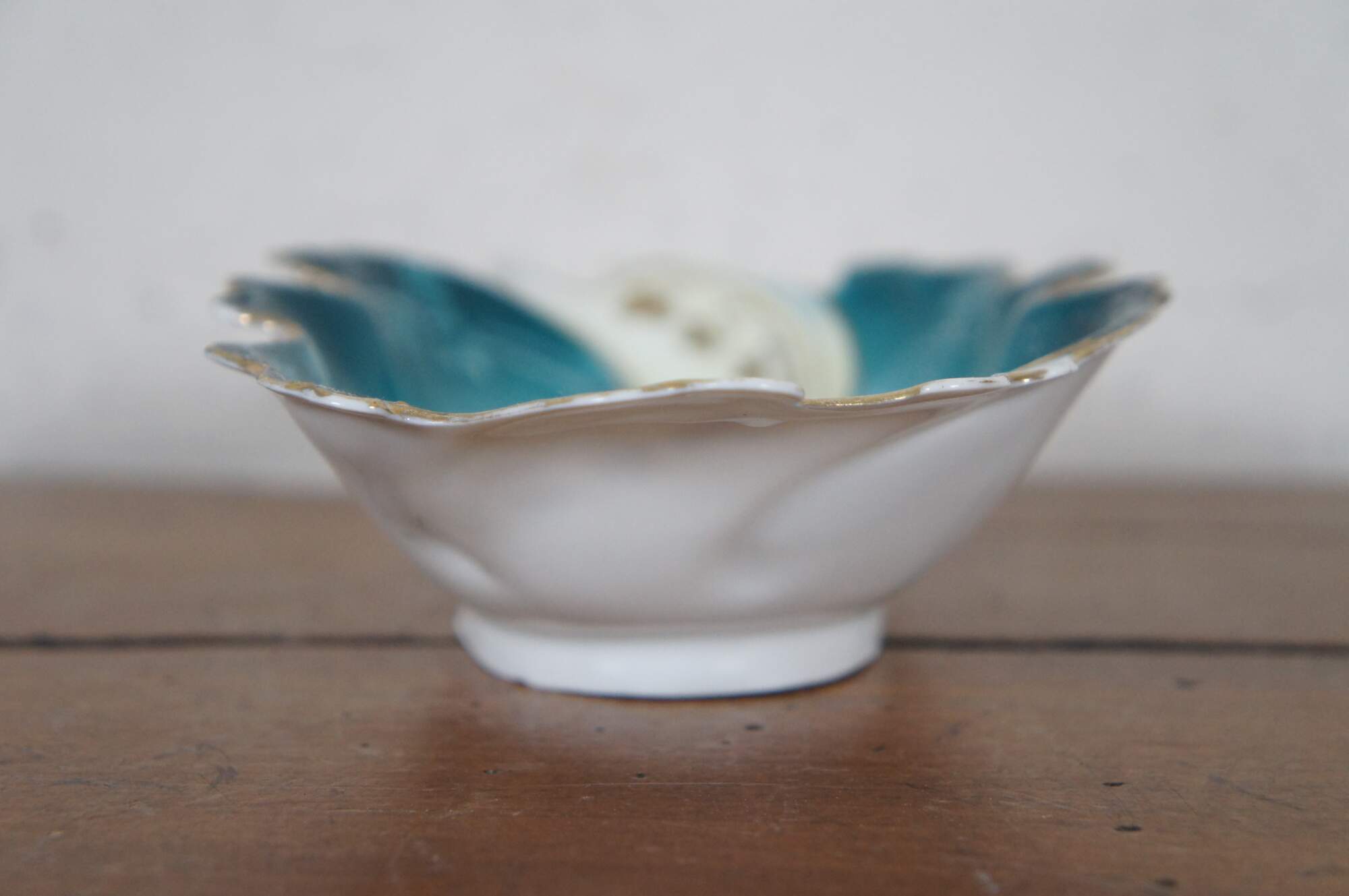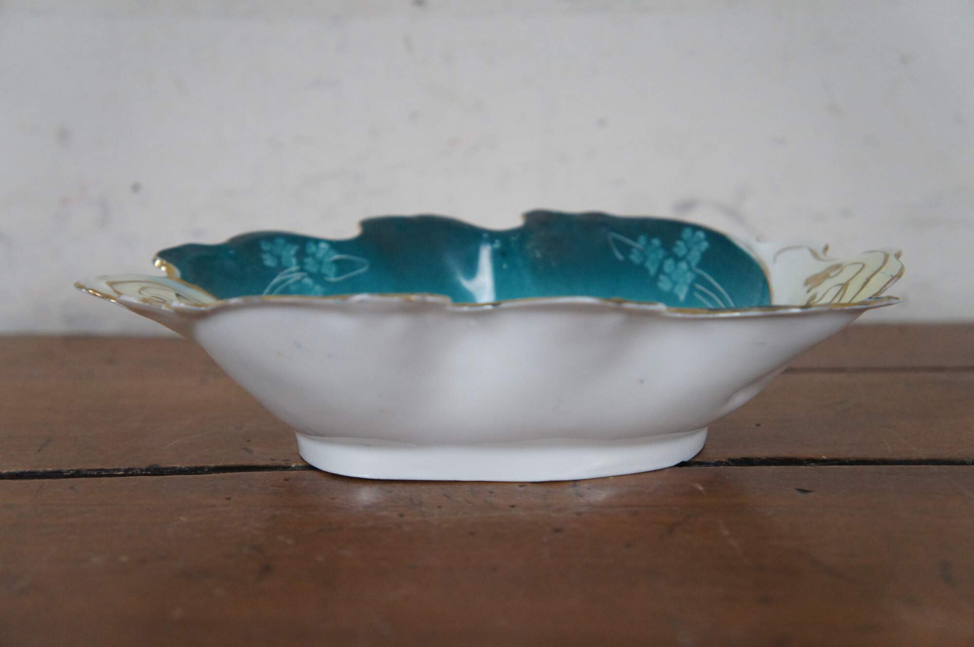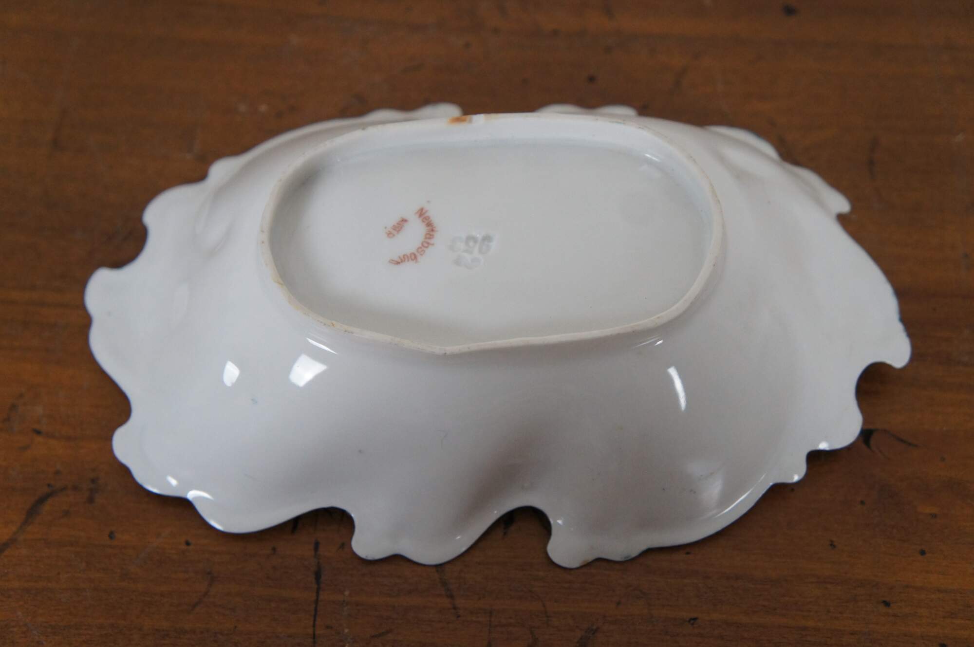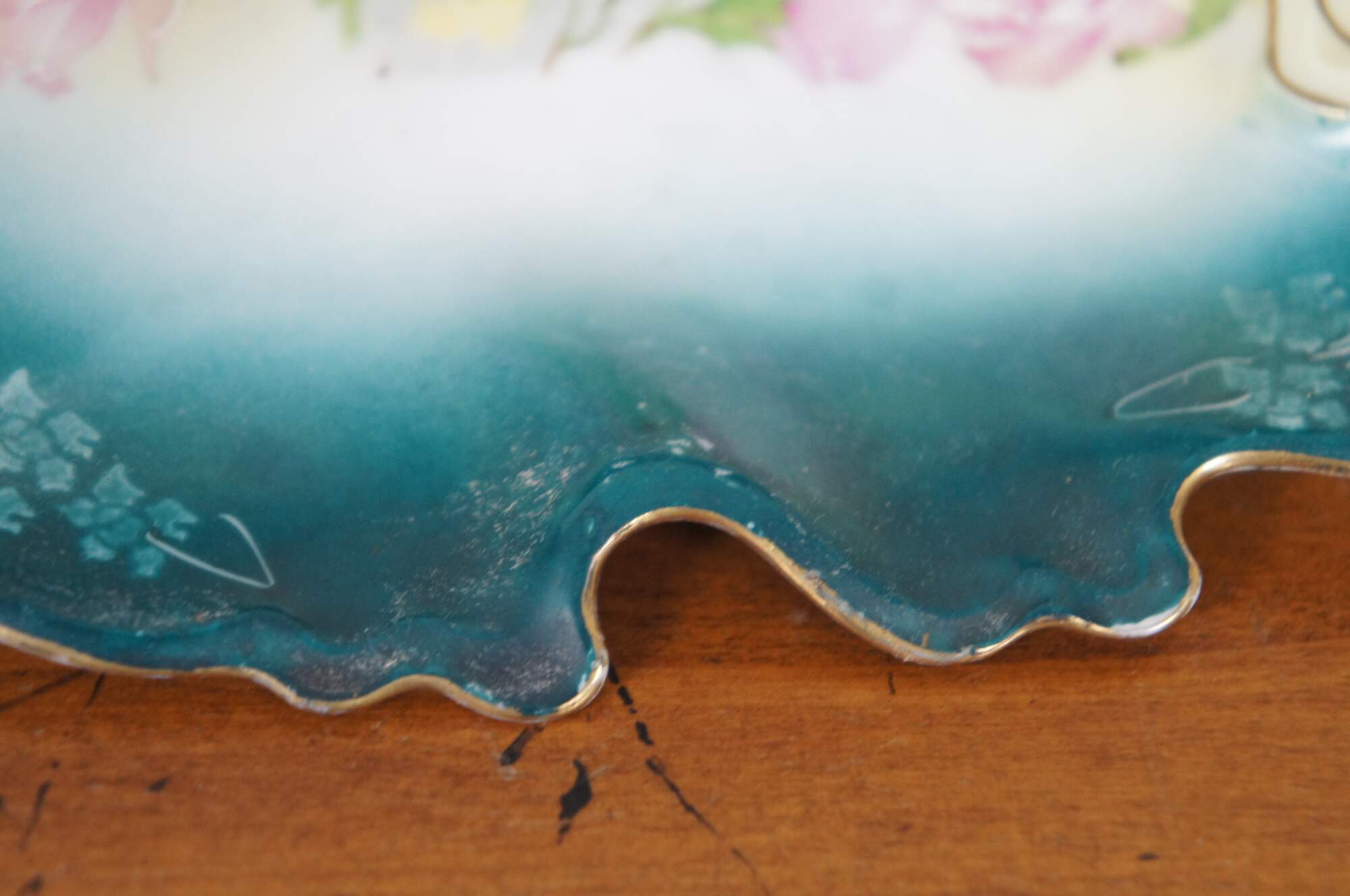 Antique New Habsburg floral centerpiece. Handpainted with pink flowers over a green background with gold trimming.