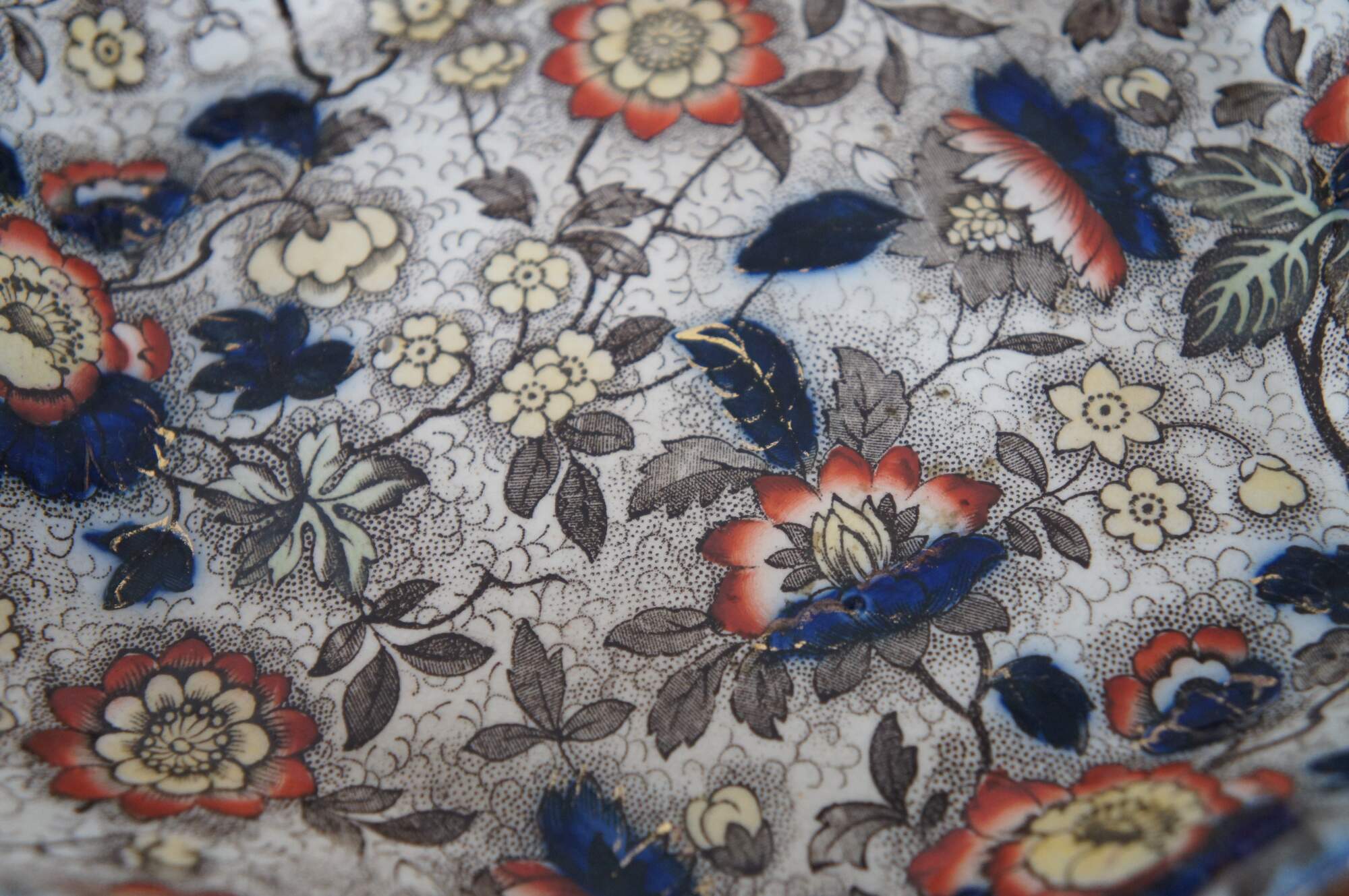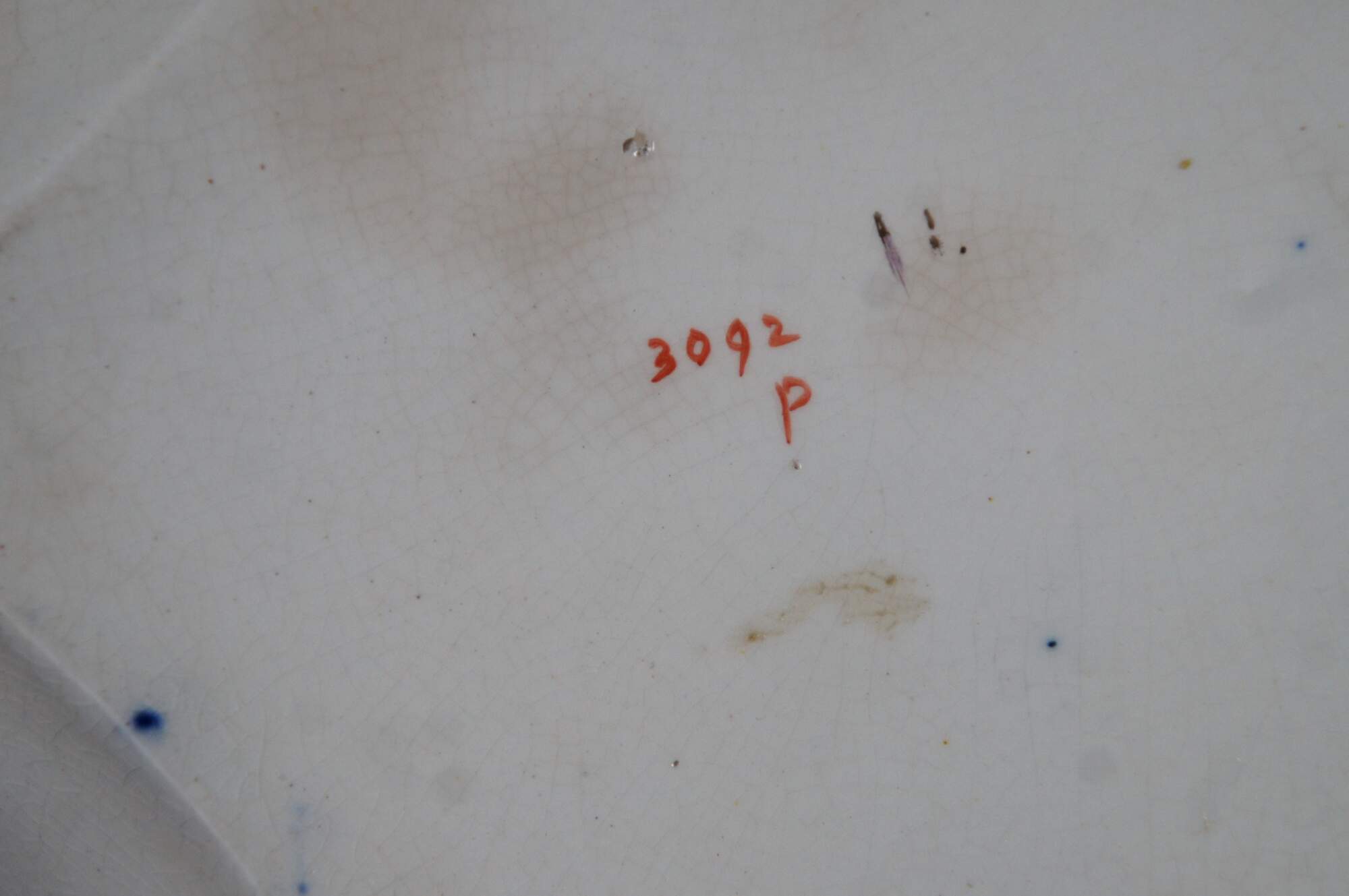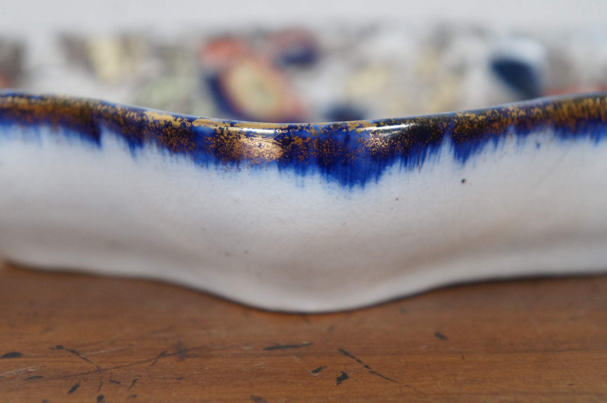 Antique Japanese Imari serving dish or bowl featuring a hexagonal freeform ruffled serpentine edge with floral motif. Attributed to Hollinshead & Kirkham. Marked 3092 P on base.