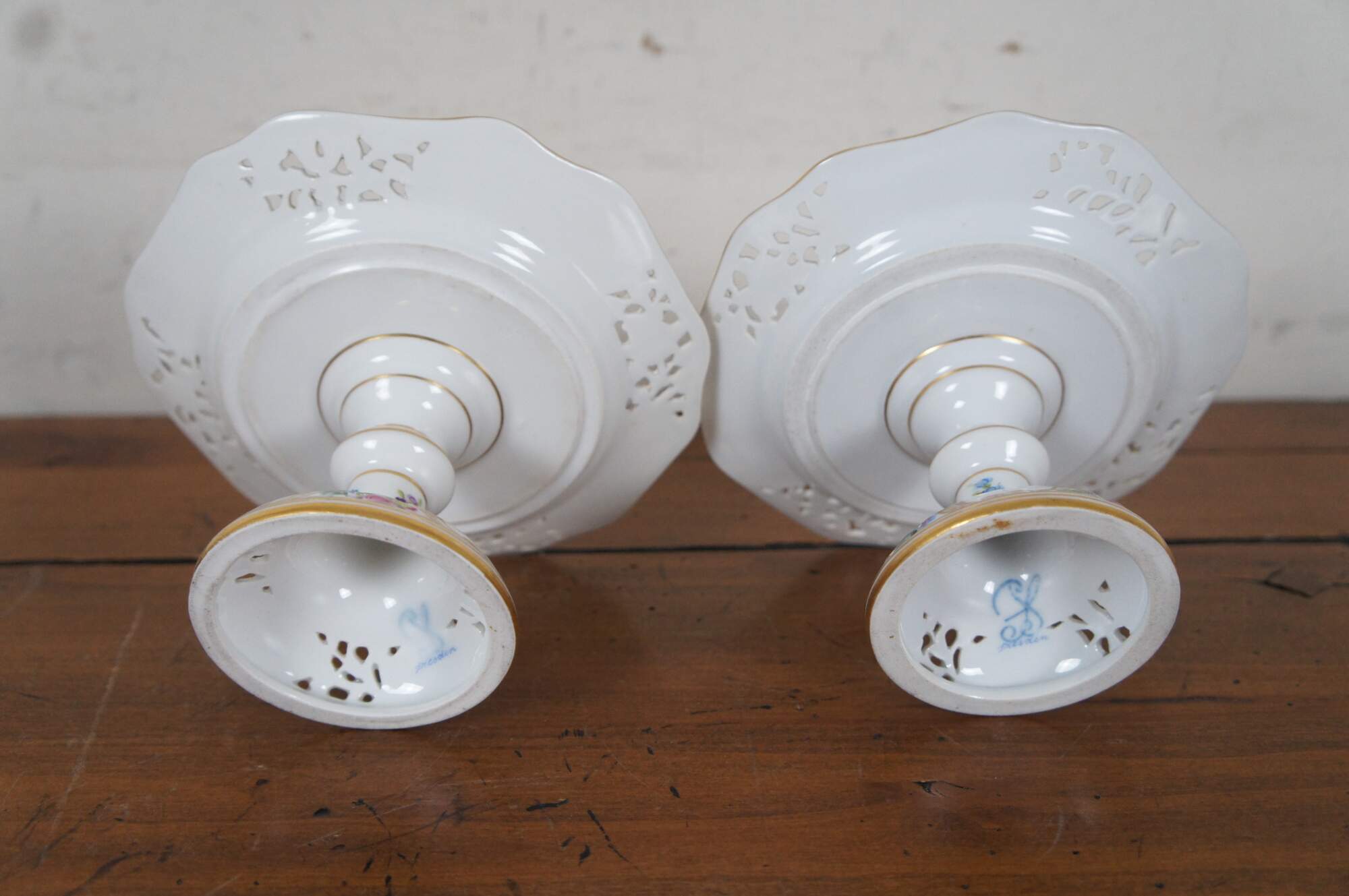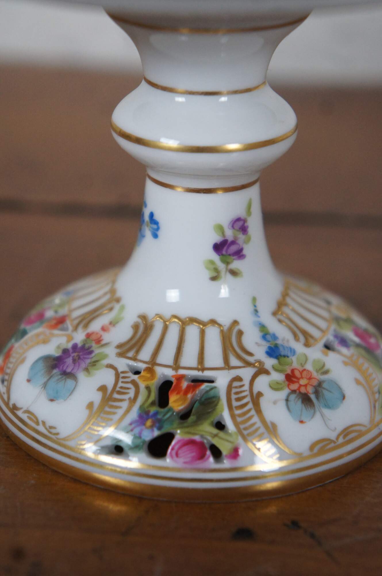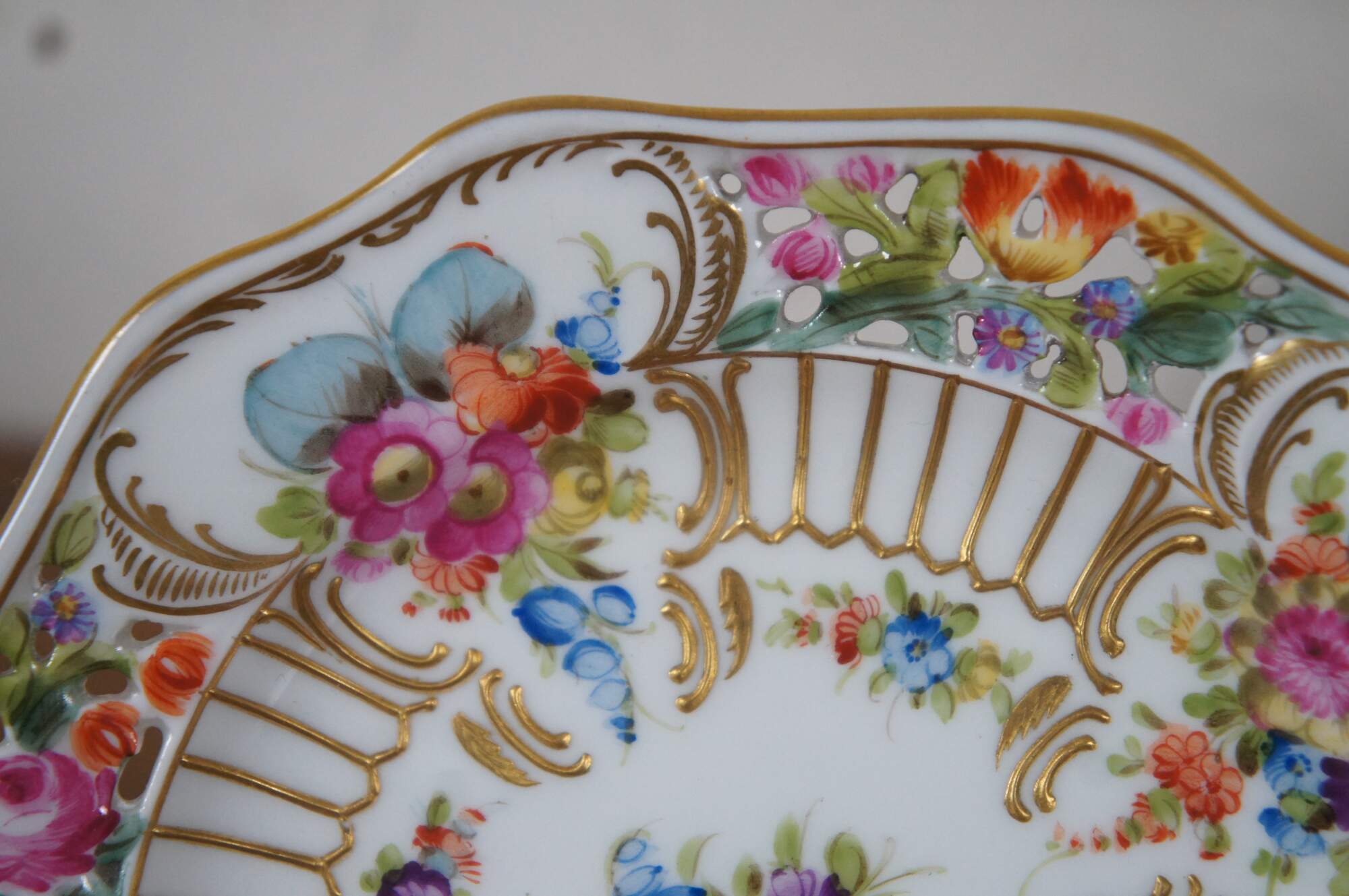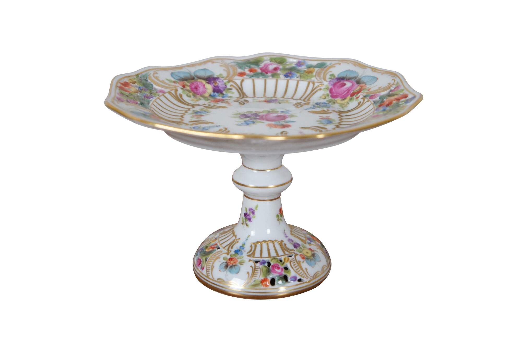 Pair of two antique German Dresden Carl Thieme porcelain compotes / cake / dessert plates / stands featuring a floral theme with scalloped form, pedestal base and reticulated / pierced accents. Marked Dec: 300. Depose. Cirac 1902-1920.