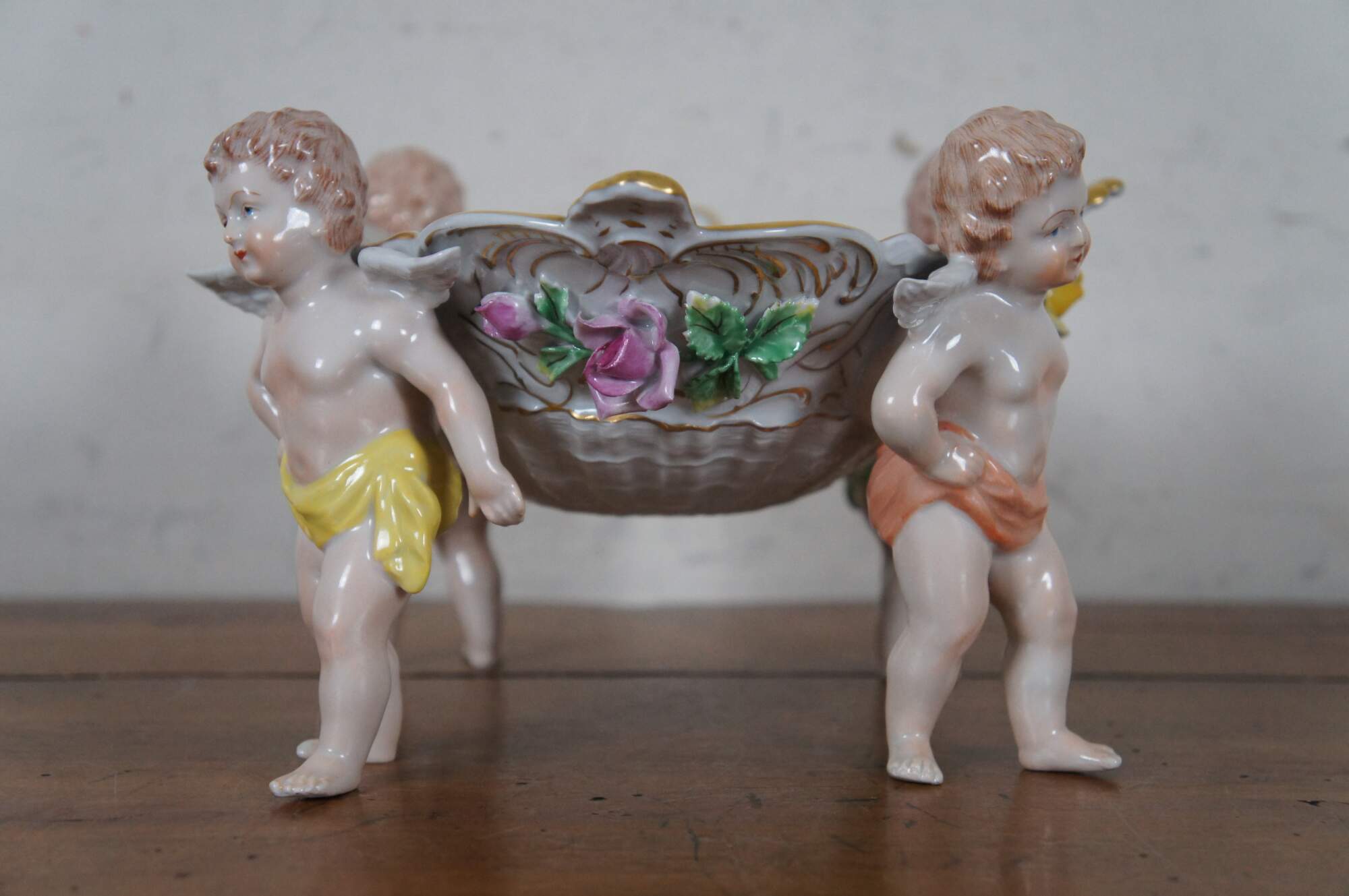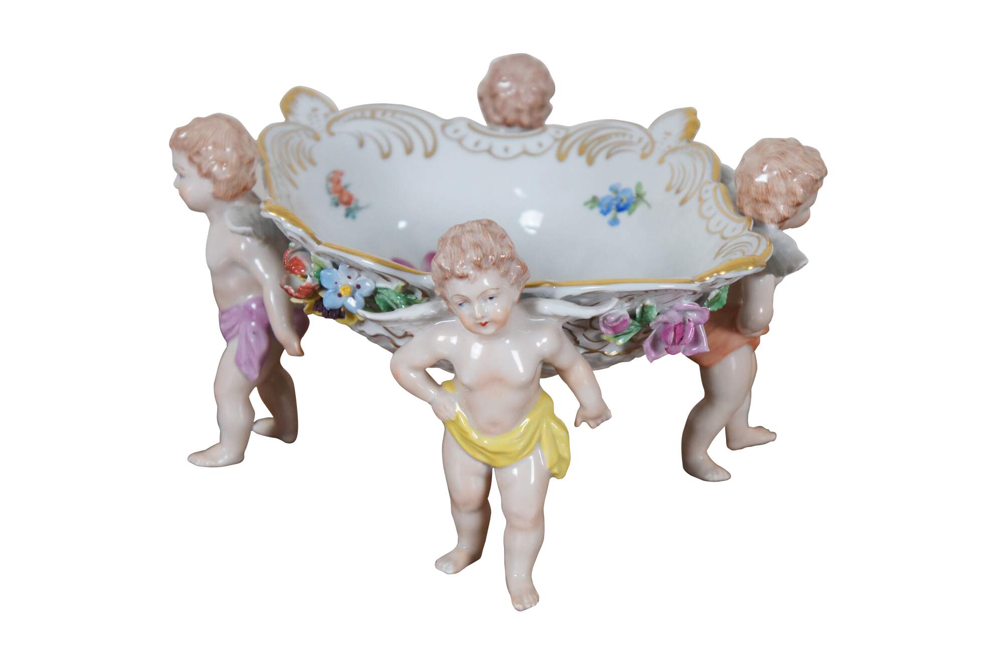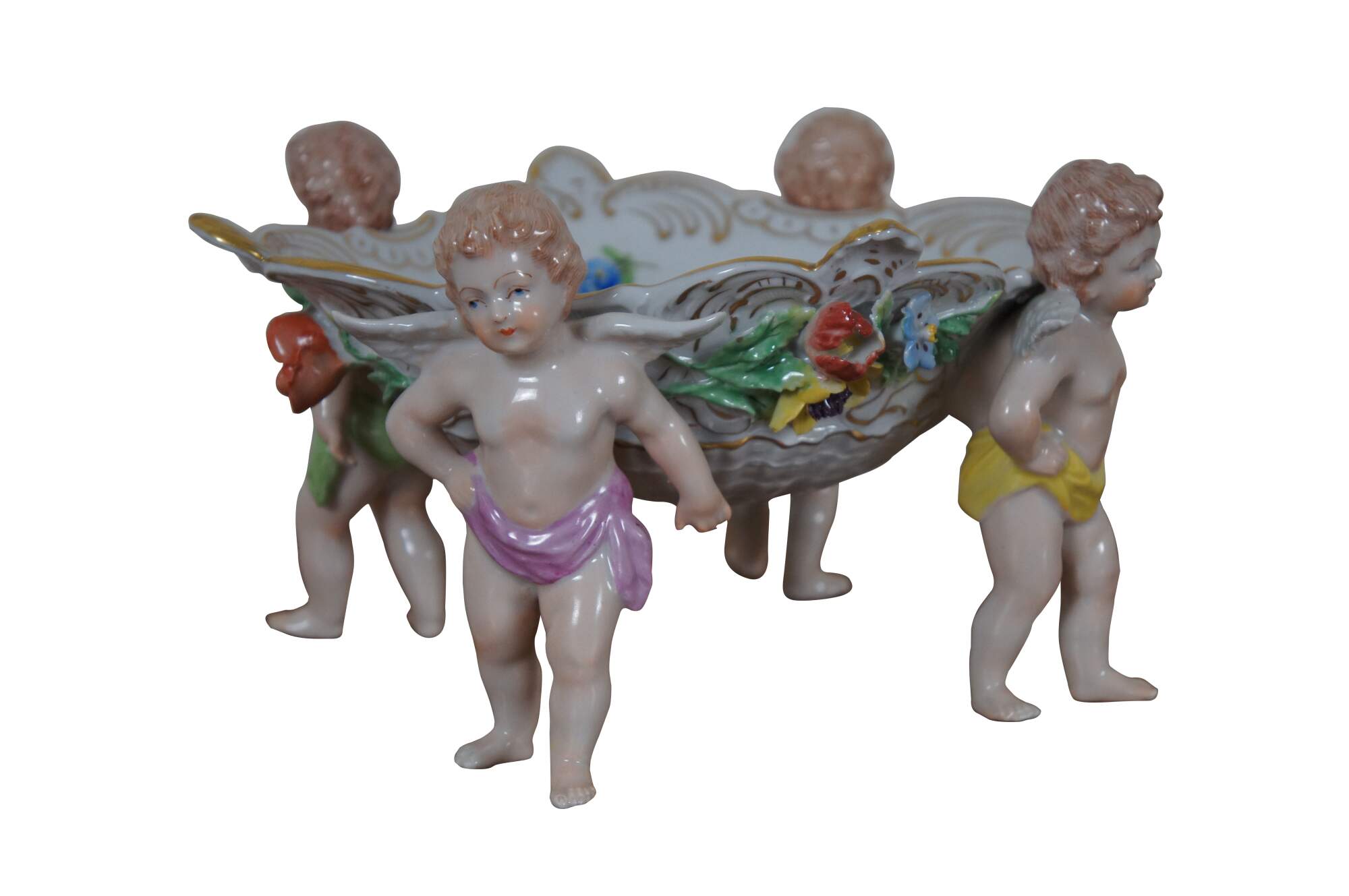 An exceptional Carl Thieme for Dresden Polychrome Centerpiece. Made from porcelain with colorful details. The bowl has a diamond form with flowers and gold trim. Supported by four cherubs / Puttis.
