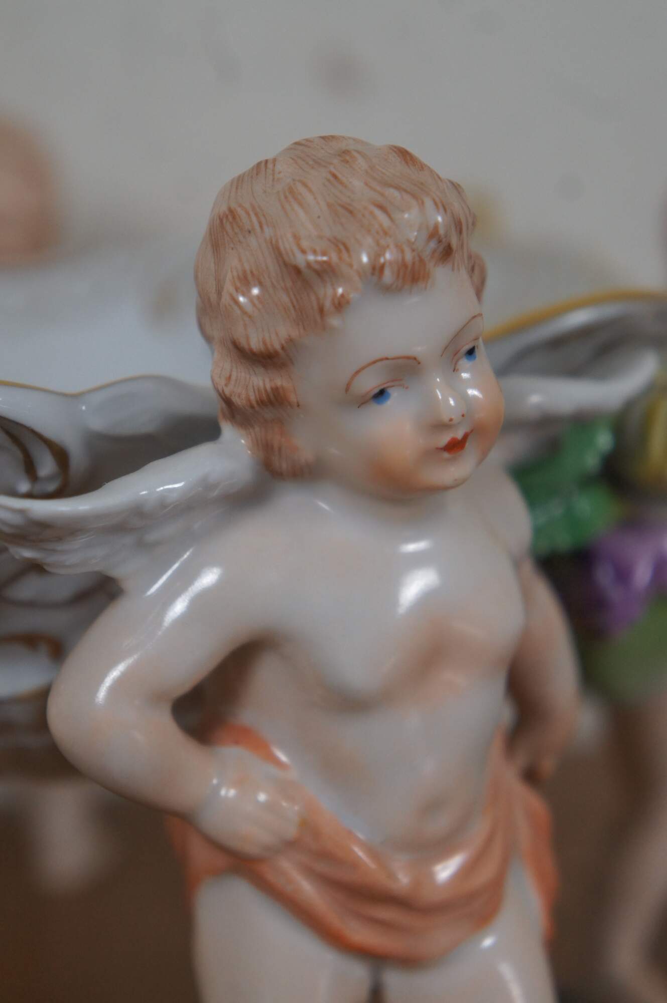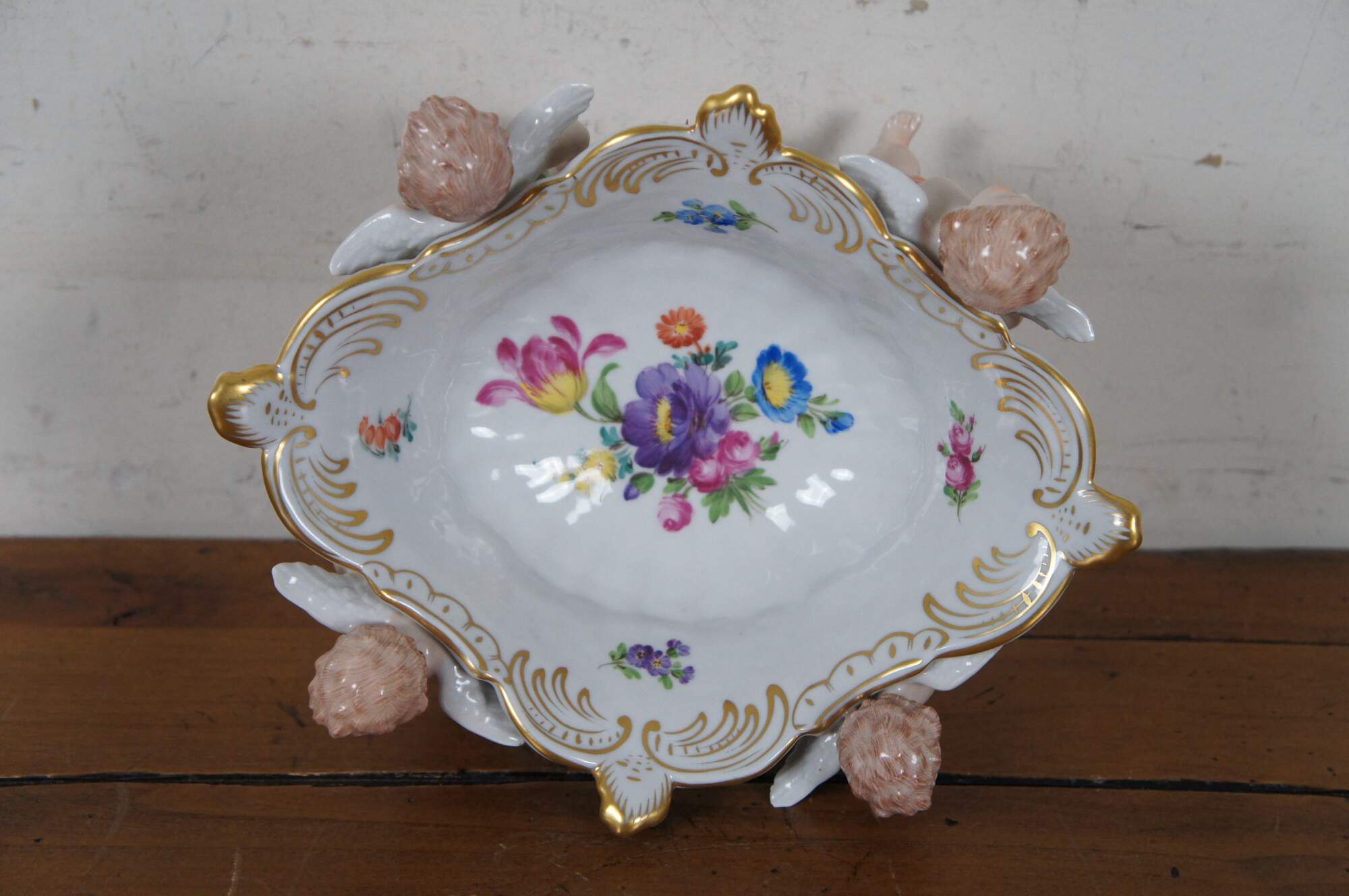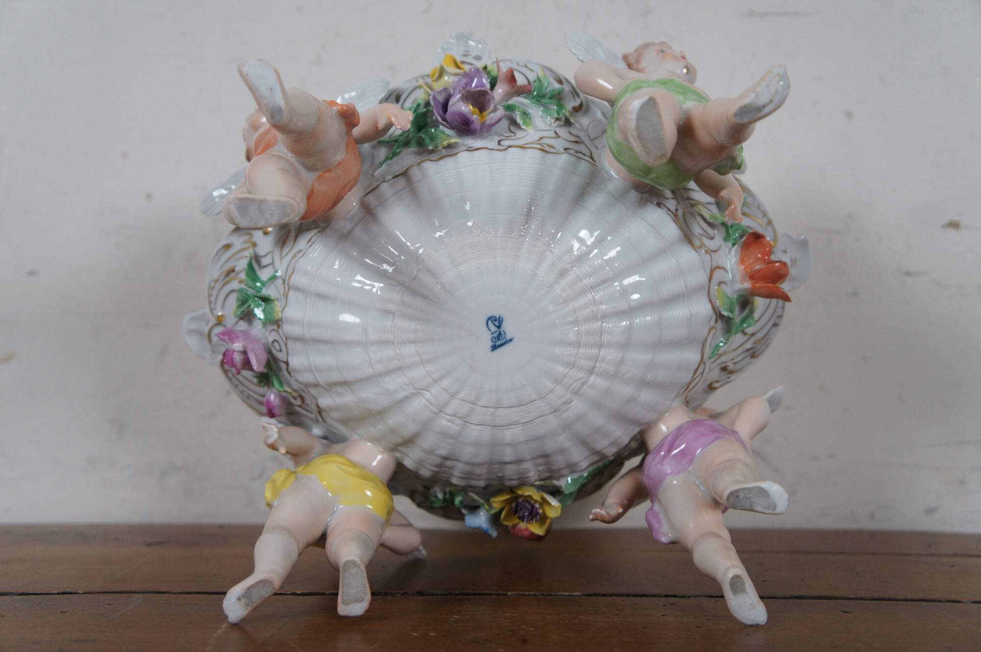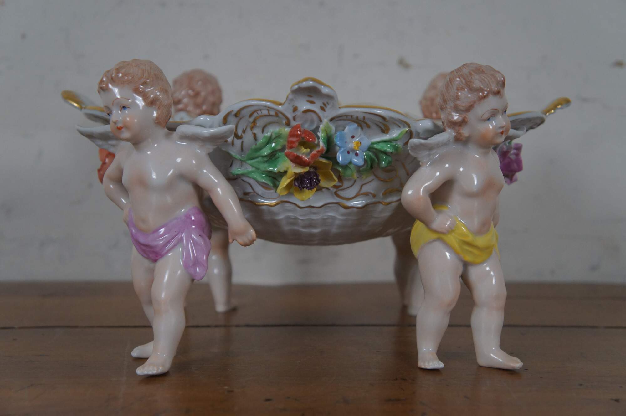 An exceptional Carl Thieme for Dresden Polychrome Centerpiece. Made from porcelain with colorful details. The bowl has a diamond form with flowers and gold trim. Supported by four cherubs / Puttis.