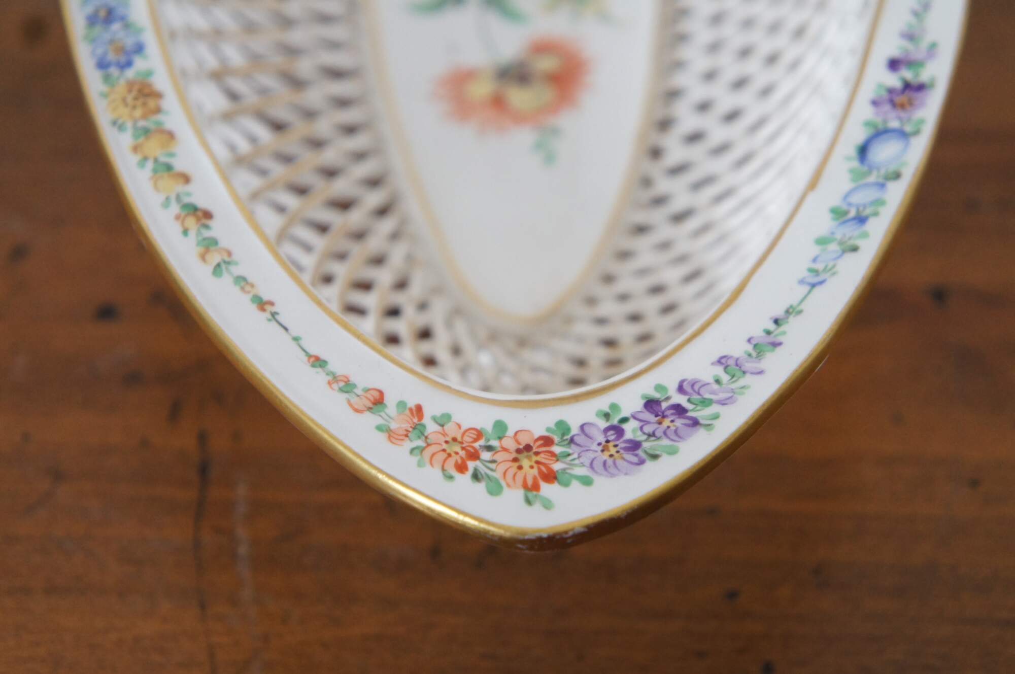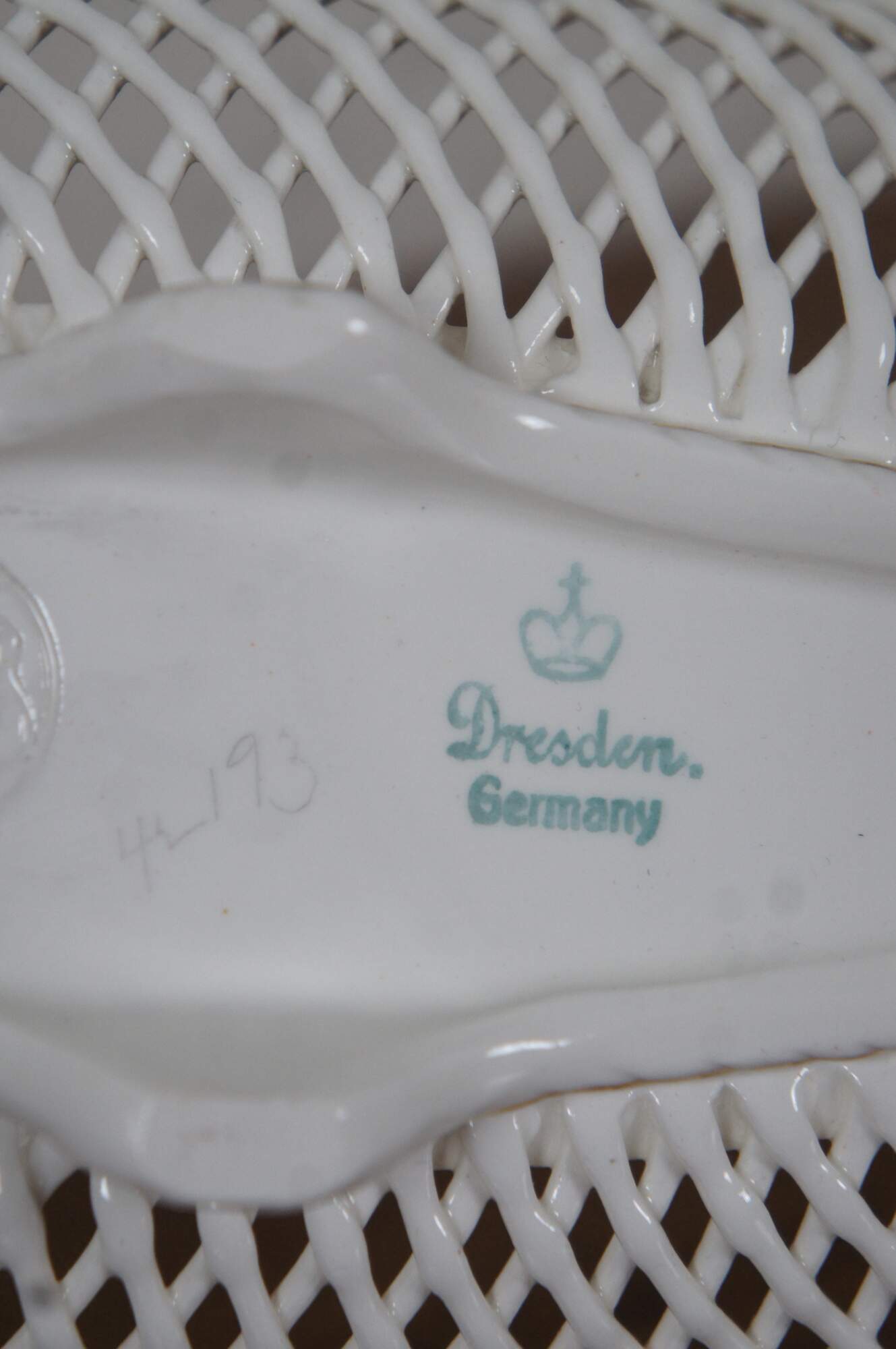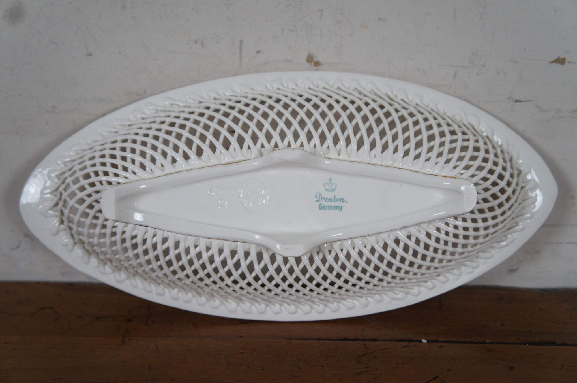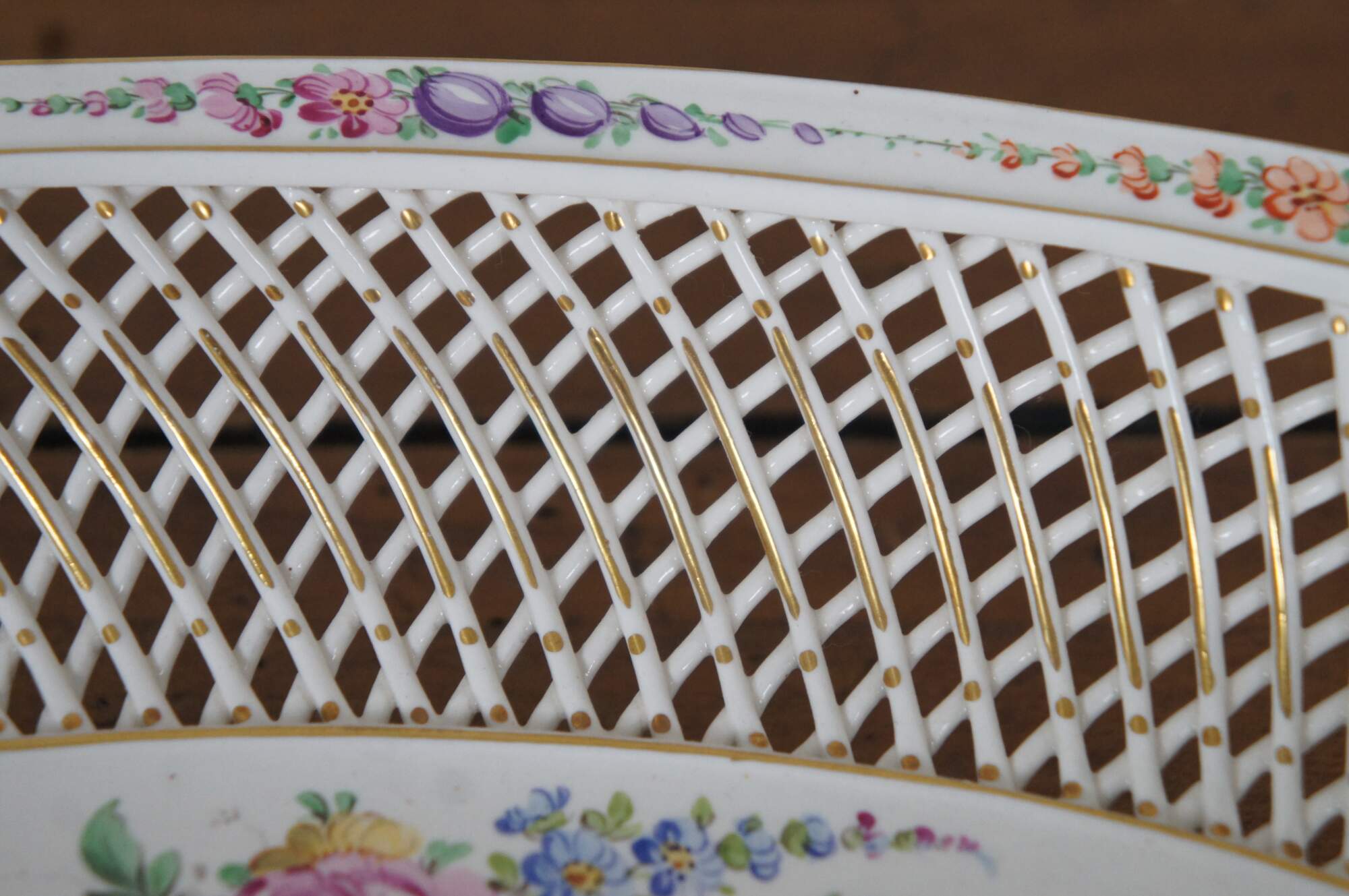 Large antique Dresden Germany crown mark bowl or compote. Made of porcelain featuring oval form with reticulated basketweave pattern, footed base and colorful floral motif.