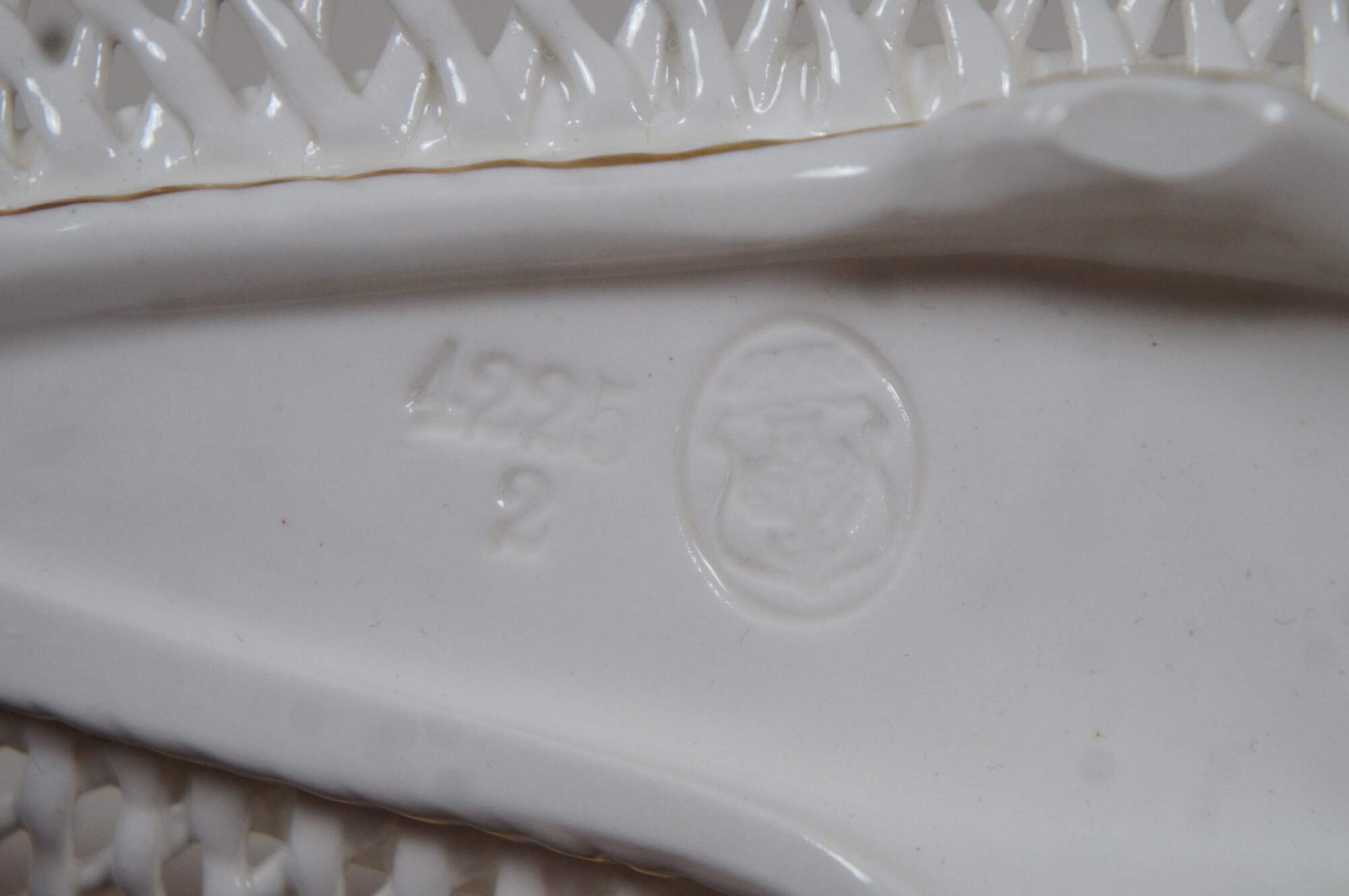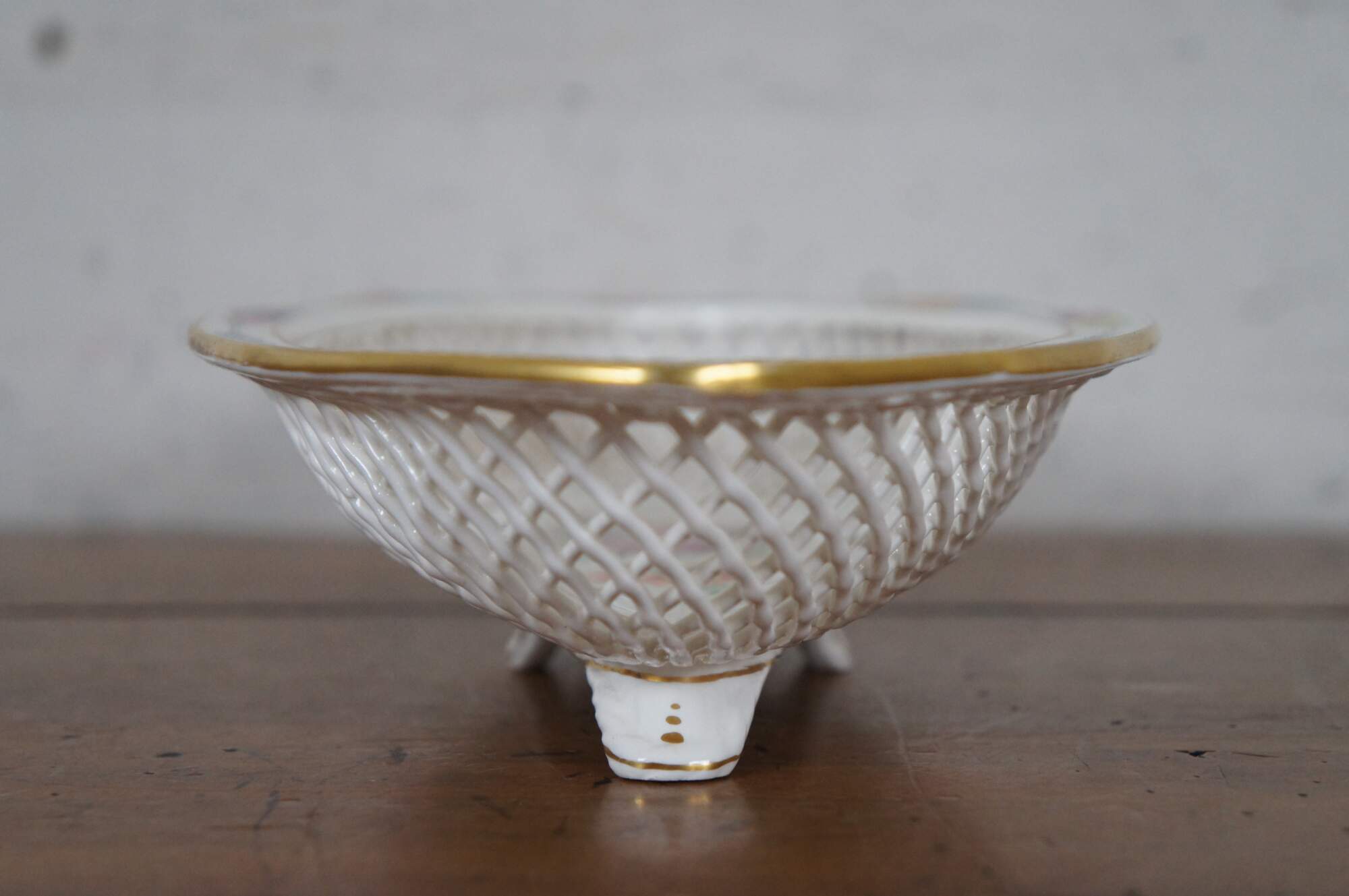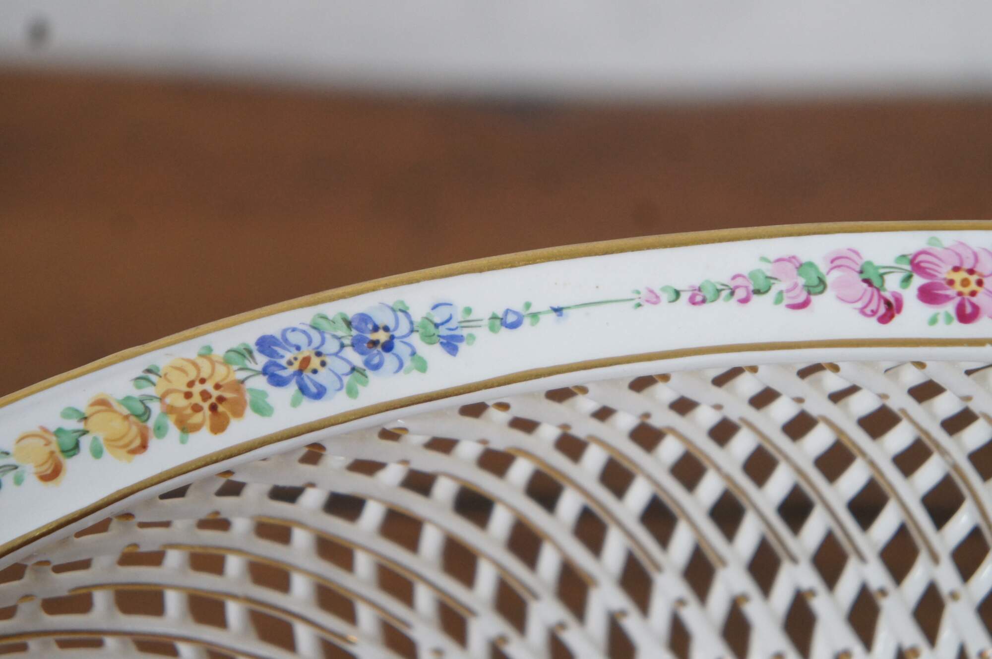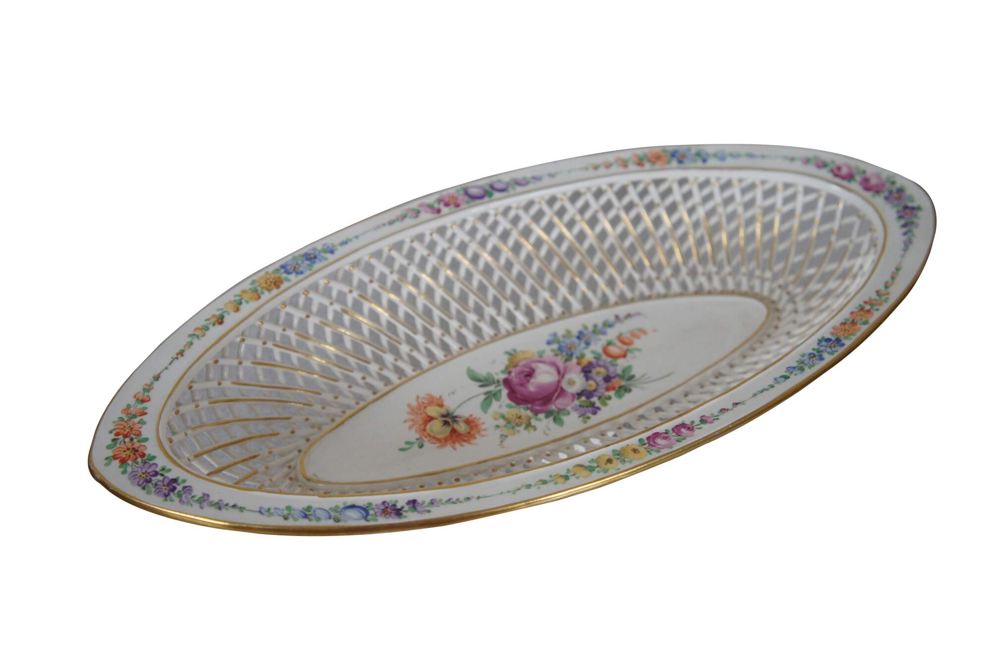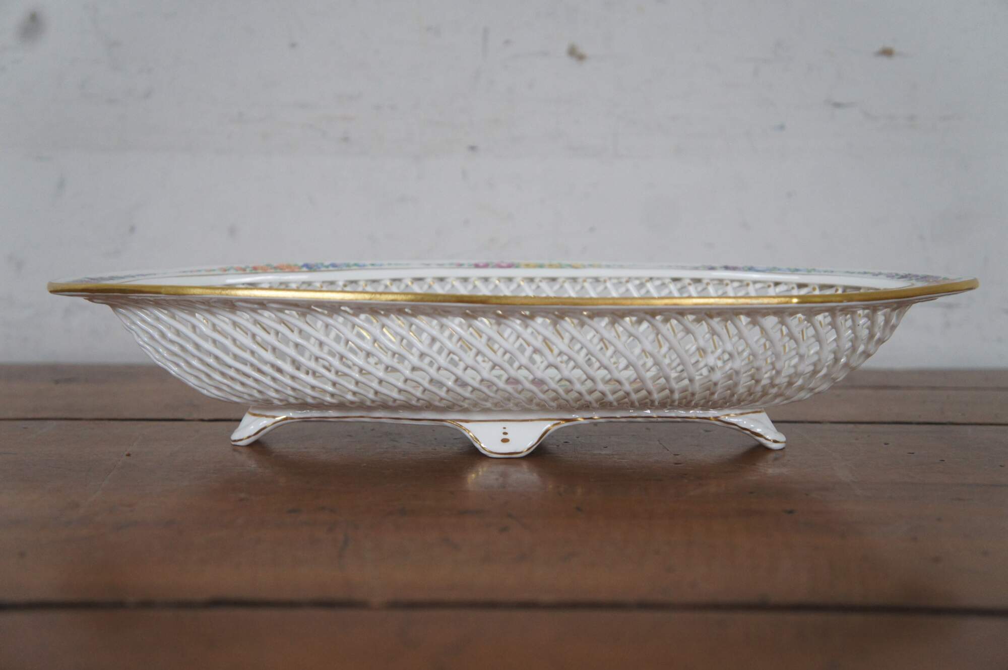Large antique Dresden Germany crown mark bowl or compote. Made of porcelain featuring oval form with reticulated basketweave pattern, footed base and colorful floral motif.