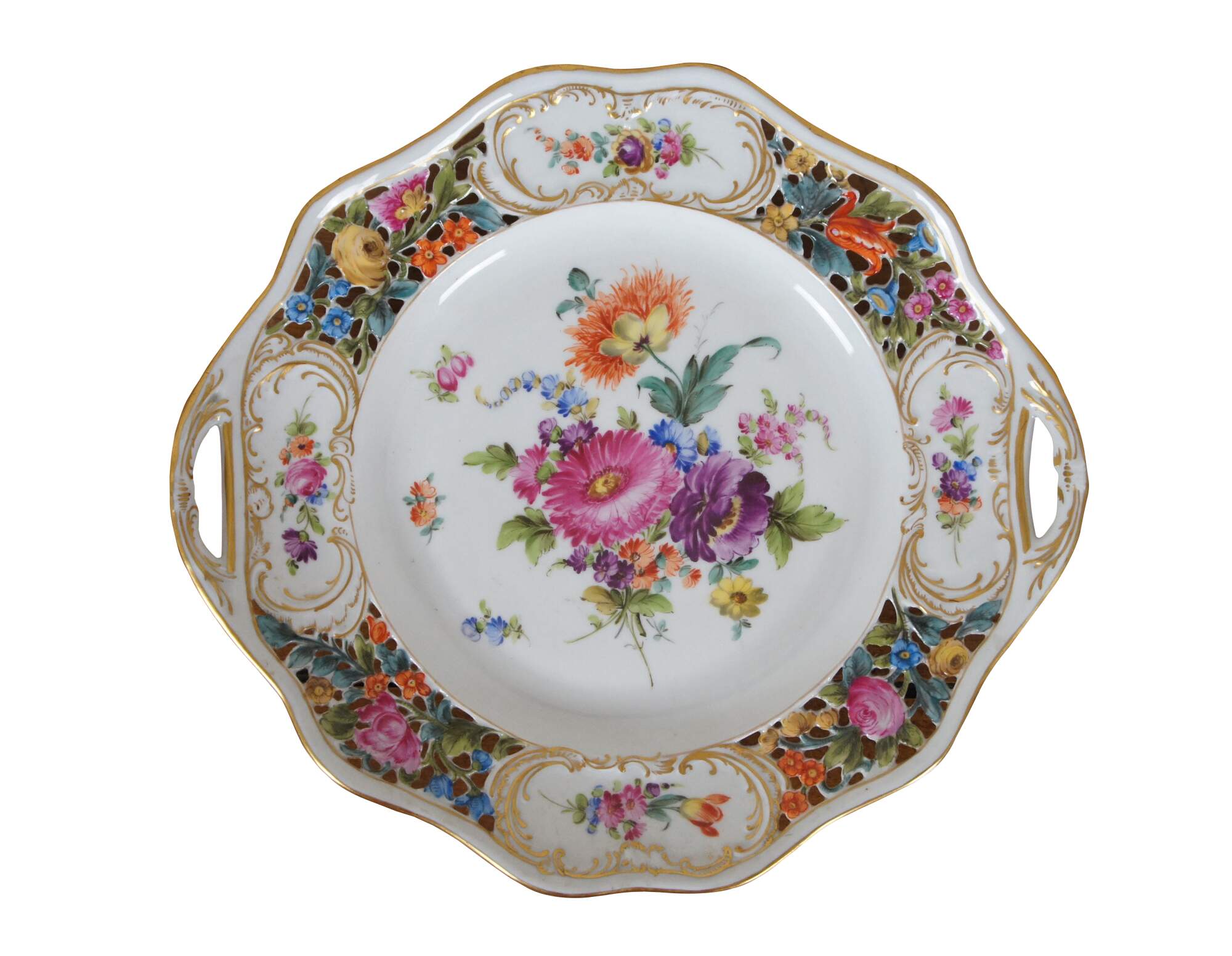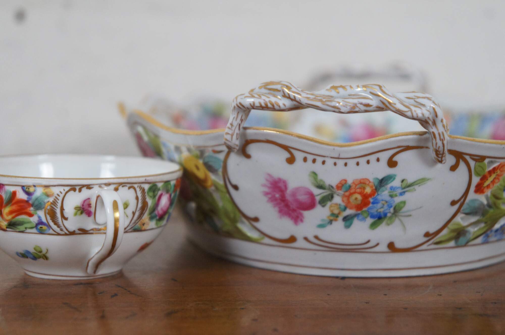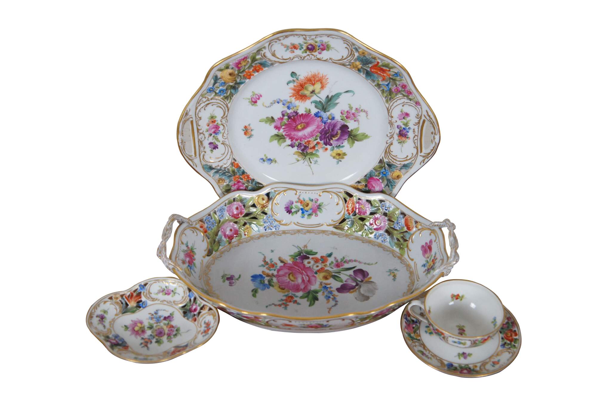 Antique German Dresden Carl Thieme floral porcelain set. Lot includes pierced reticulated oval serving dish, handled platter / plate, small oval dish, and a teacup with saucer.