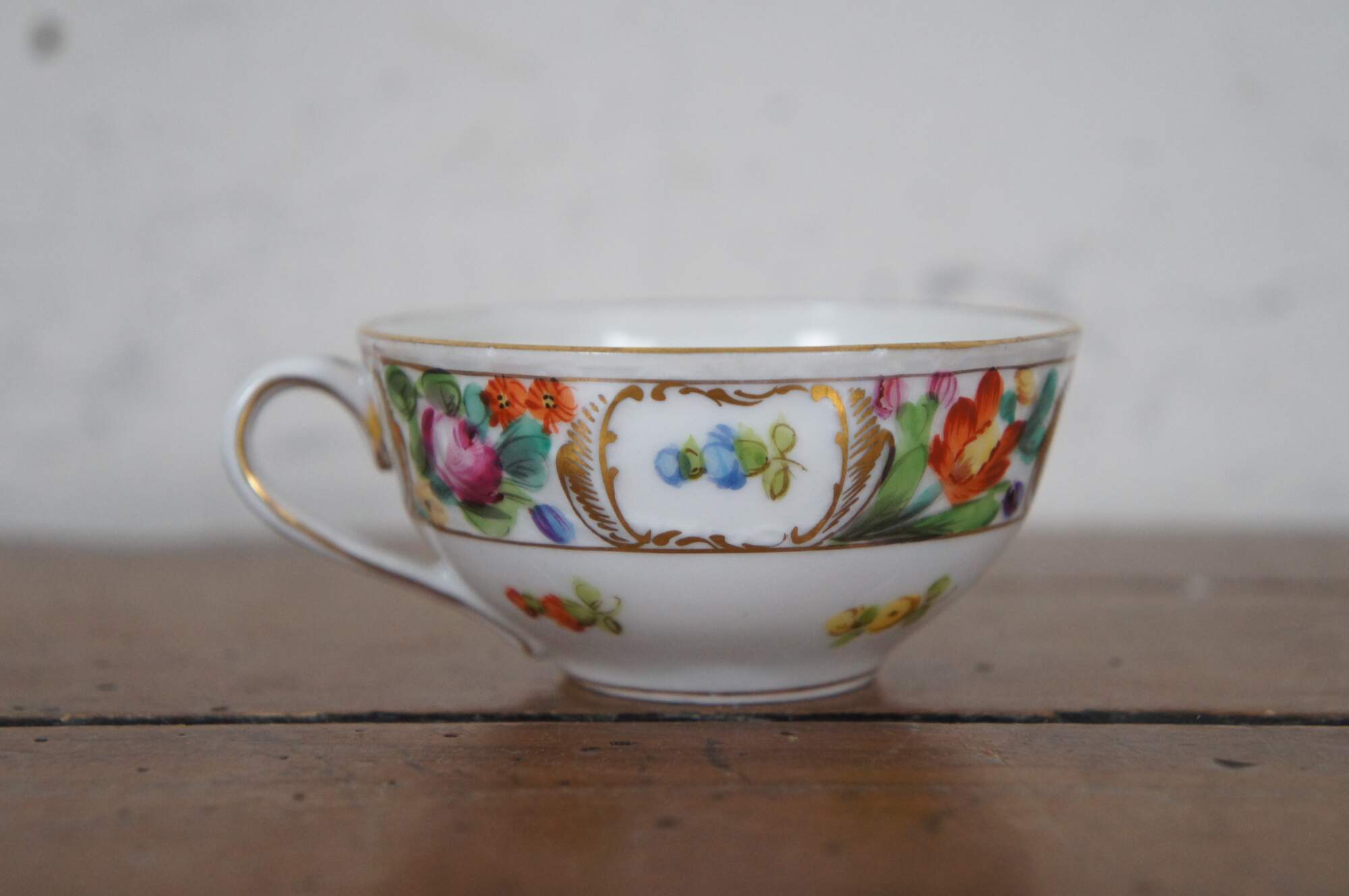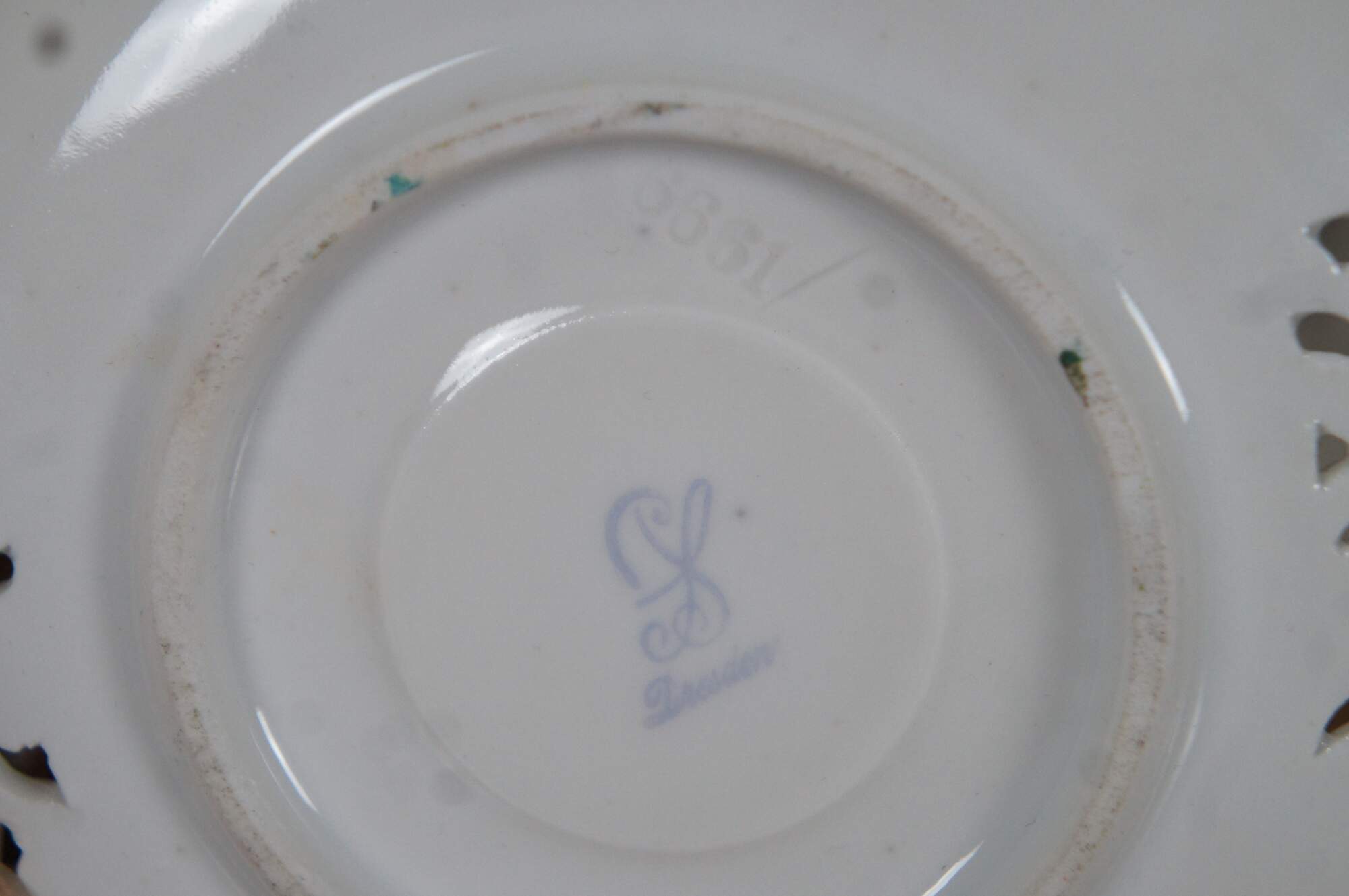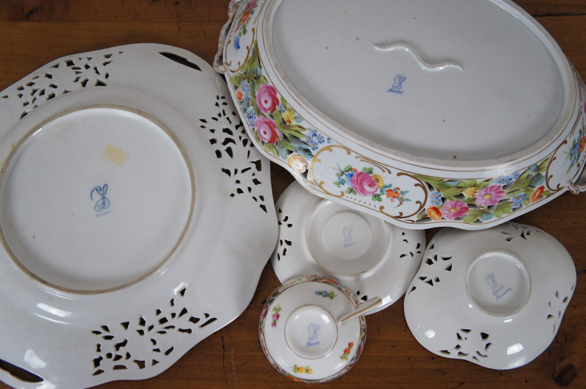 Antique German Dresden Carl Thieme floral porcelain set. Lot includes pierced reticulated oval serving dish, handled platter / plate, small oval dish, and a teacup with saucer.