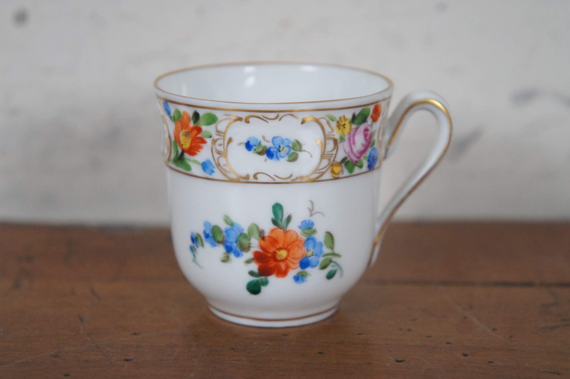 Antique lot includes creamer, demitasse cup, and two bone dishes by Dresden, one demitasse cup by Meissen, and one candlestick by Klemm.