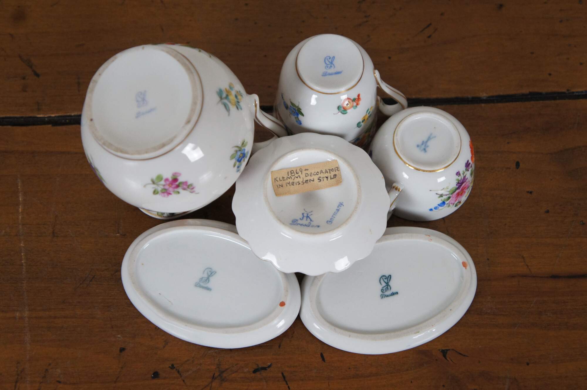 "Karl Richard Klemm founded a porcelain decorating studio in Striesen bei Dresden in 1869. The porcelain was obtained primarily from the Meissen factory itself, much of it being seconds. The decorating style of Richard Klemm closely matched that of the Meissen factories at that time. He often used a heavily applied style that focused on florals. In many instances, the porcelain pieces of Richard Klemm are emblazoned with a gold leaf at the base. This gold leaf was used to hide the marks made by the original manufacturer of the blanks that he used for decorating. Richard Klemm, along with Helena Wolfsohn, Karl Thiem, Ambrosius Lamm and Donath & Co., were among the most sought after porcelain decorating studios at this time. In the early 1880's Richard Klemm registered his mark, the "Klemm Dresden Crown", as design No 24, at the Reichs-Warenzeichenregister, or RWZR, which was the central office for registering of all porcelain trade names and marks. He merged his company with the studio of Donath & Co. in 1916. However the merged companies were subsequently purchased in 1918 by Hutschenreuther.