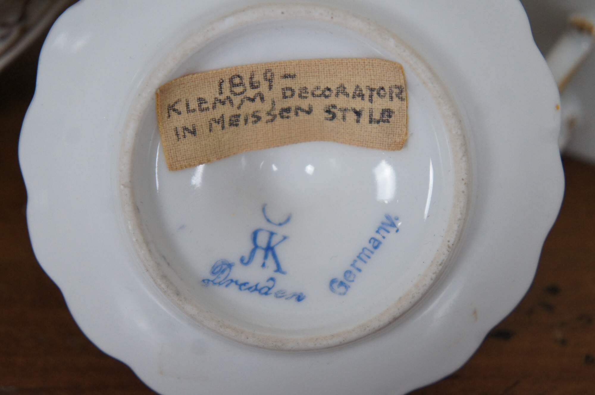 “The Sächsische Porzellan-Manufaktur Dresden GmbH (Saxon Porcelain Manufactory in Dresden Ltd), generally known in English as Dresden Porcelain, is a German company for the production of decorative and luxury porcelain. Founded in1872, it is located in Potschappel, a suburb of the town of Freital in the Sächsische Schweiz-Osterzgebirge district about 8 km (5 mi) southwest of Dresden, the capital of Saxony. Dresden Porcelain introduced its blue "SP Dresden" trademark in 1902.”