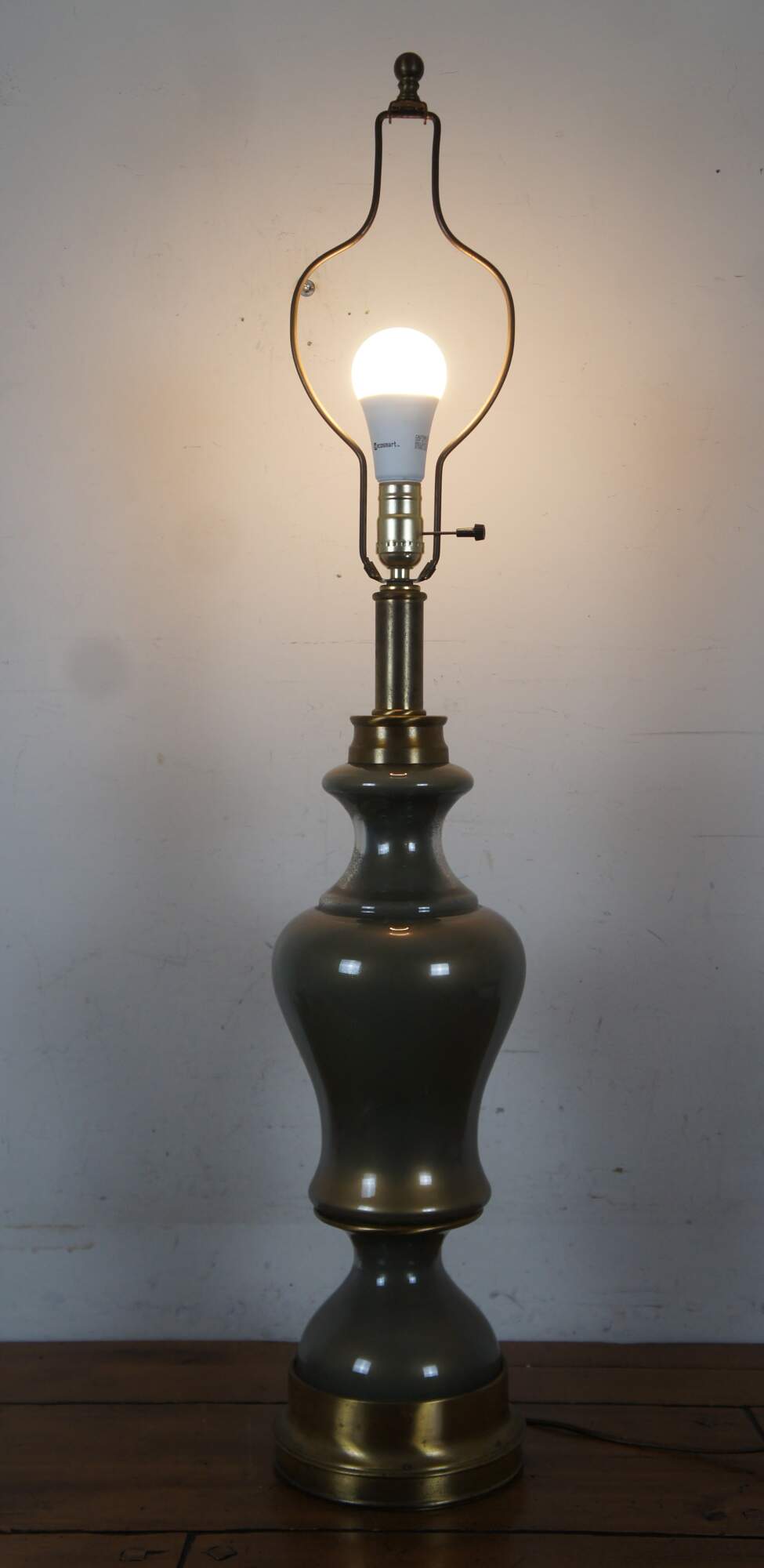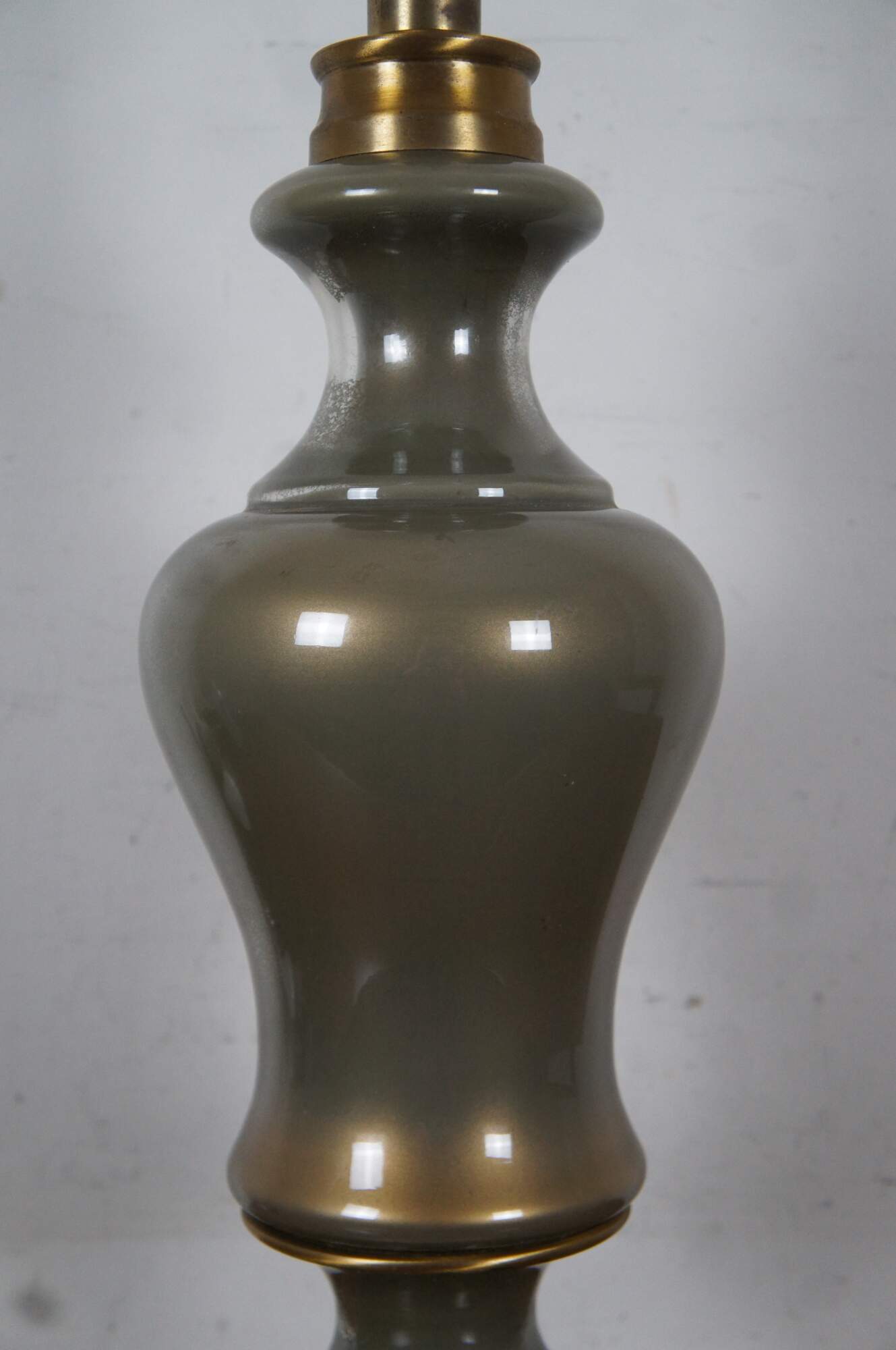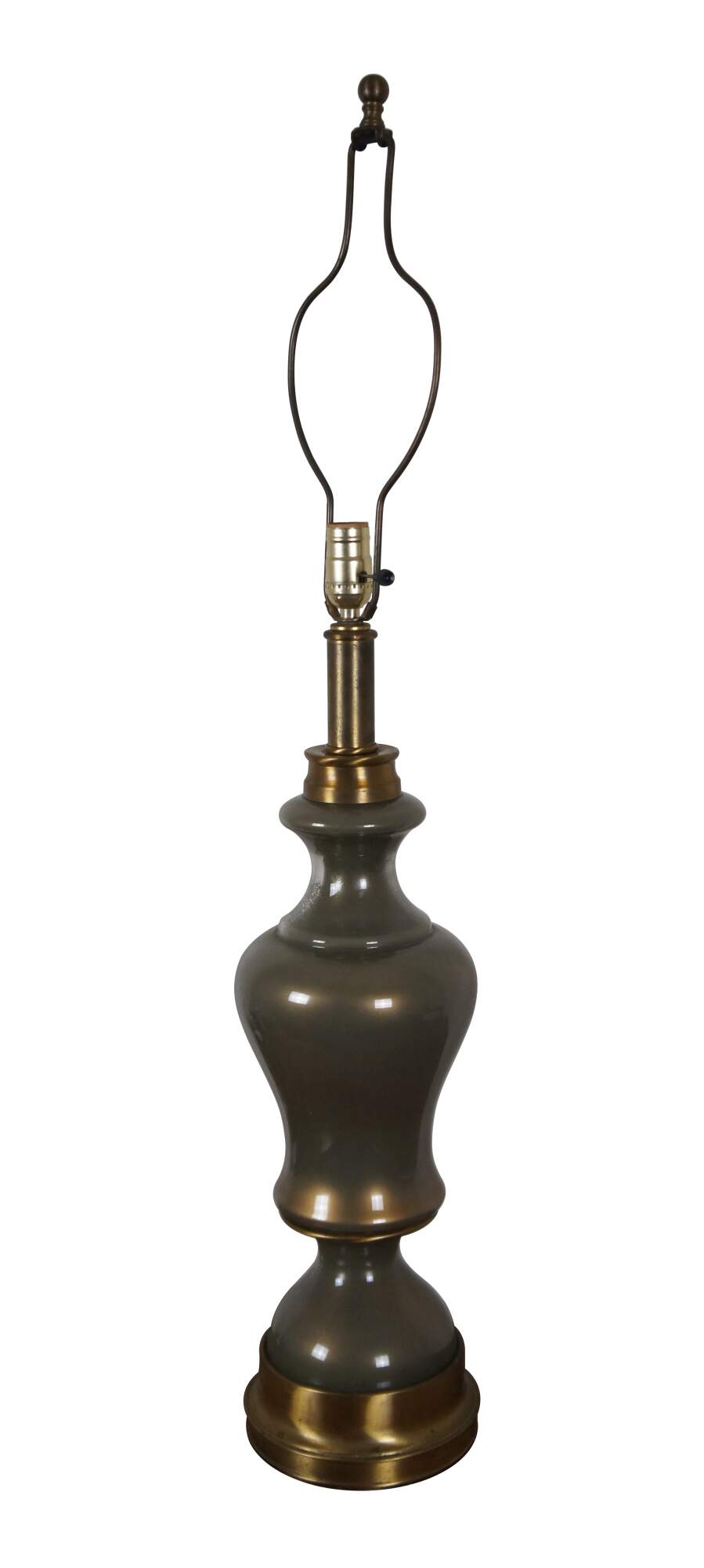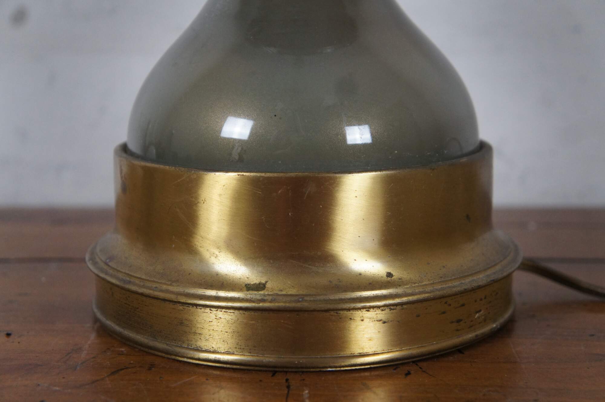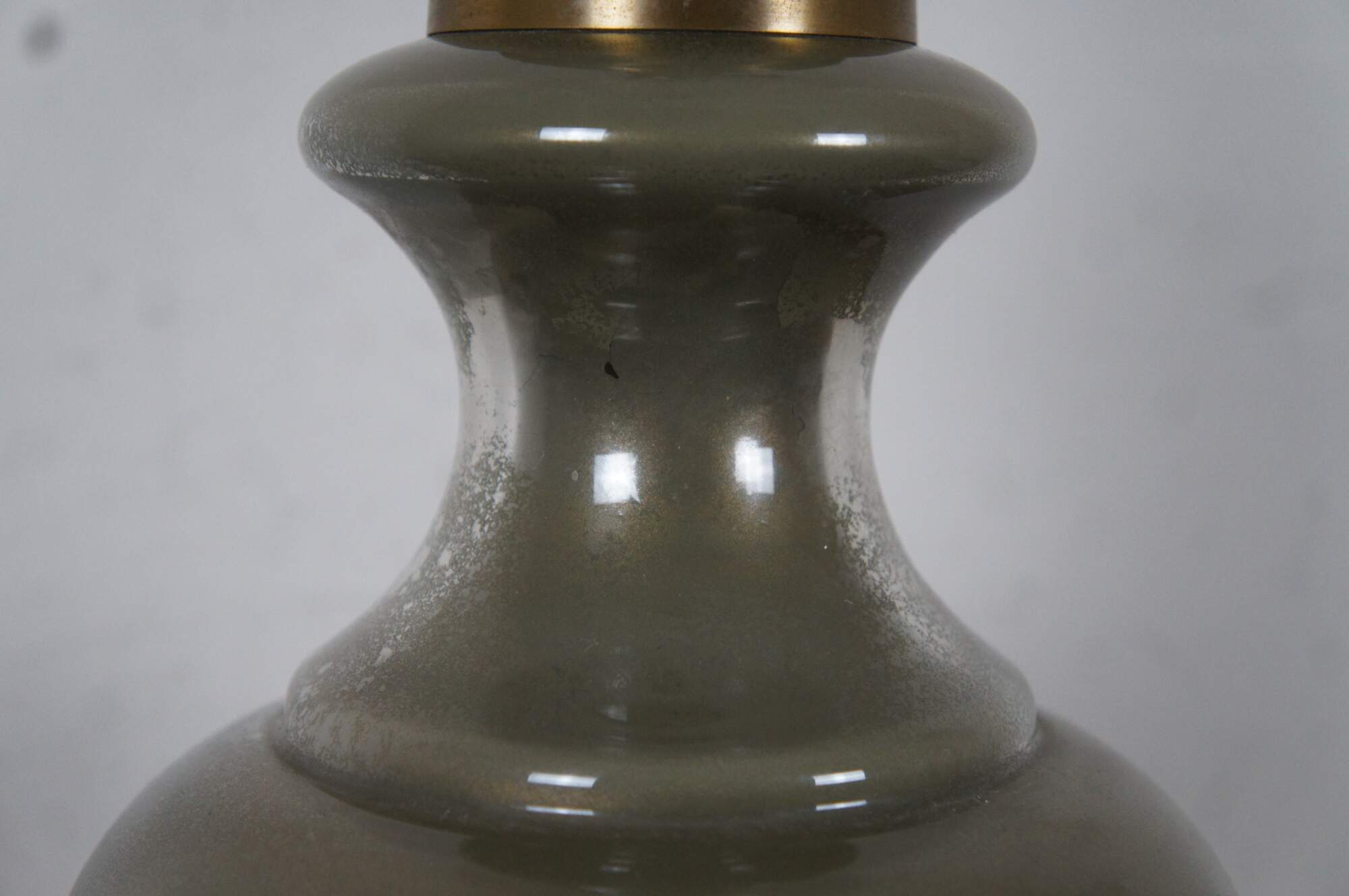 Vintage Hollywood Regency style glass and brass table lamp featuring round serpentine form.