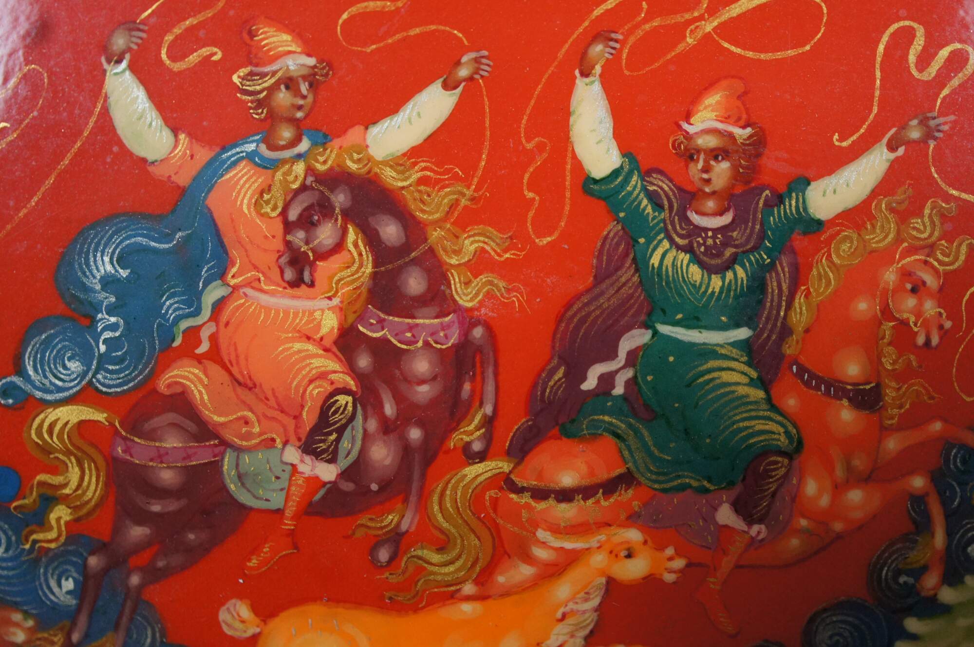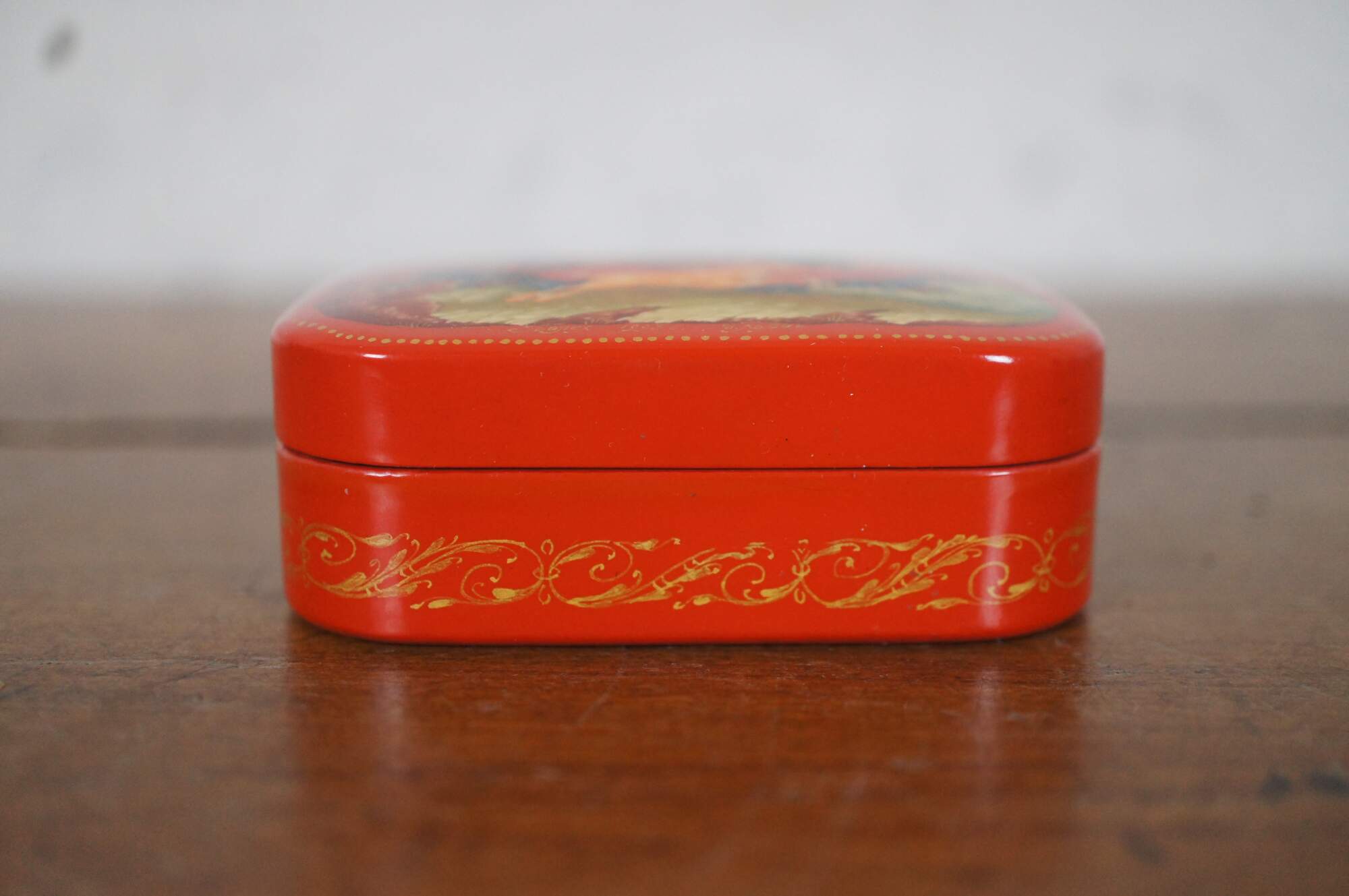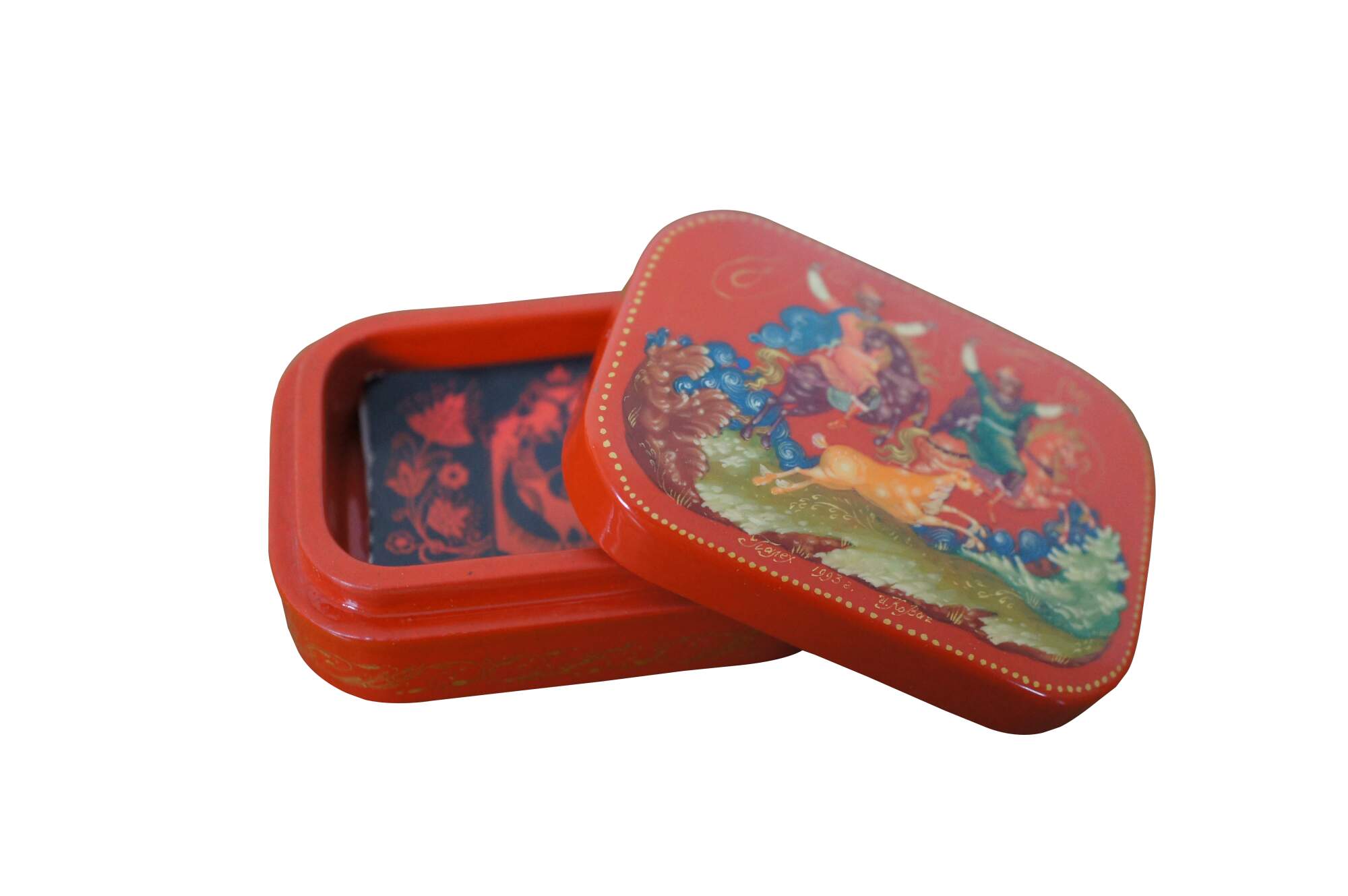 Vintage USSR Russian hunt / equestrian theme folklore / fairy tale keepake trinket box featuring red lacquer with landscape scene of two men riding horses along side a deer / animal.