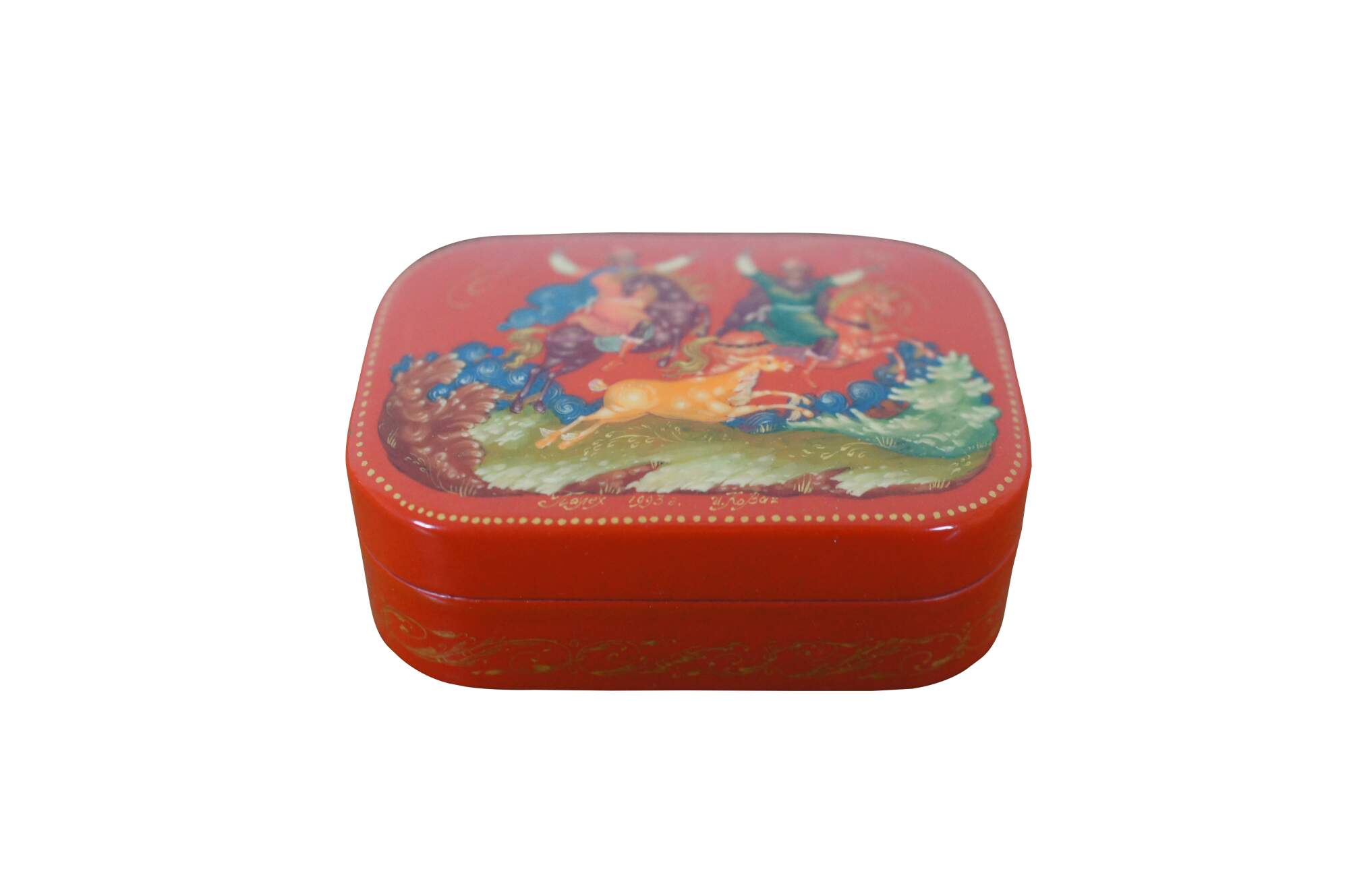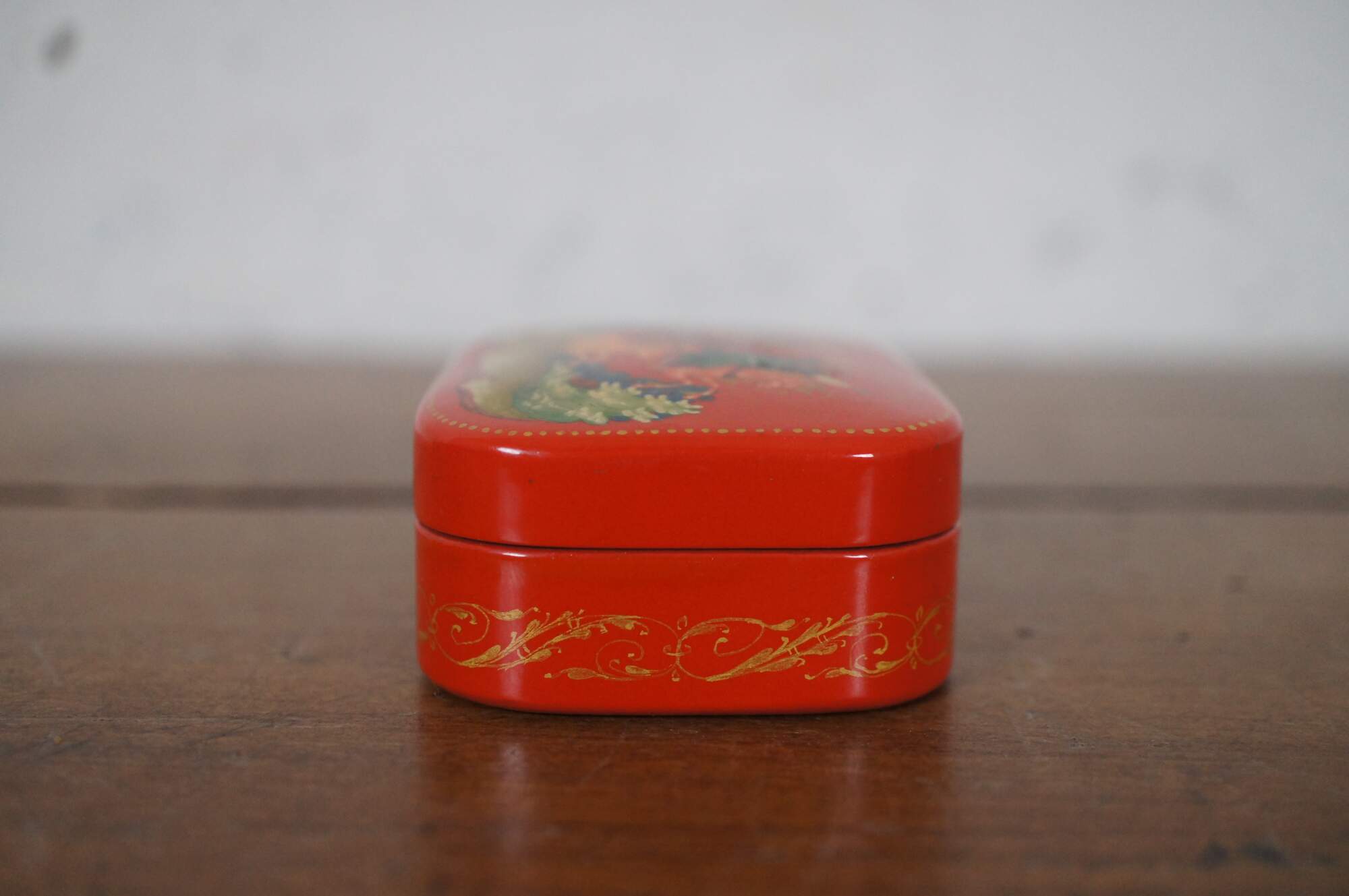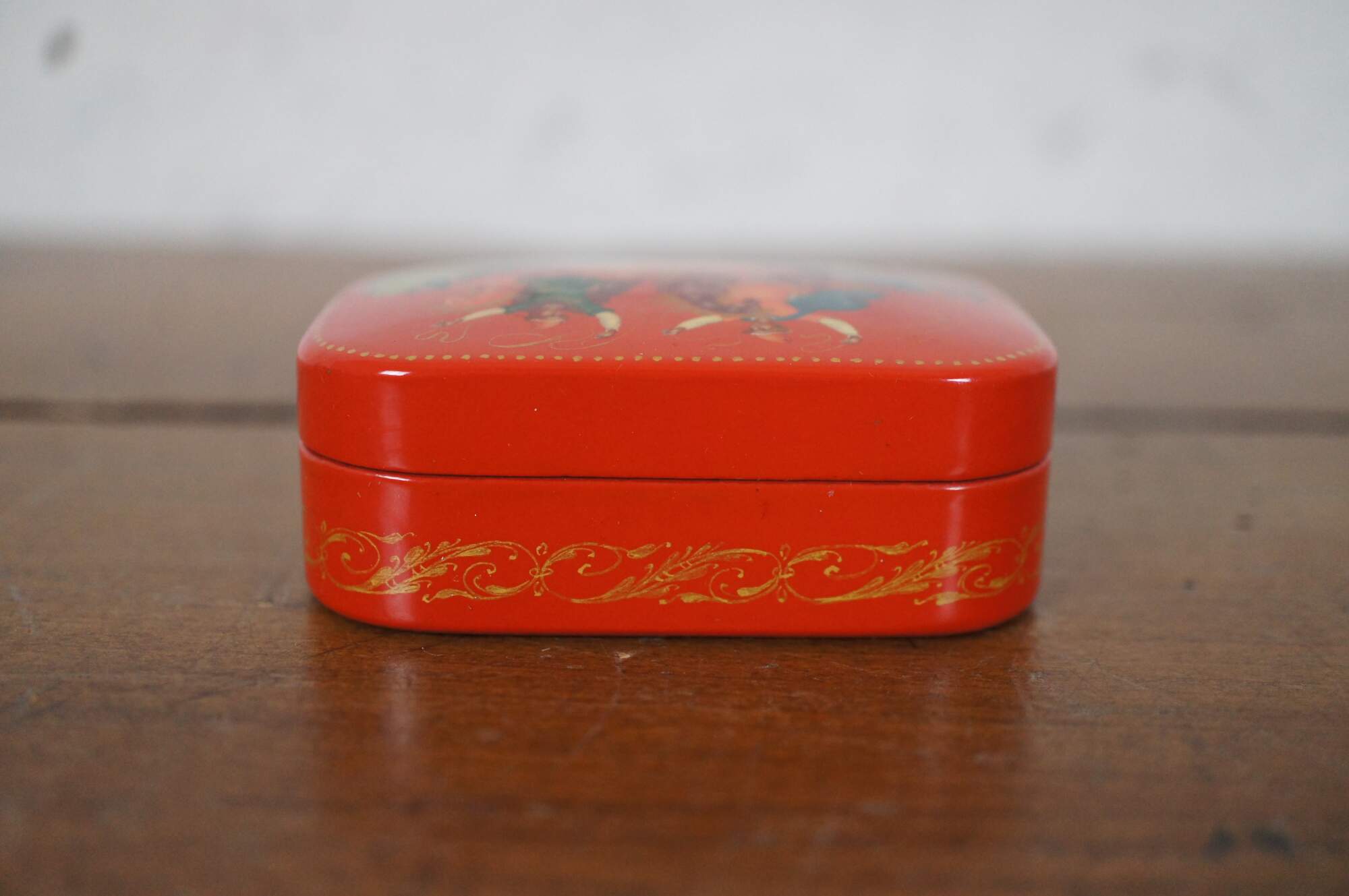 Vintage USSR Russian hunt / equestrian theme folklore / fairy tale keepake trinket box featuring red lacquer with landscape scene of two men riding horses along side a deer / animal.