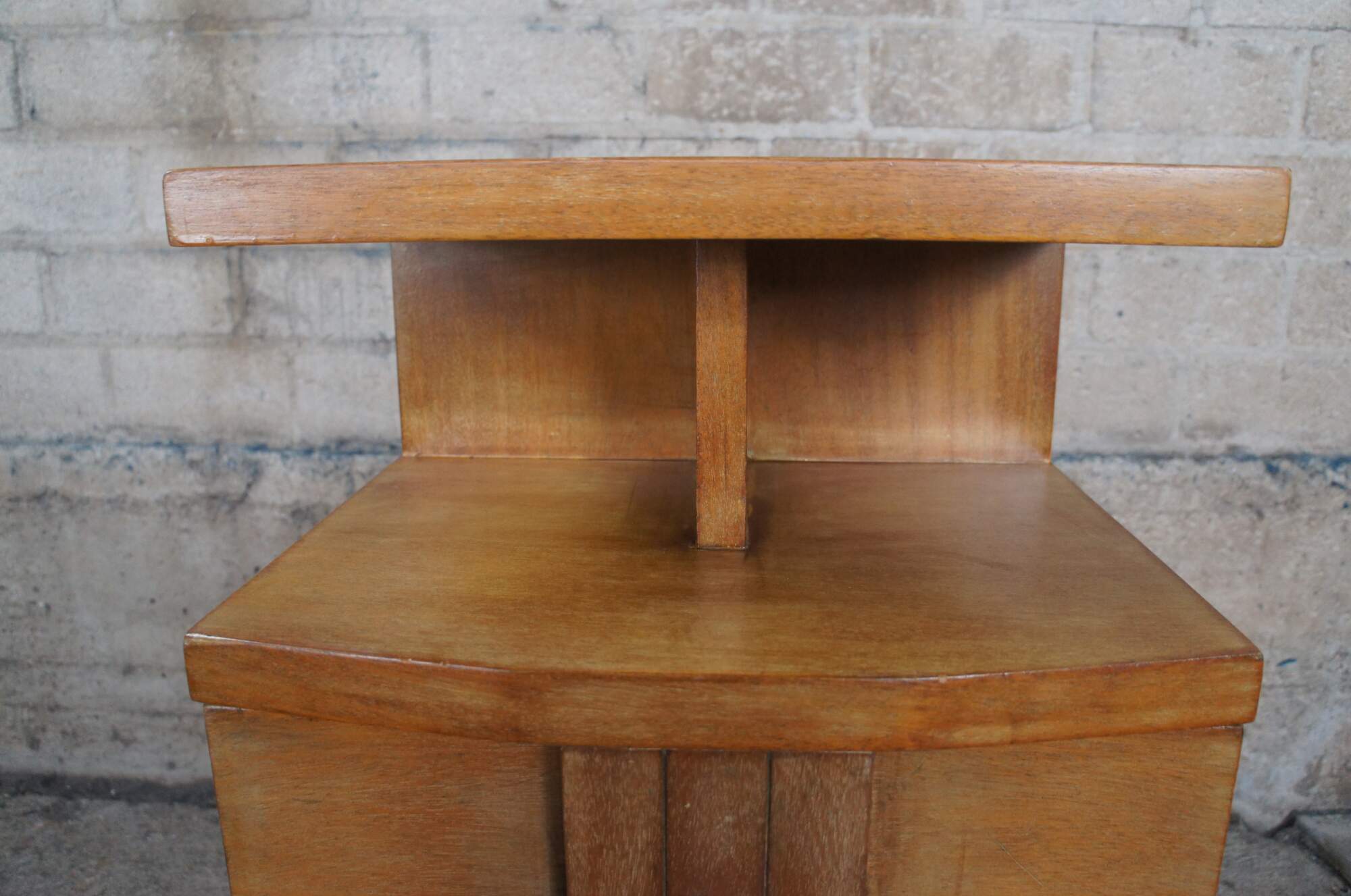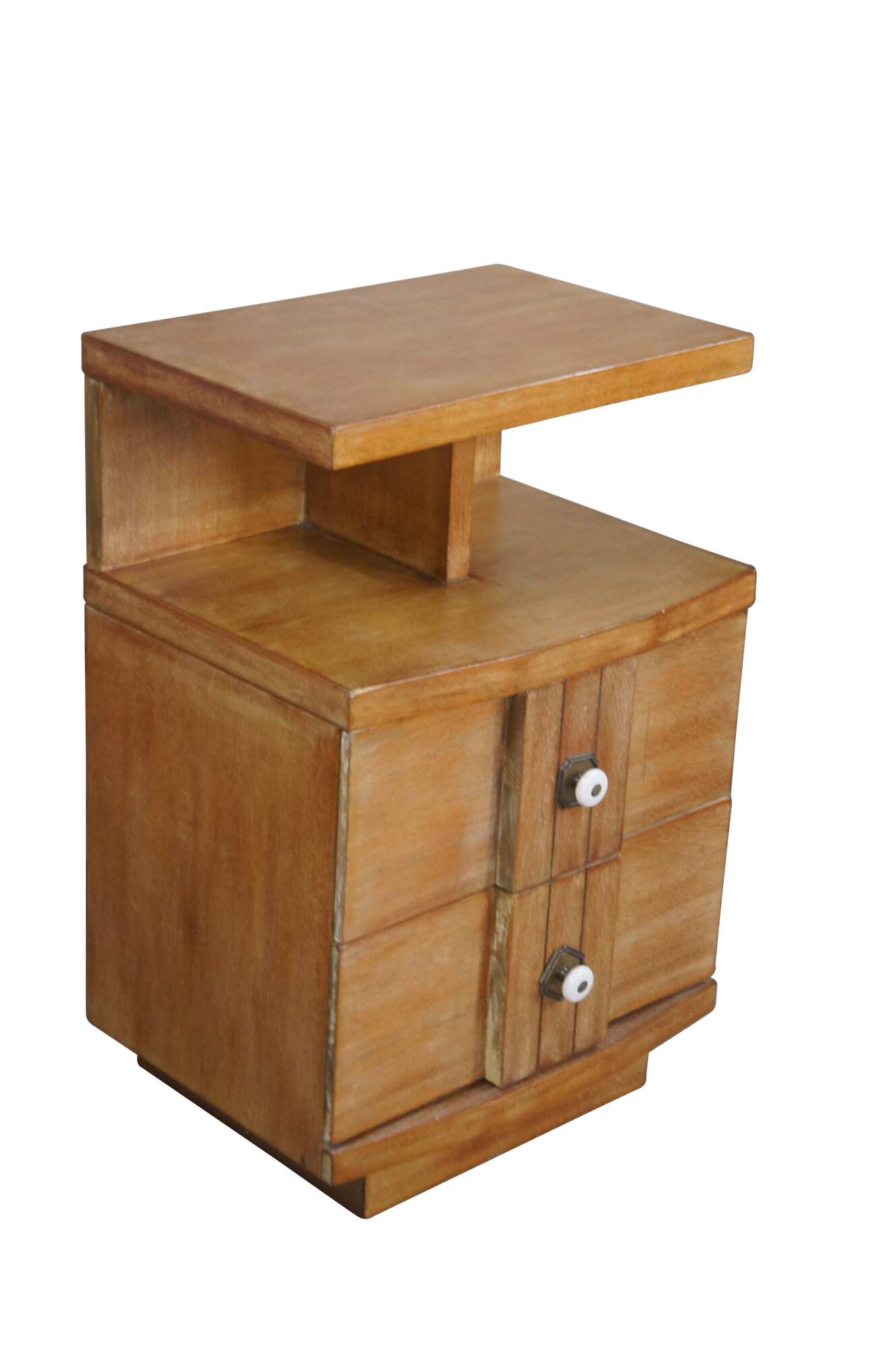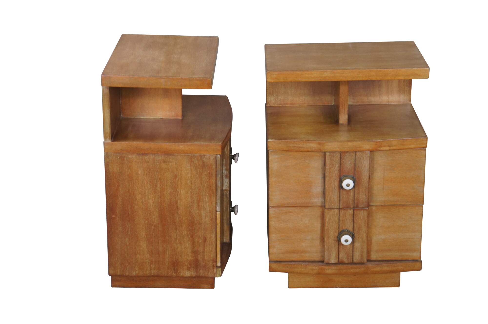 Pair of Kent Coffey end tables, circa second half 20th century. Made from oak with two dovetailed drawers and a lower divided cubby shelf. The Titan line was manufactured in the 1970s.