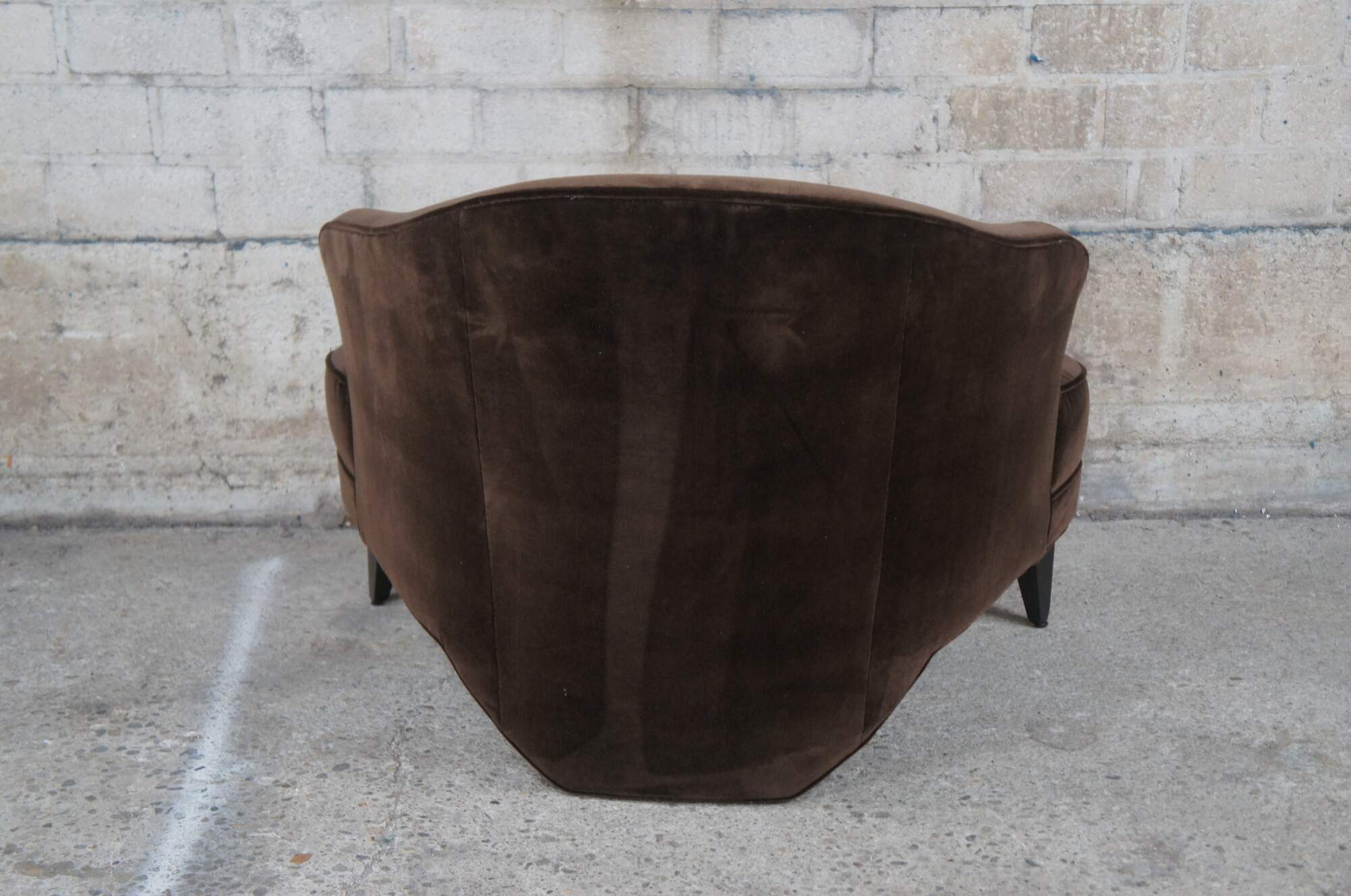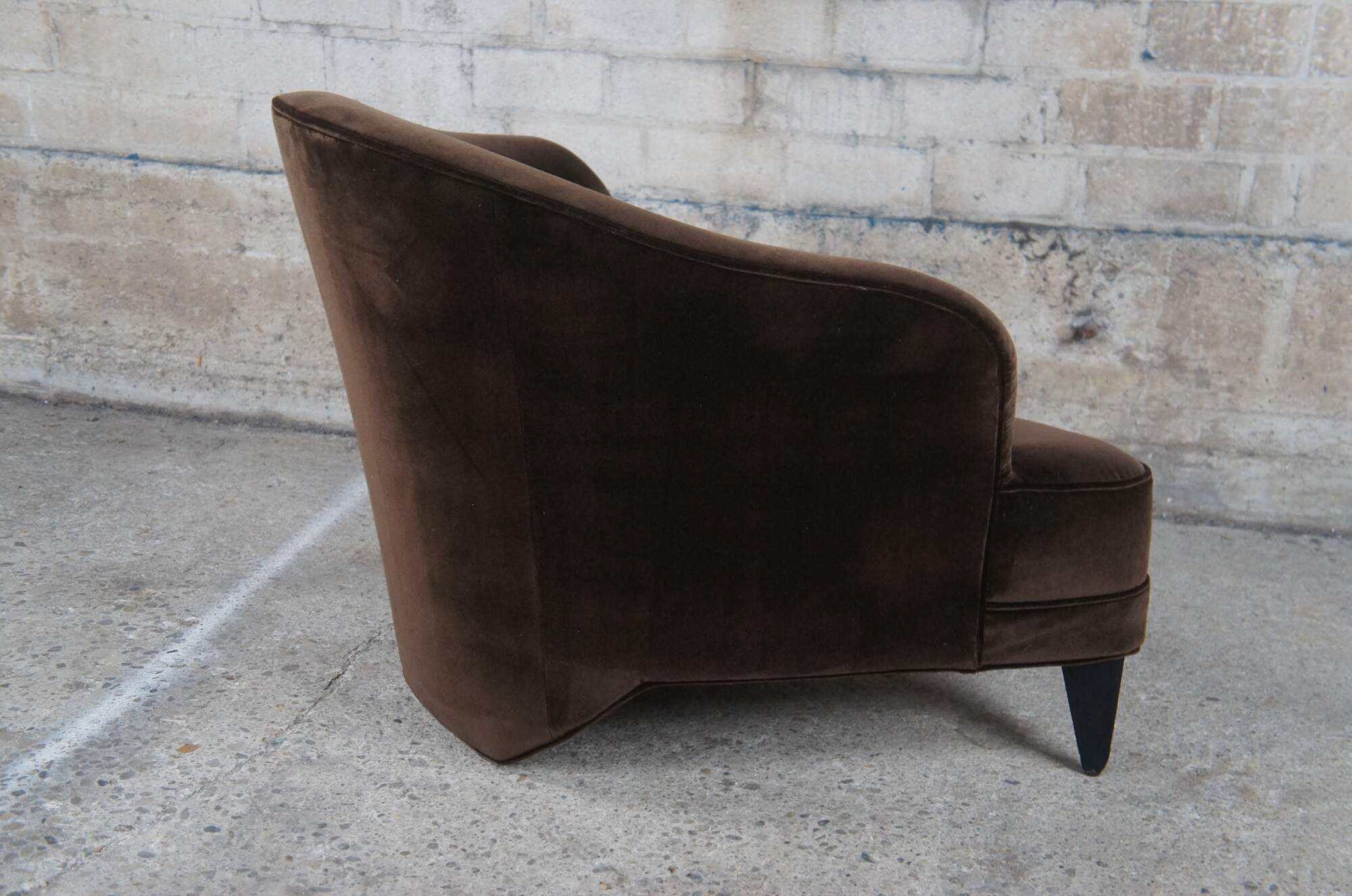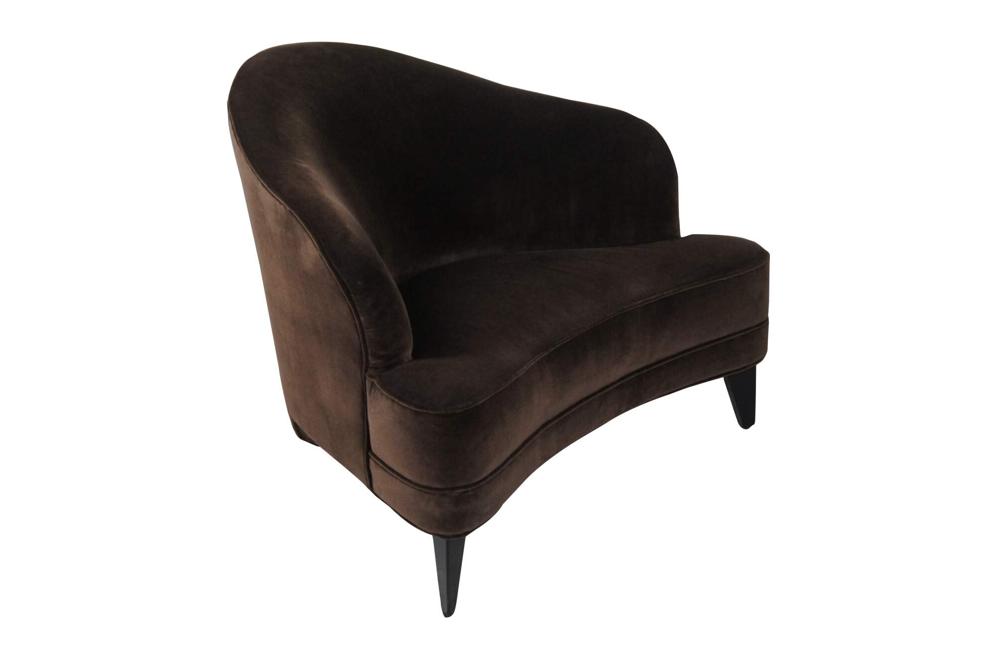 A pair of chocolate mohair chairs by Leon Rosen for Pace. Features a unique triangular form with downswept arms and a plush seat. Each chair is supported by black tapered feet. The set was recently recovered in the brown mohair.