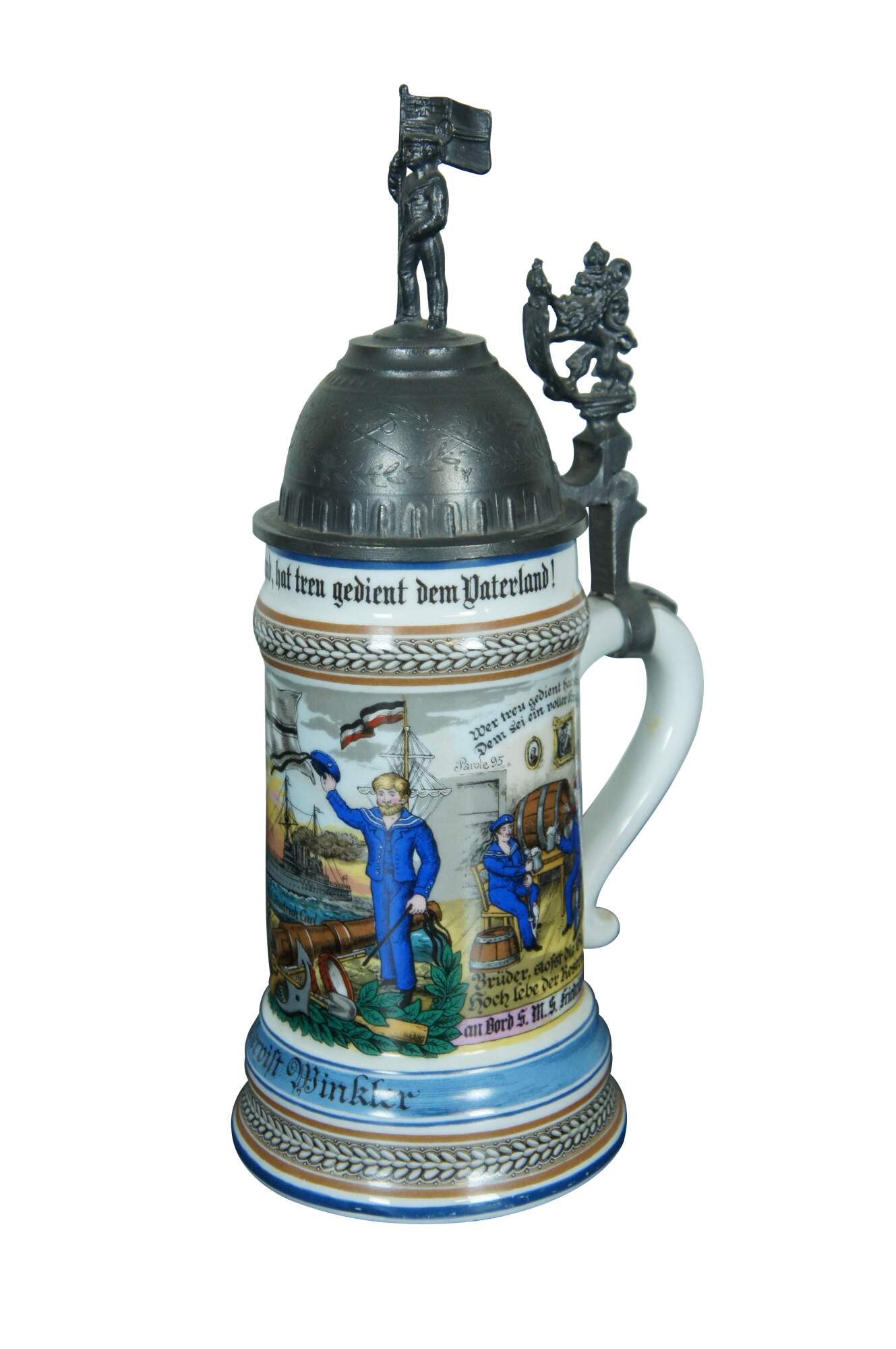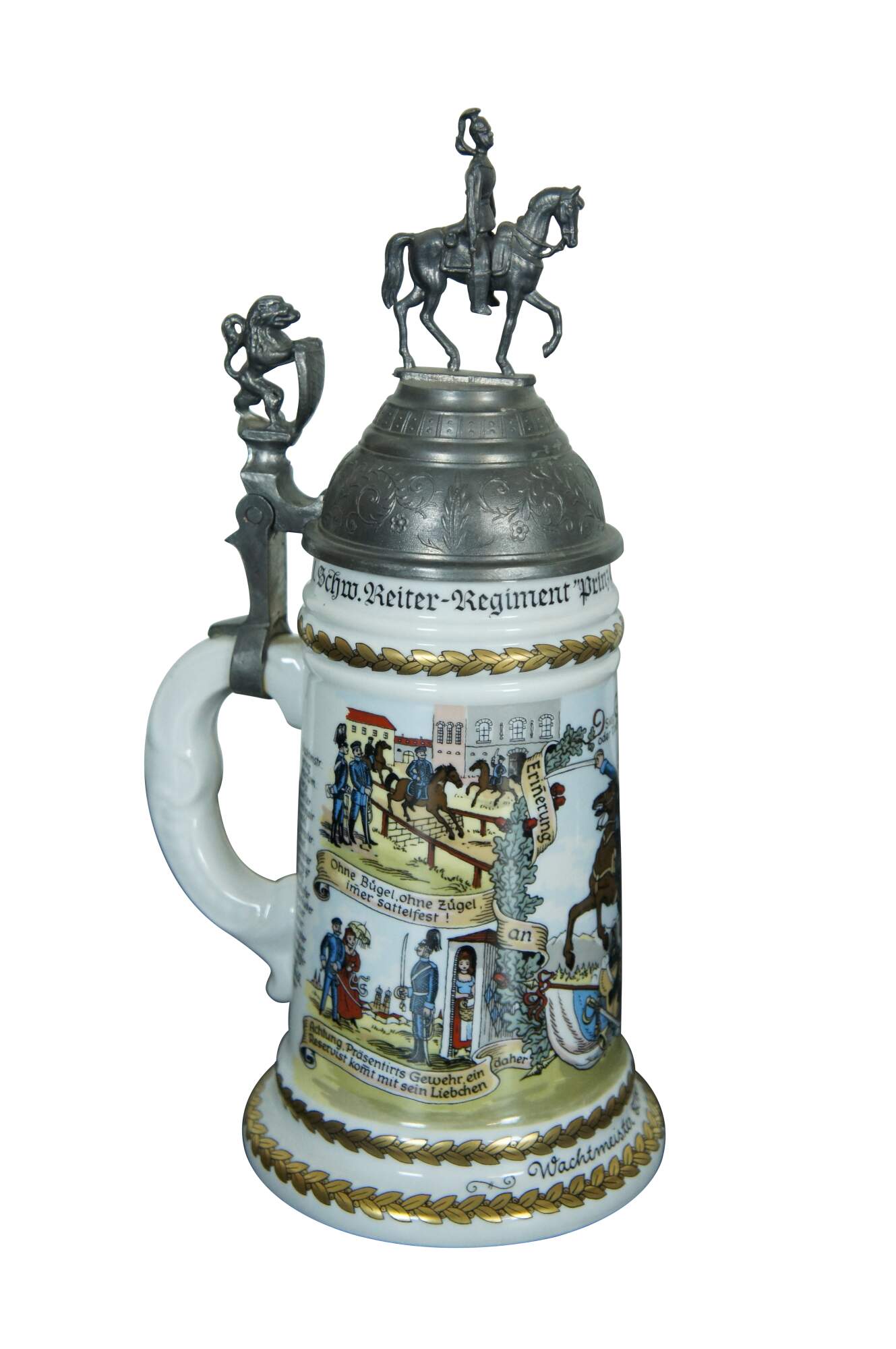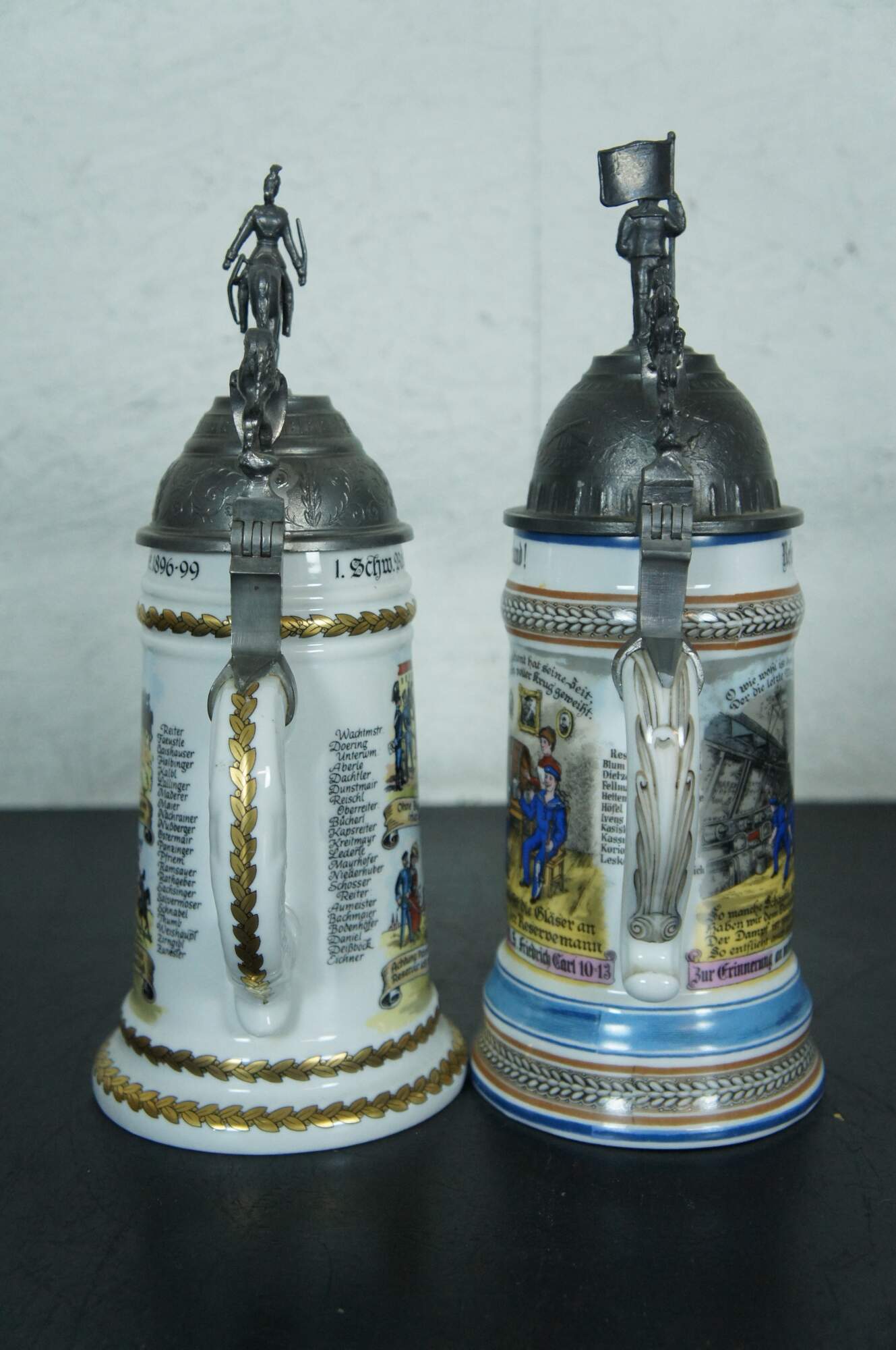 An impressive pair of German military lithopane steins. Colorful with bold scenes and ornate figural lids.