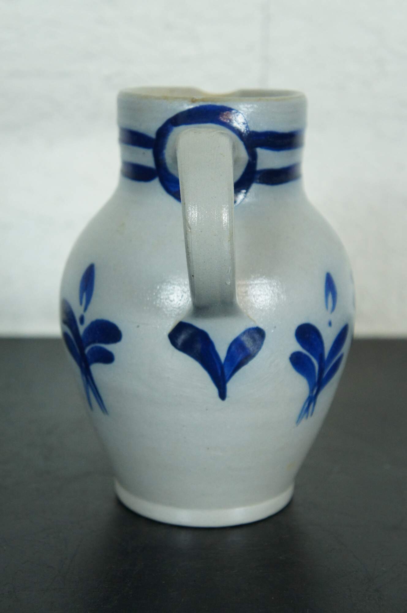 Vintage German 1 liter salt glaze stoneware pottery pitcher featuring an abstract floral swirl and ribbon design with banding around the neck. Hand made in Germany, Handarbeit.