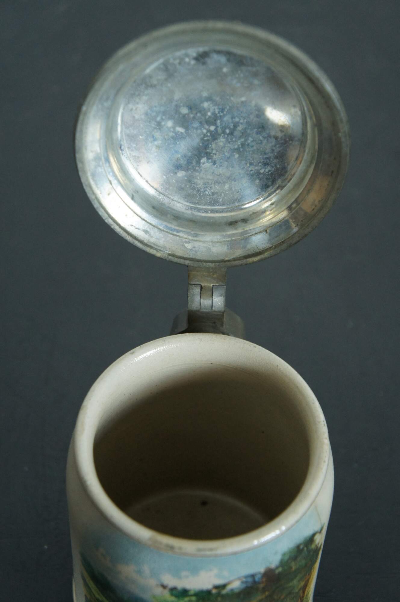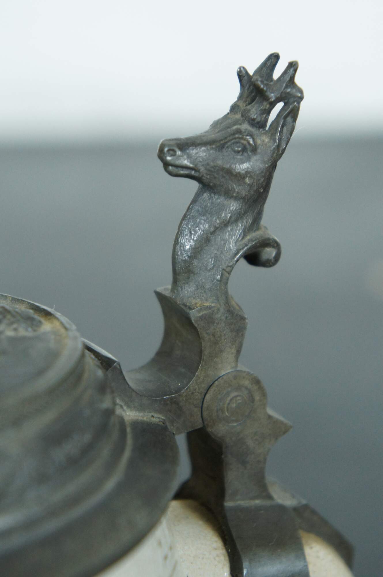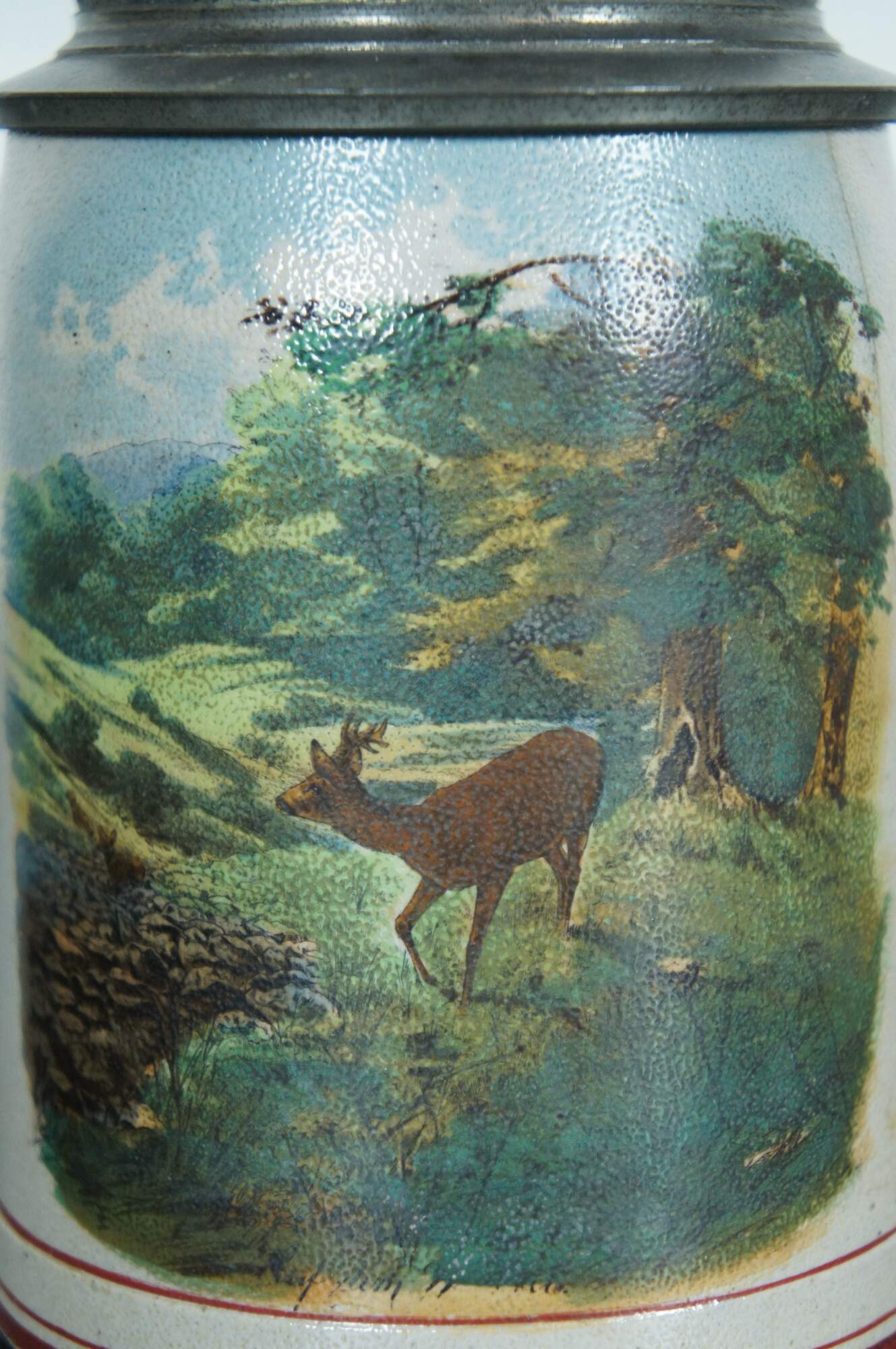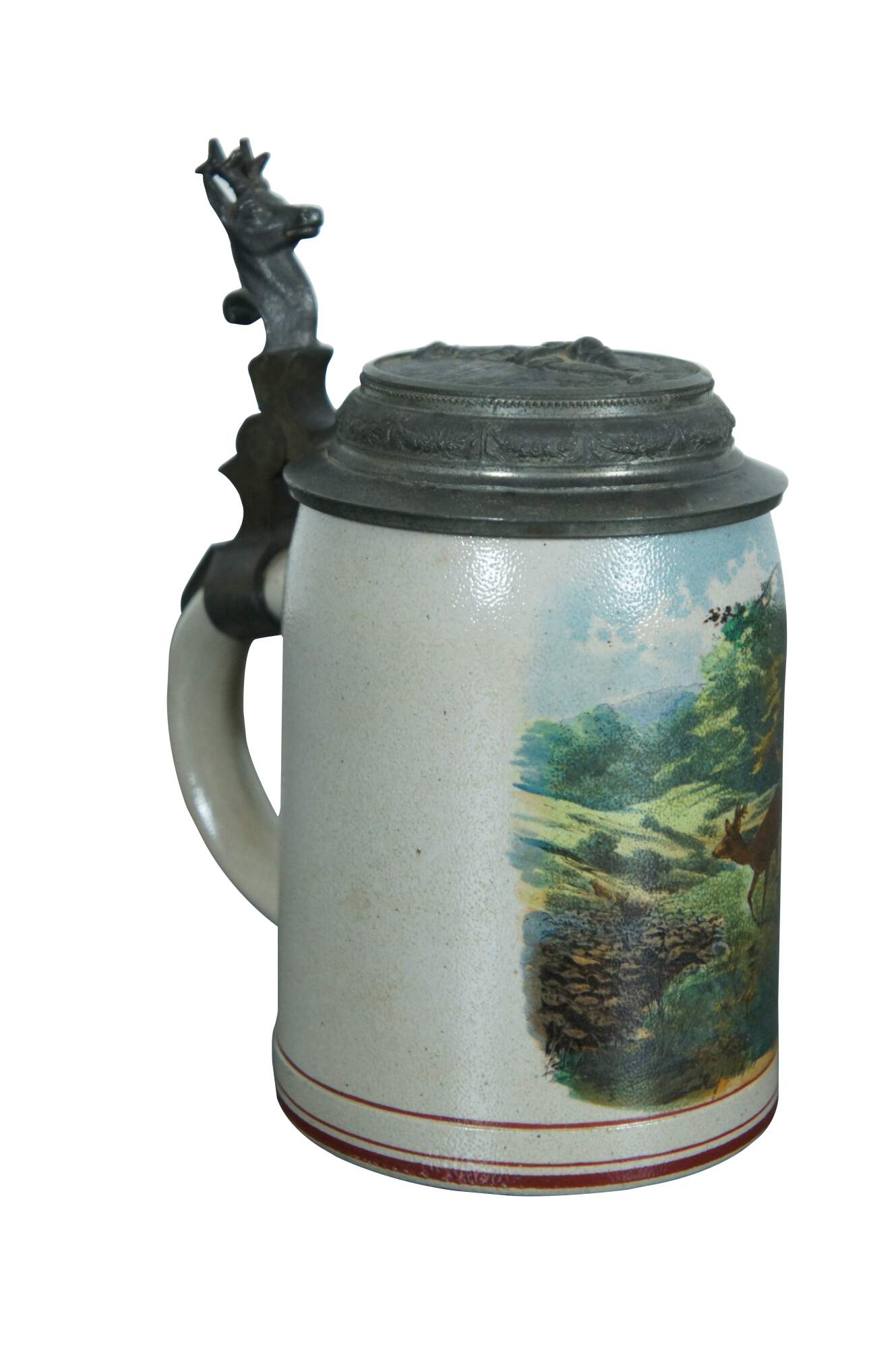 Antique German 1/2 Liter stoneware beer stein featuring a pewter lid with figural stag and landscape scene.