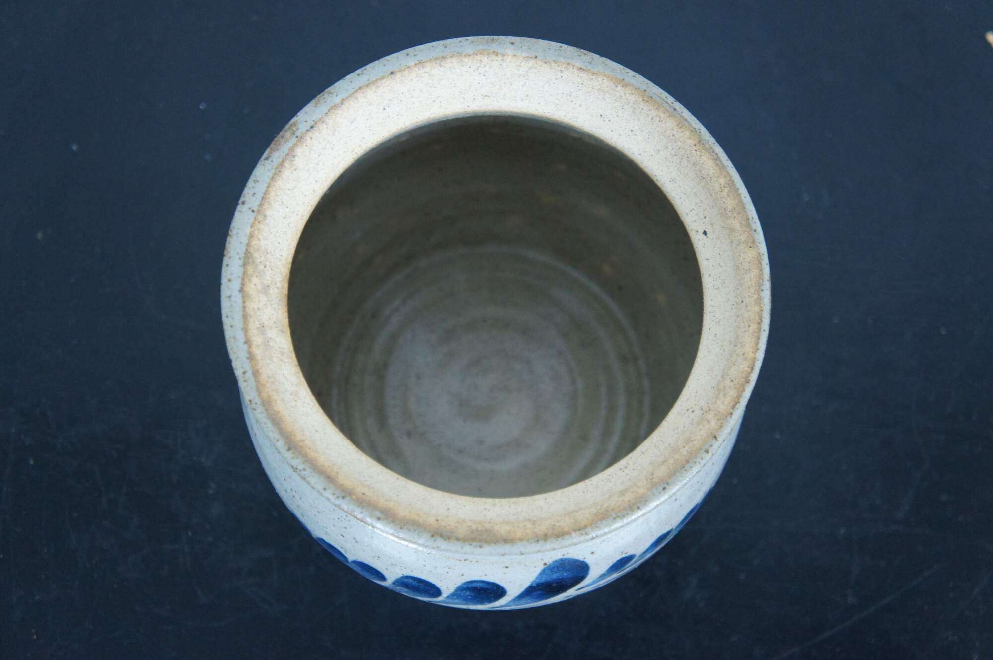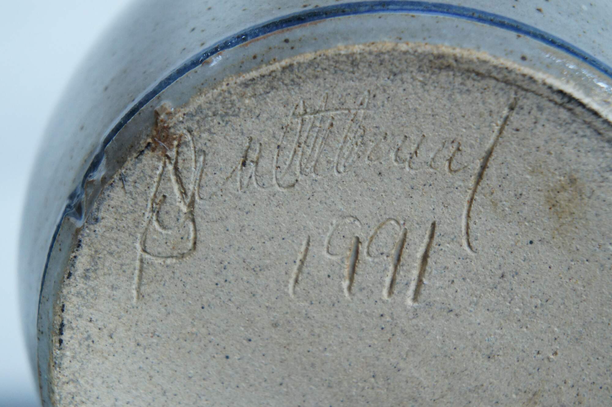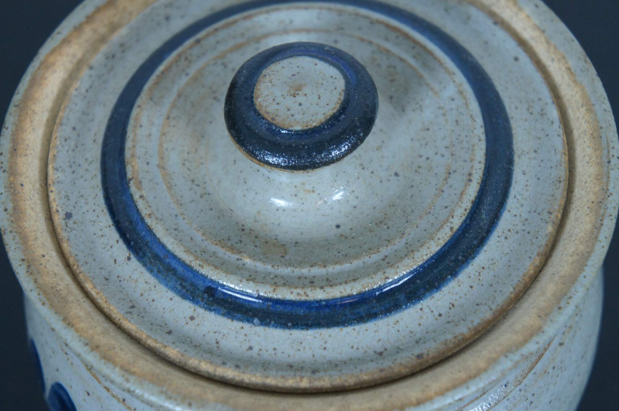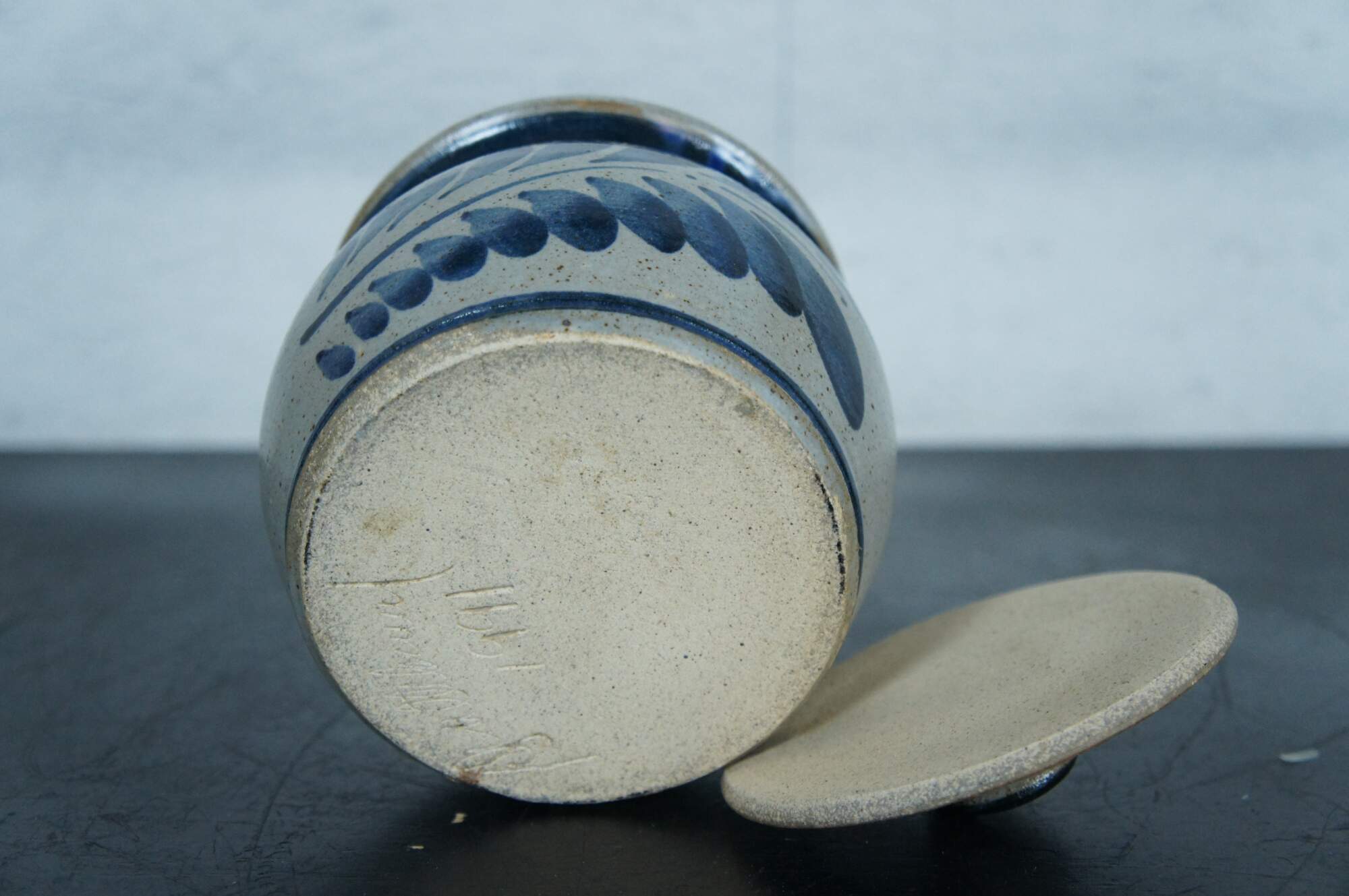 Vintage 1991 salt glaze stoneware crock or jar with lid. Signed on base.