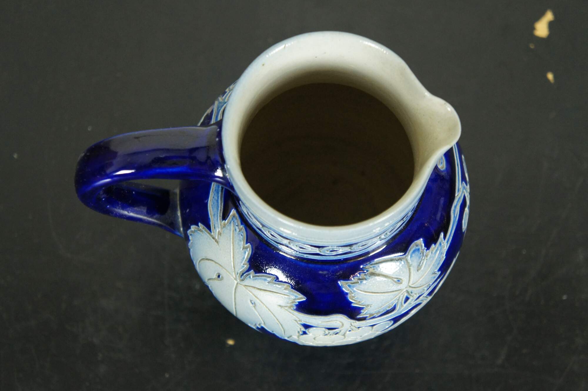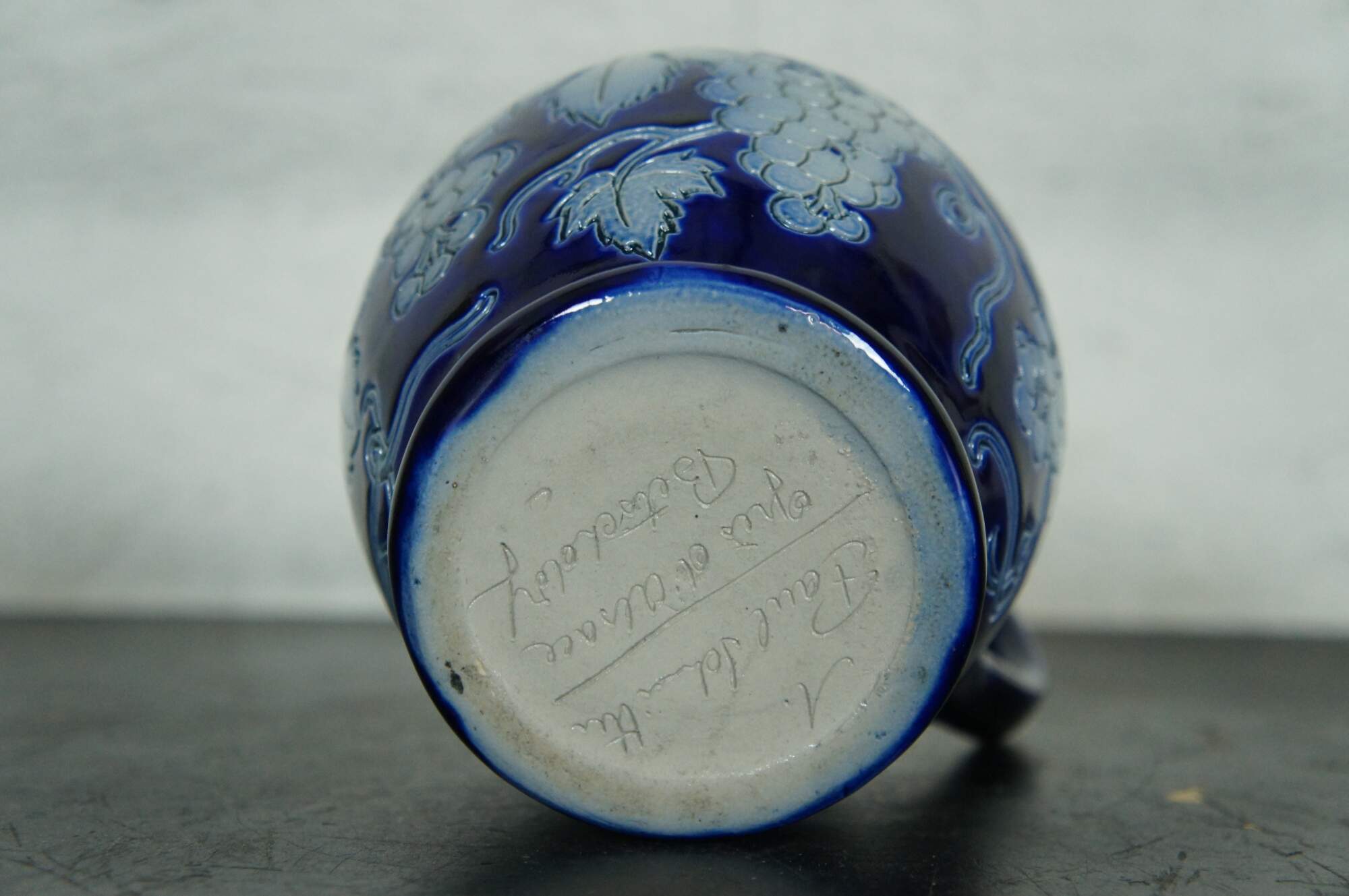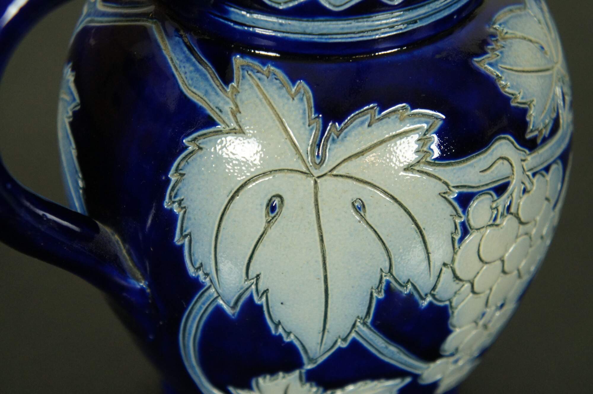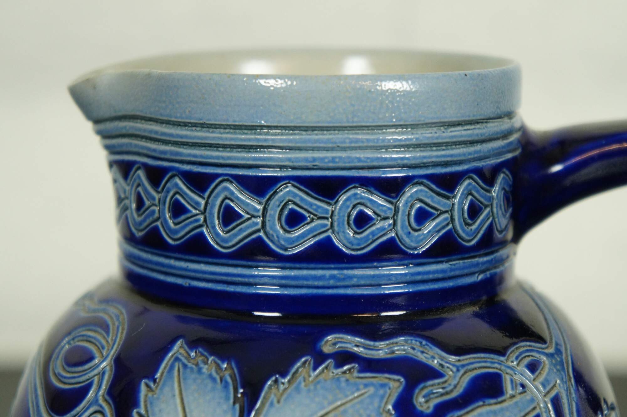 Betschdorf Alsace France Paul Schmitter stoneware / pottery creamer pitcher or wine jug featuring cobalt blue glaze with leaf and grape vine motif.